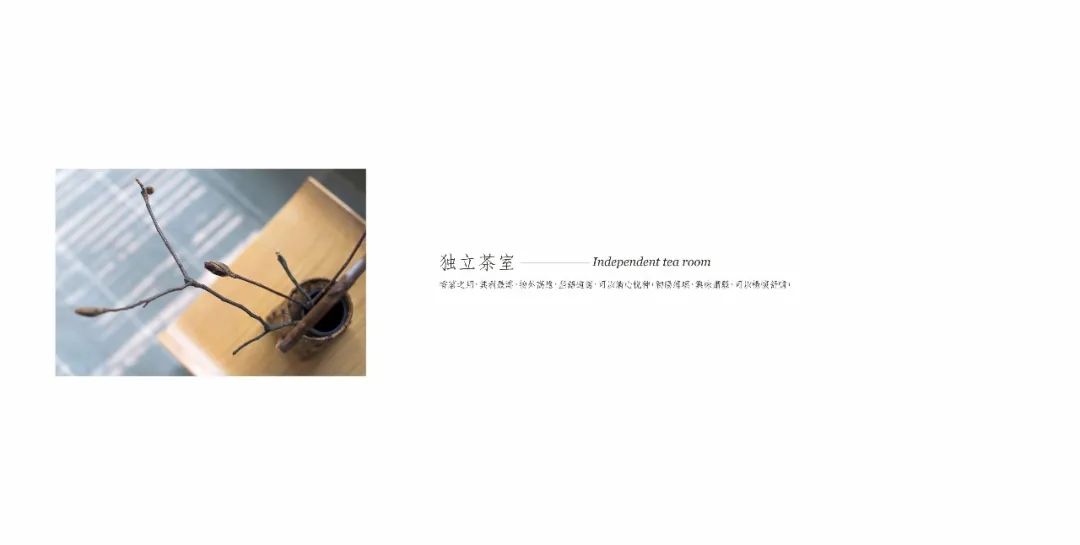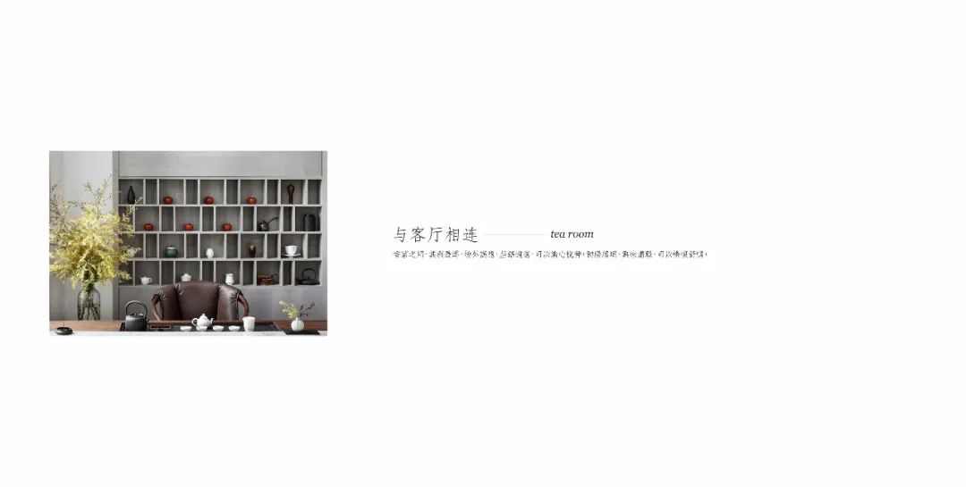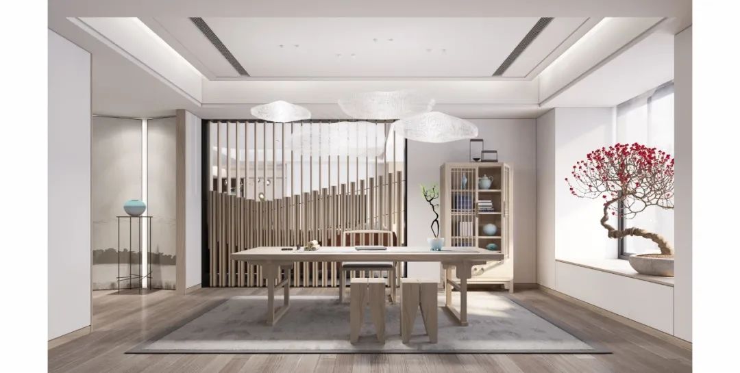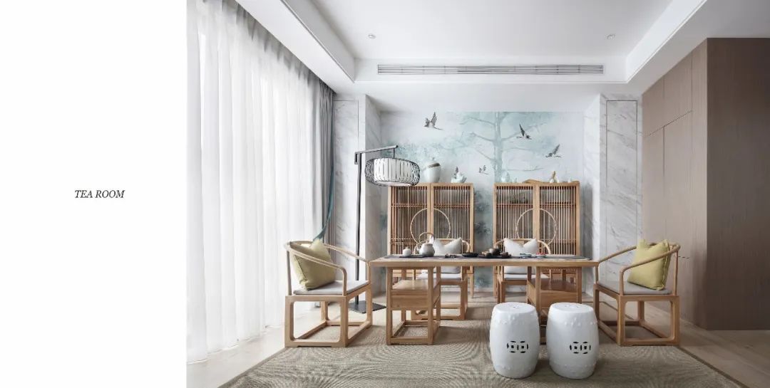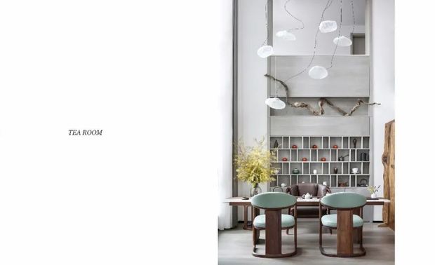 与客厅相连的茶室,主要考虑到空间的整体布局,更具休闲性与互动性。理想国茶室于挑高的空间中置入苍劲飘逸的崖柏与轻盈的云朵灯,给人一种空灵感。清麓茶室将中国古典画鸟画作的艺术墙纸融入茶室,于主调青色中,营造古典氤氲的氛围。