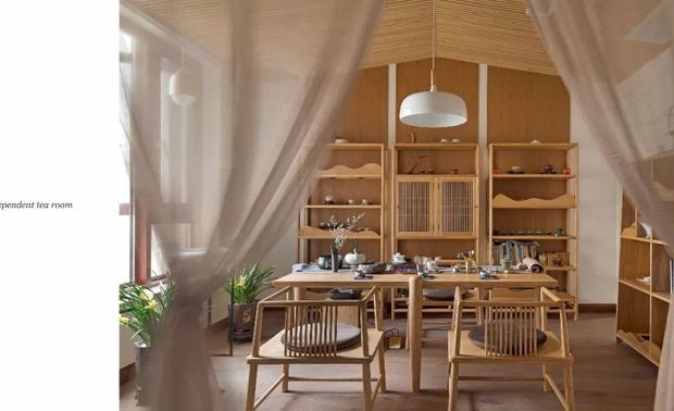 偏安一隅,颇有“躲进小楼成一统”的意味。茶室温润的古雅风度浸润着古典东方美学的韵味。