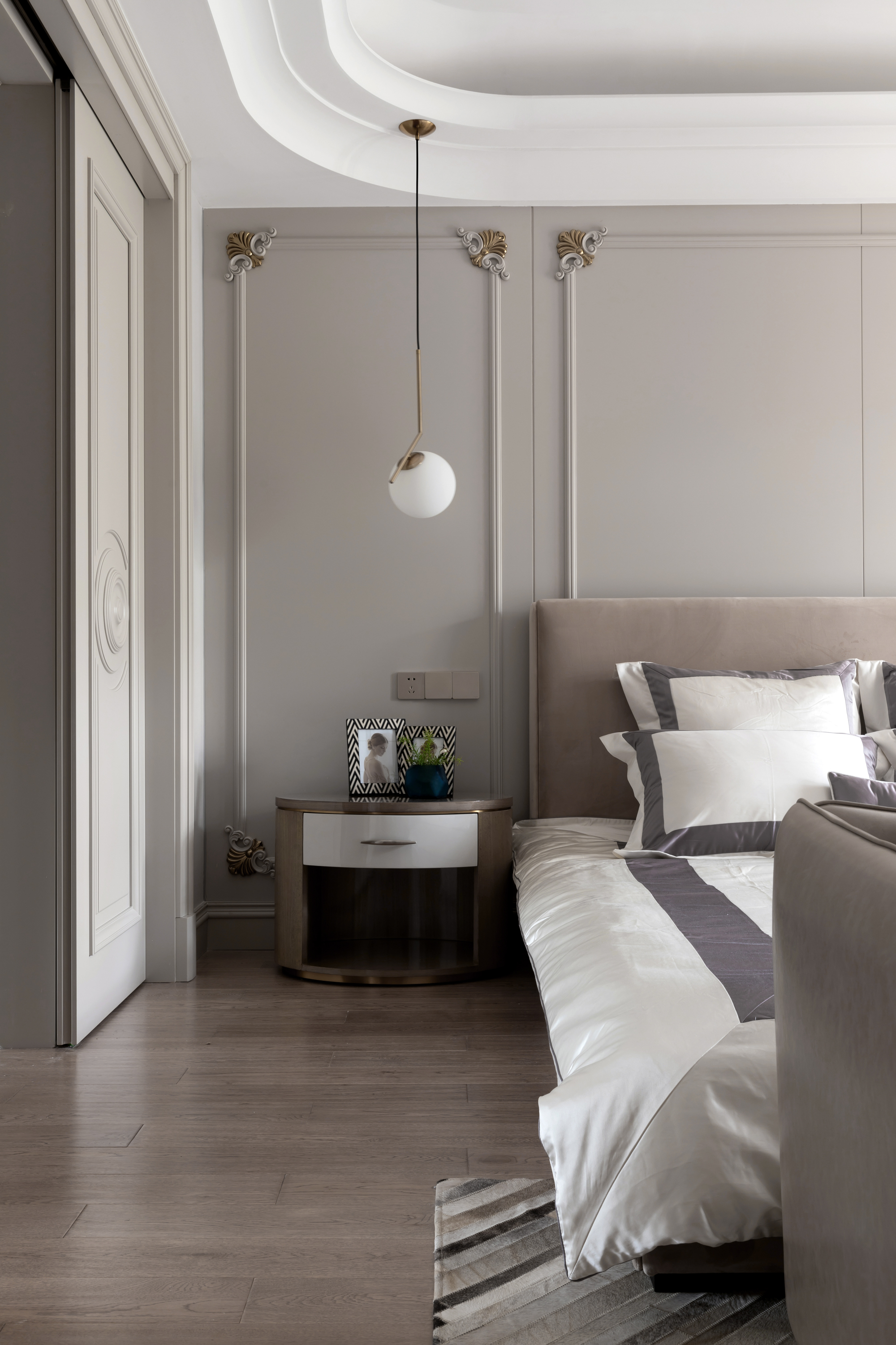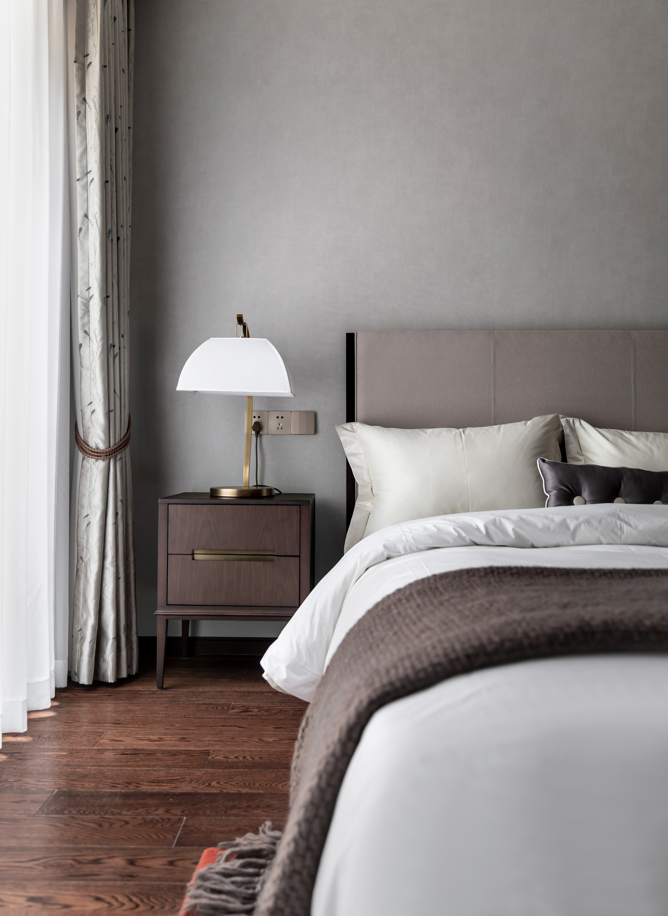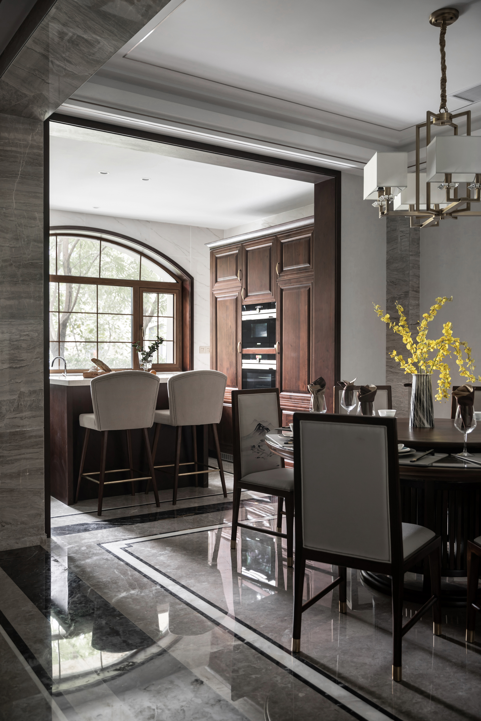 设计选材:在整个效果呈现中,胡桃木饰面成了空间的主角,深色调子可以很好地将中式风格的内敛、含蓄沉淀下来,再加上色泽柔和的墙身、墙纸、高光混油木作和不锈钢金属的独特造型,不仅使空间具有亲和力且令视觉的到层次感。