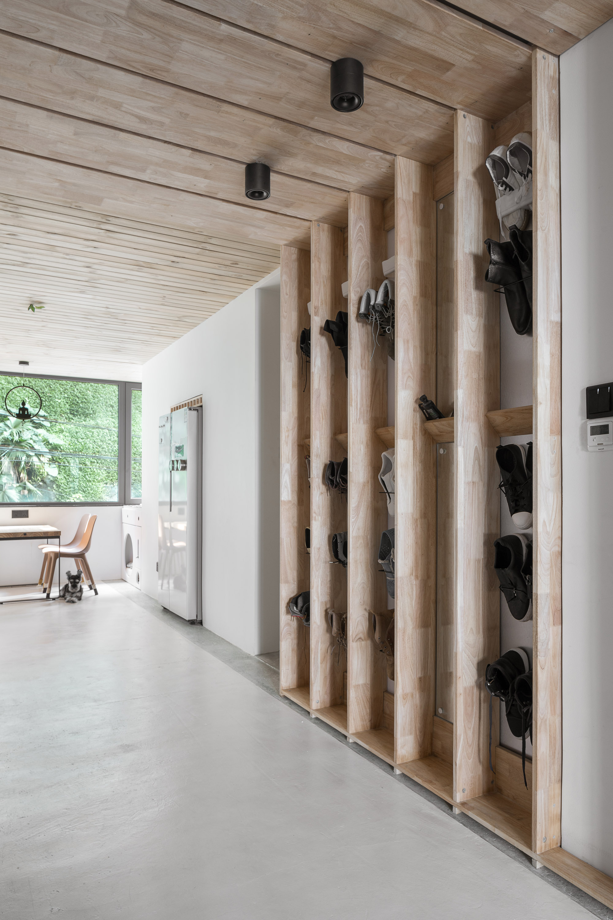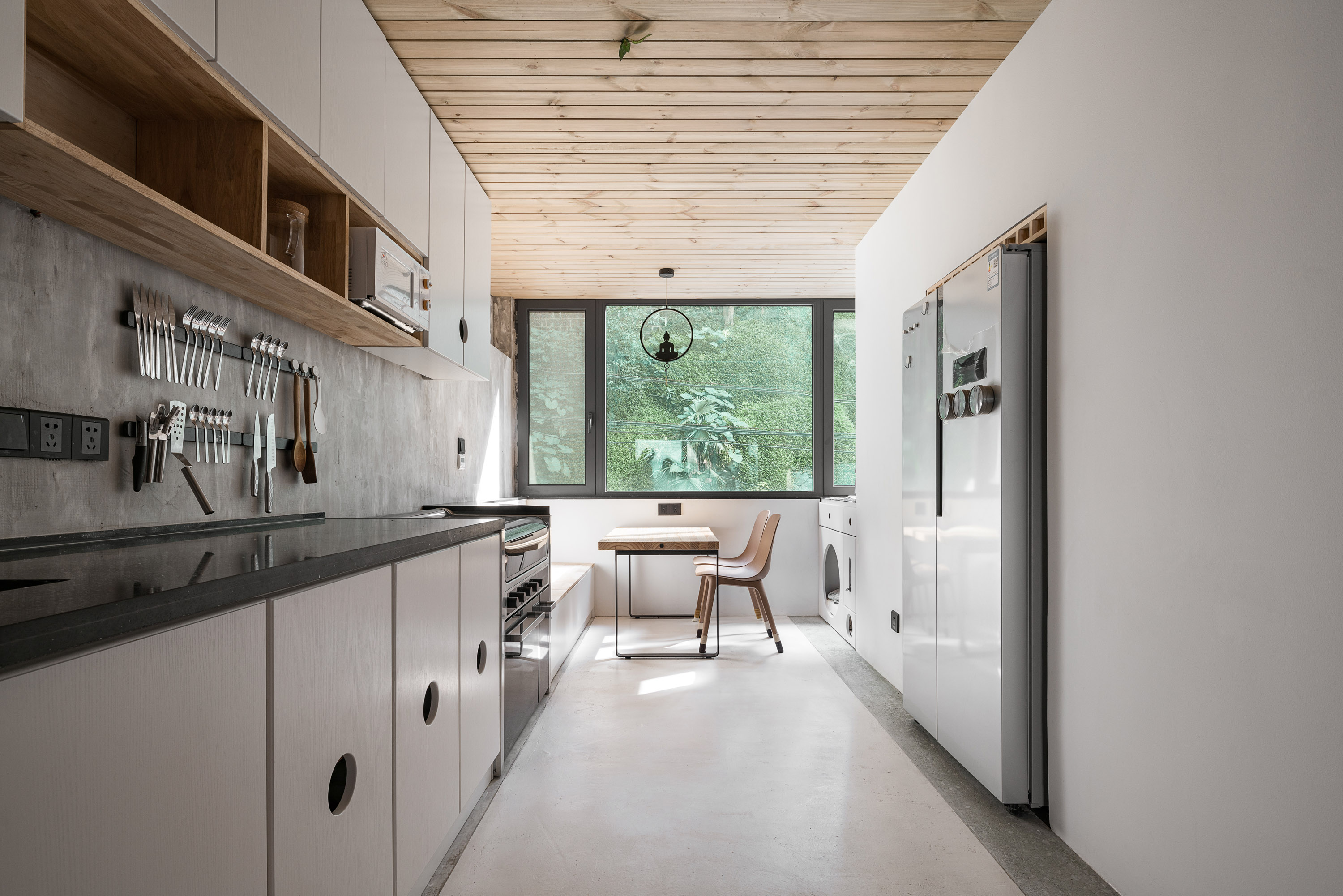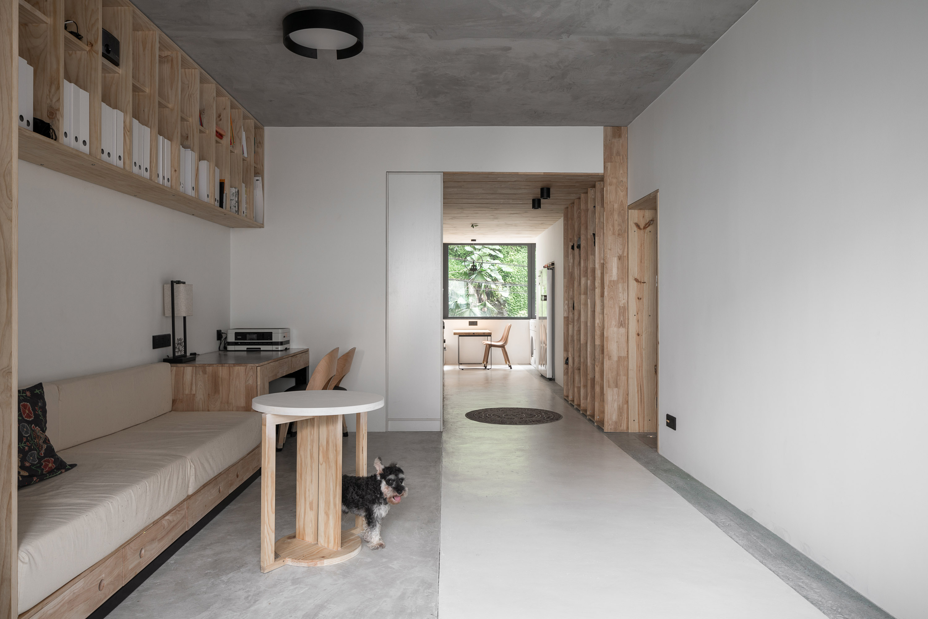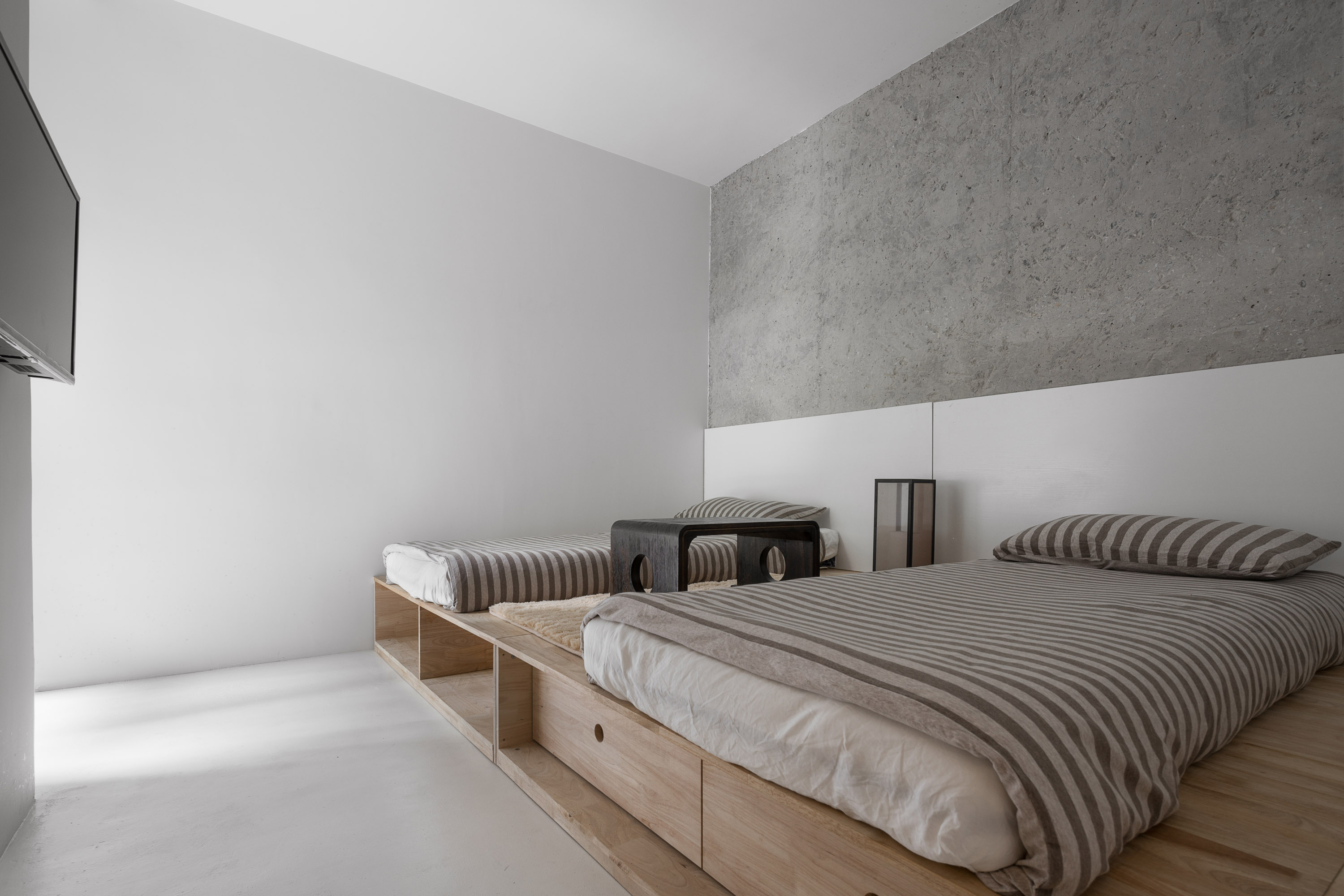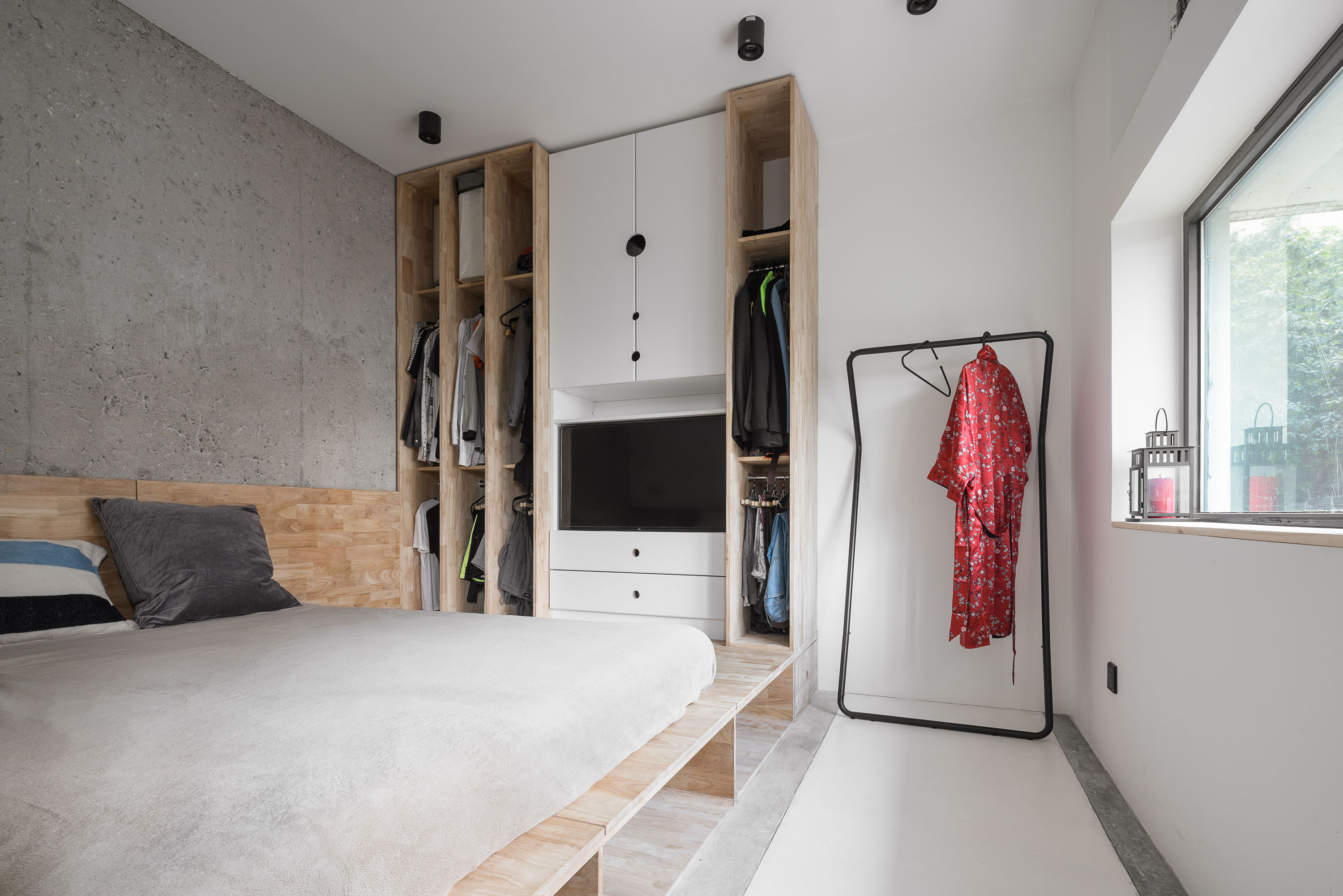 设计选材:我们依然是选择原始的幕僚作为设计的主要材料之一,没有经过多道程序处理的木头,造价自然是比较低廉,另外,没有处理的木材也更有触感,让人有更加环保的感受。我们简化了施工的工艺,让更多不会直接触碰到的墙面保留没有经过处理的水泥表面,例如天花板床背的墙面等,降低了施工成本的同时,也让房间有了更多的对比变化。