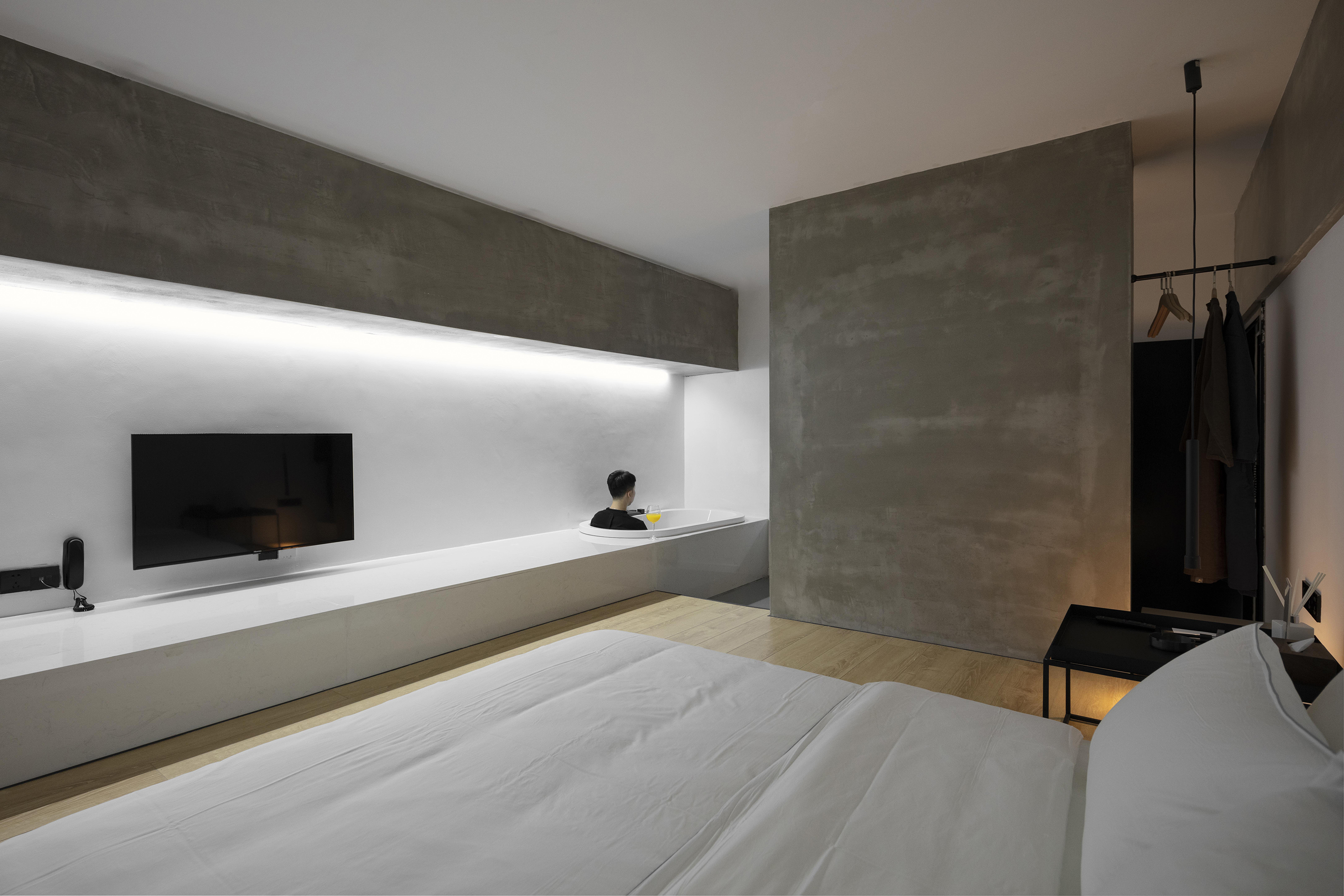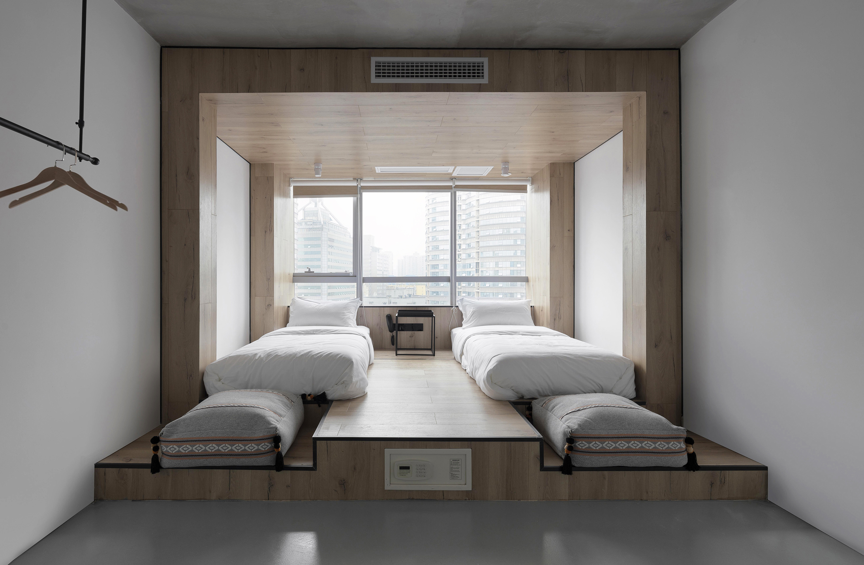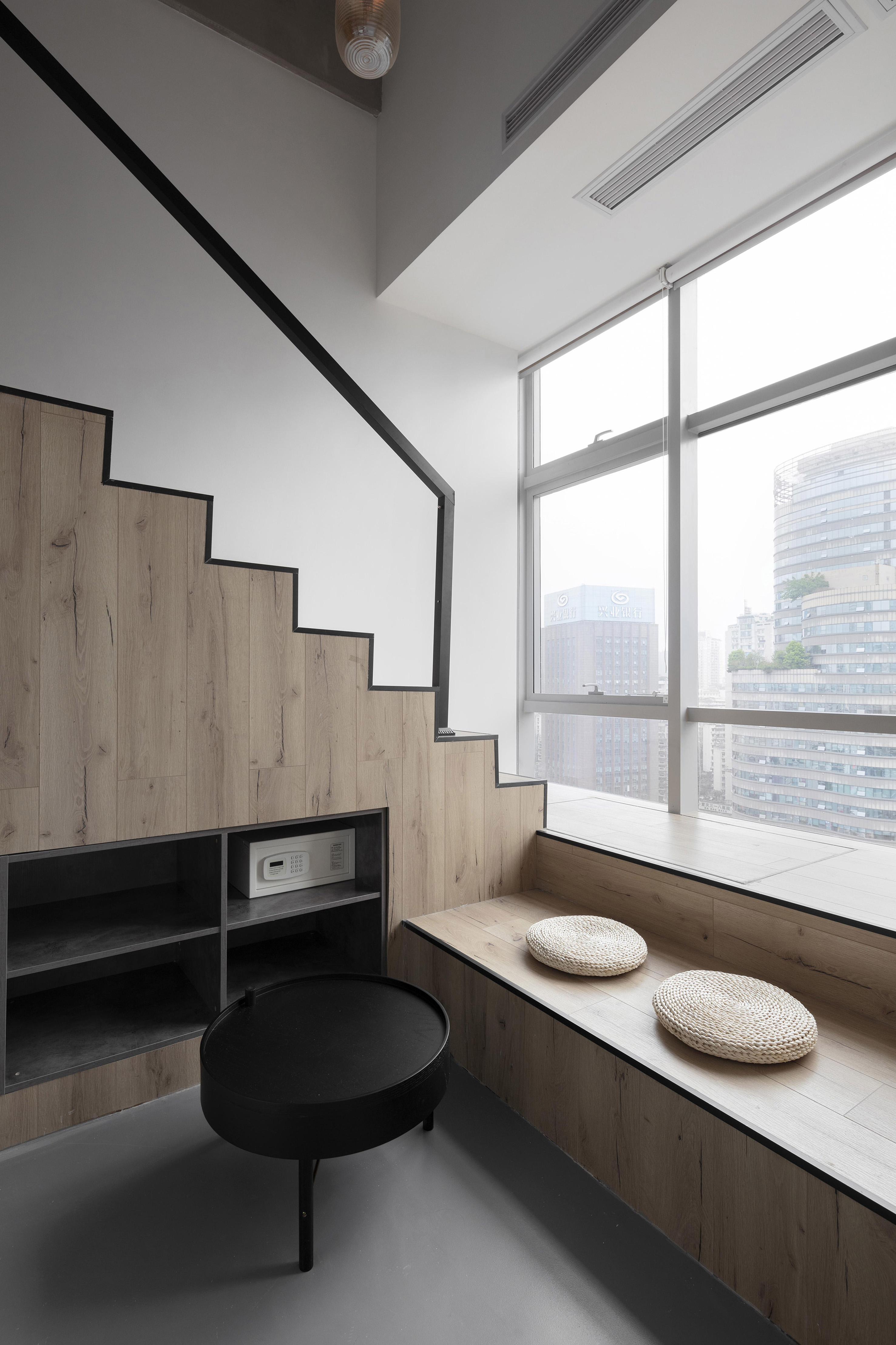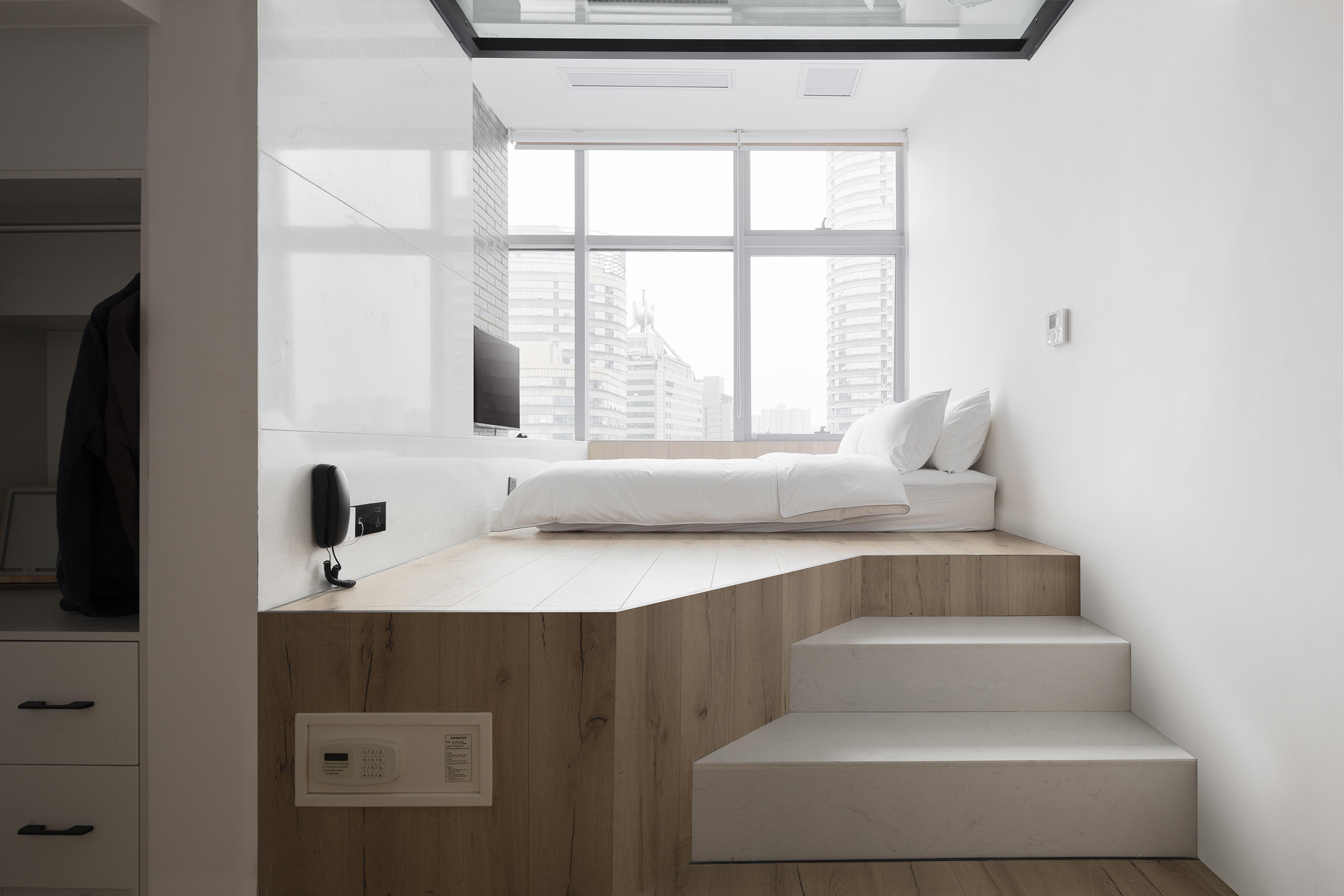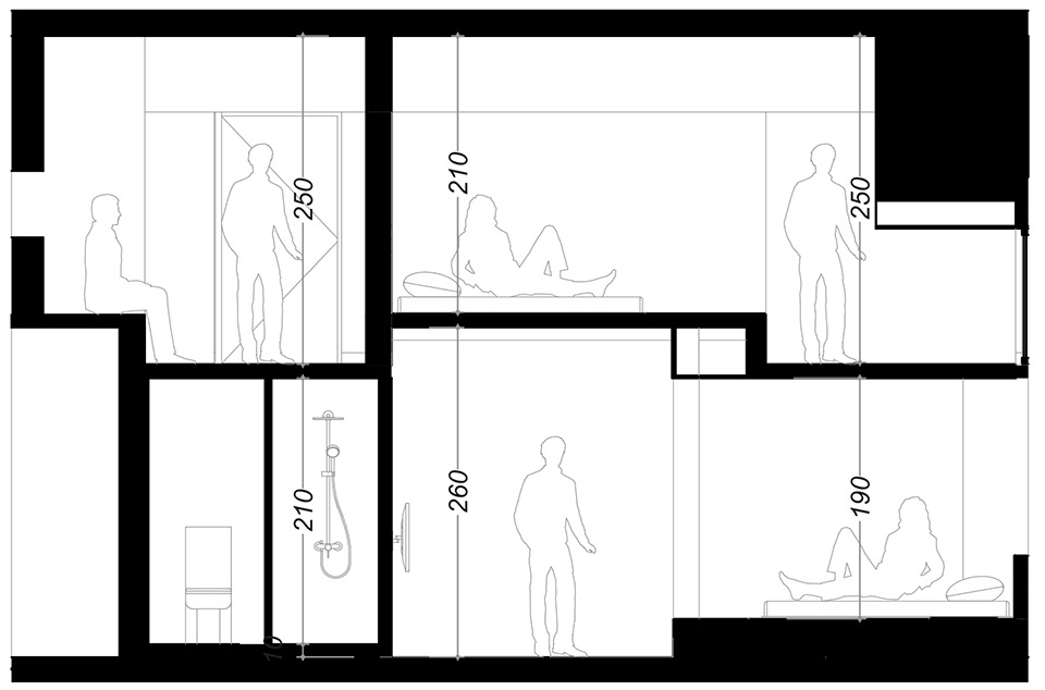 空间布局:酒店的层高只有4.8米,我们需要在这个有限的高度空间中,隔出两层来设置上下两个功能齐全的独立酒店房间,以及两层房间所需要的全部管线。为了保证两层的房间都有一个舒适合理的房间高度,我们就不能单纯的把2层的地面设定为一个固定的标高,而是仔细分析了每一个房间内不同活动所需要的合理高度,来专门设置1,2层的空间布局。例如我们将2层床的高度以下的空间都分配给一层使用,来增加一层天花的高度,而我们降低一层的厕所,床等空间的天花板高度,来增加二层房间的空间高度。这样的设计,每一个房间中就会出现各种高低不一的空间场所,居