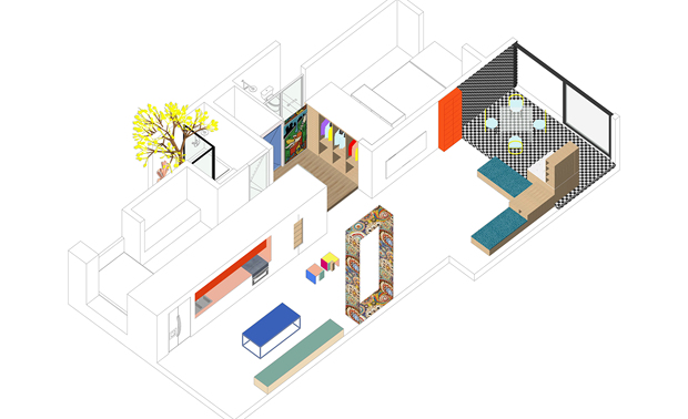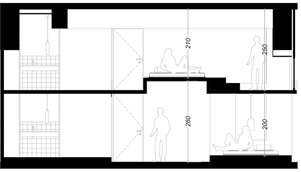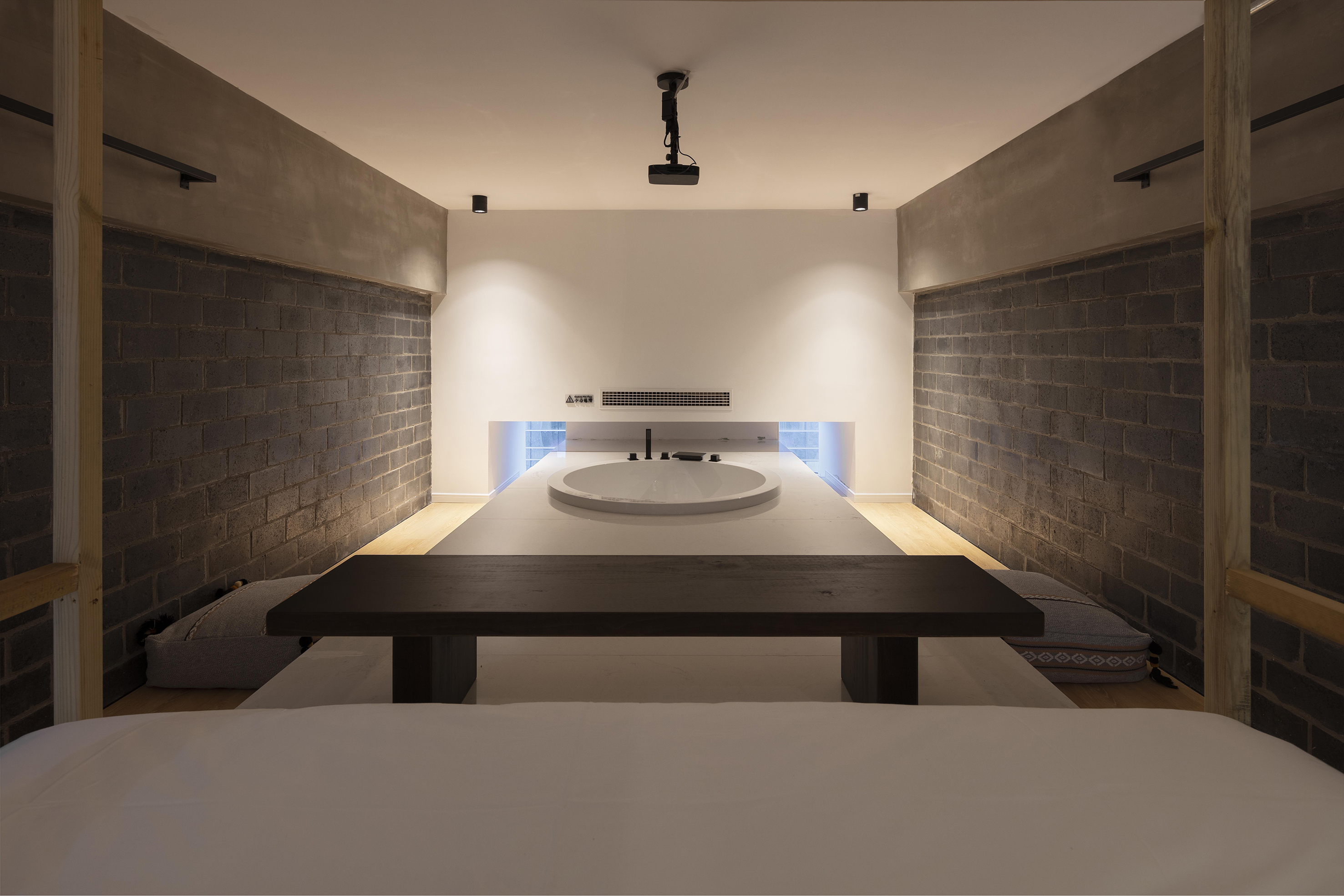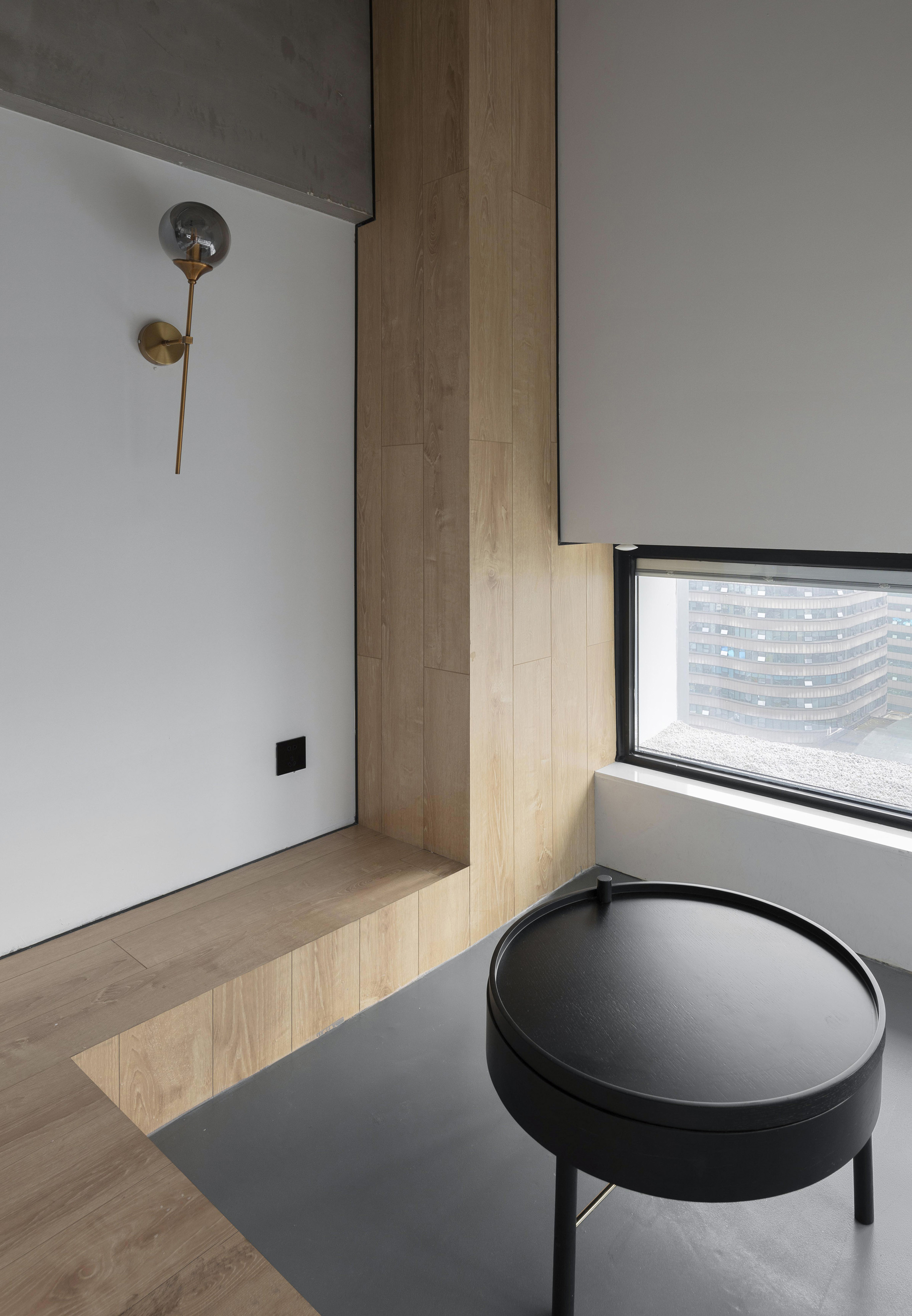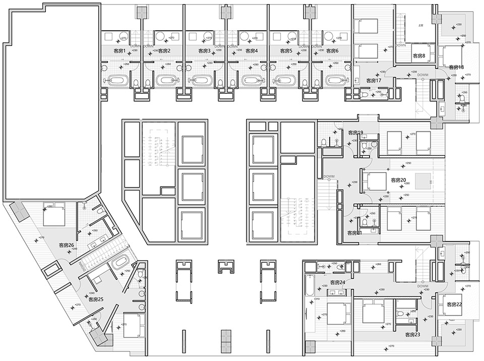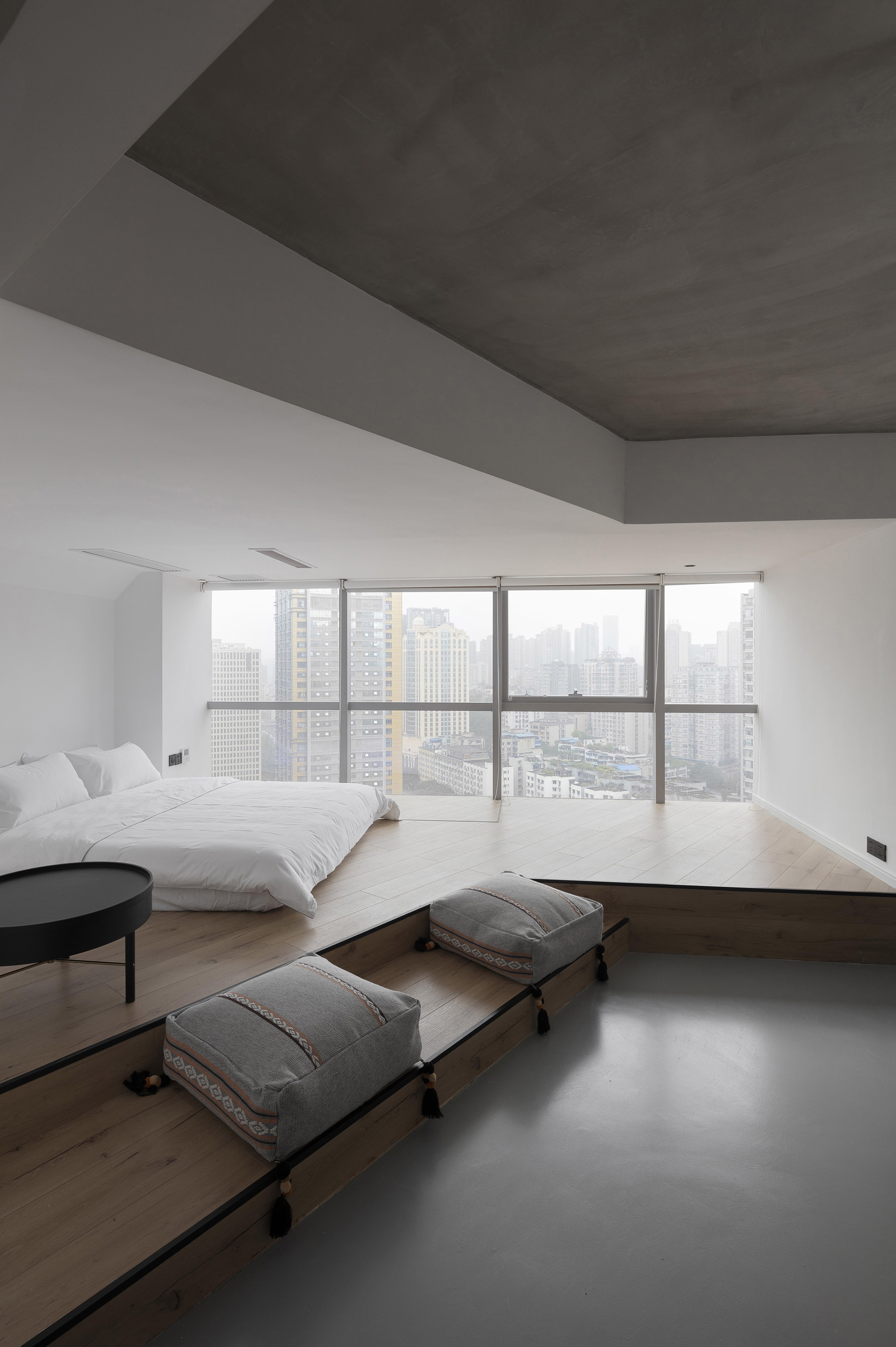 空间布局:酒店的层高只有4.8米,我们需要在这个有限的高度空间中,隔出两层来设置上下两个功能齐全的独立酒店房间,以及两层房间所需要的全部管线。为了保证两层的房间都有一个舒适合理的房间高度,我们就不能单纯的把2层的地面设定为一个固定的标高,而是仔细分析了每一个房间内不同活动所需要的合理高度,来专门设置1,2层的空间布局。例如我们将2层床的高度以下的空间都分配给一层使用,来增加一层天花的高度,而我们降低一层的厕所,床等空间的天花板高度,来增加二层房间的空间高度。这样的设计,每一个房间中就会出现各种高低不一的空间场所,居