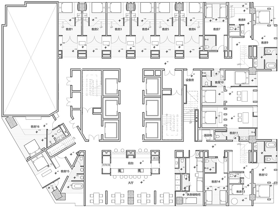 空间意境:建筑的原始平面结构是以一条狭长封闭的走廊连接各个房间与电梯楼梯间,并没有任何的公共区域可以使用,这不是我们所期待的空间形式,为了营造一个更加趣味性的酒店体验,我们尽量的精简房间内部的布局,将原本狭长的走廊变得更加宽敞和富有变化性以及功能性。我们在酒店的公共区域设置了酒吧和餐饮中心,以及散落在各个部位的众多休闲区域,让整个酒店的公共区域看起来更像是一个大型的咖啡厅或者休闲会所,使顾客的身心得到放松。而每一个酒店的房间则是以环绕的形式,分布在整个公共空间的四周,希望这样可以让顾客更想走出房间在公共区域中自由活