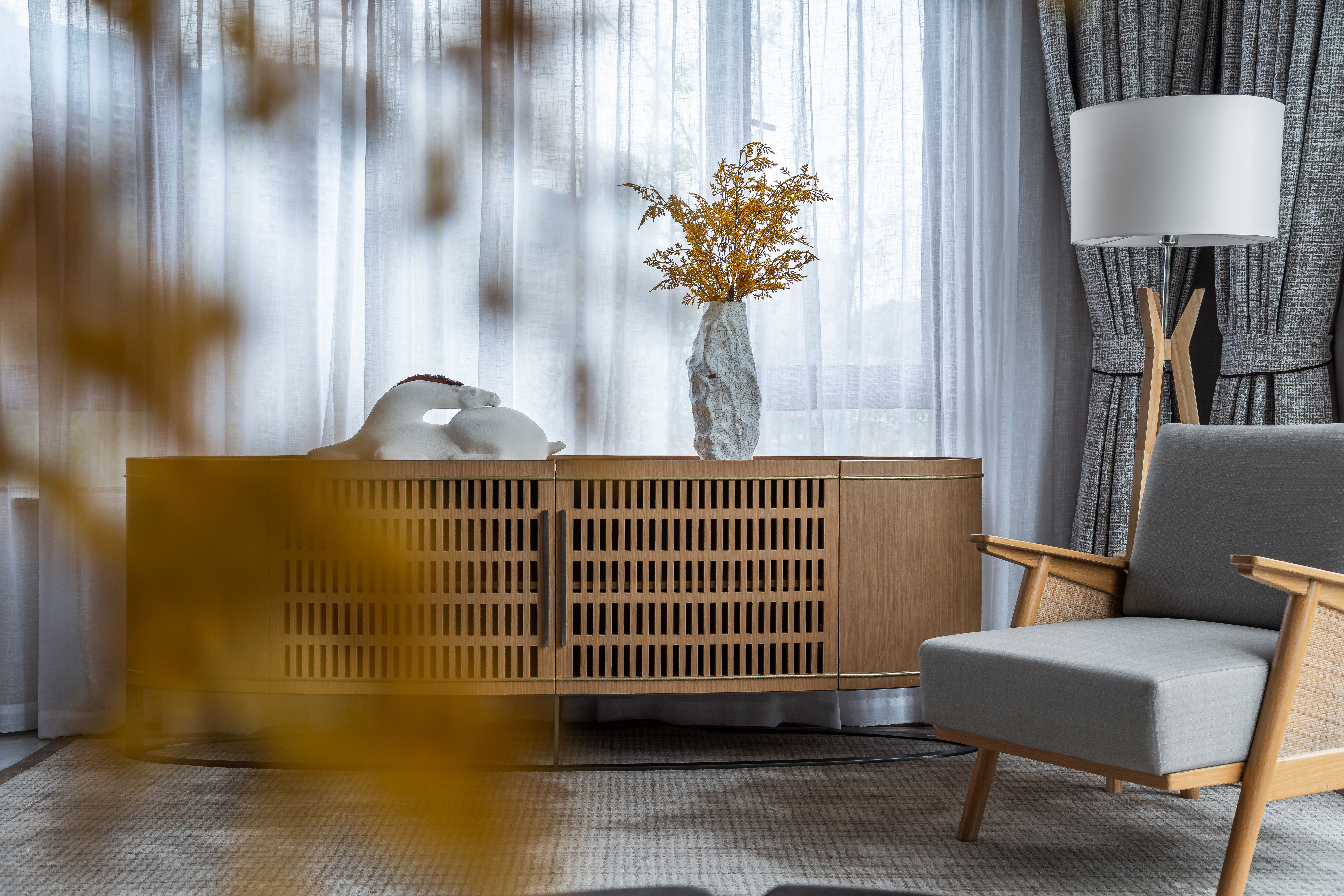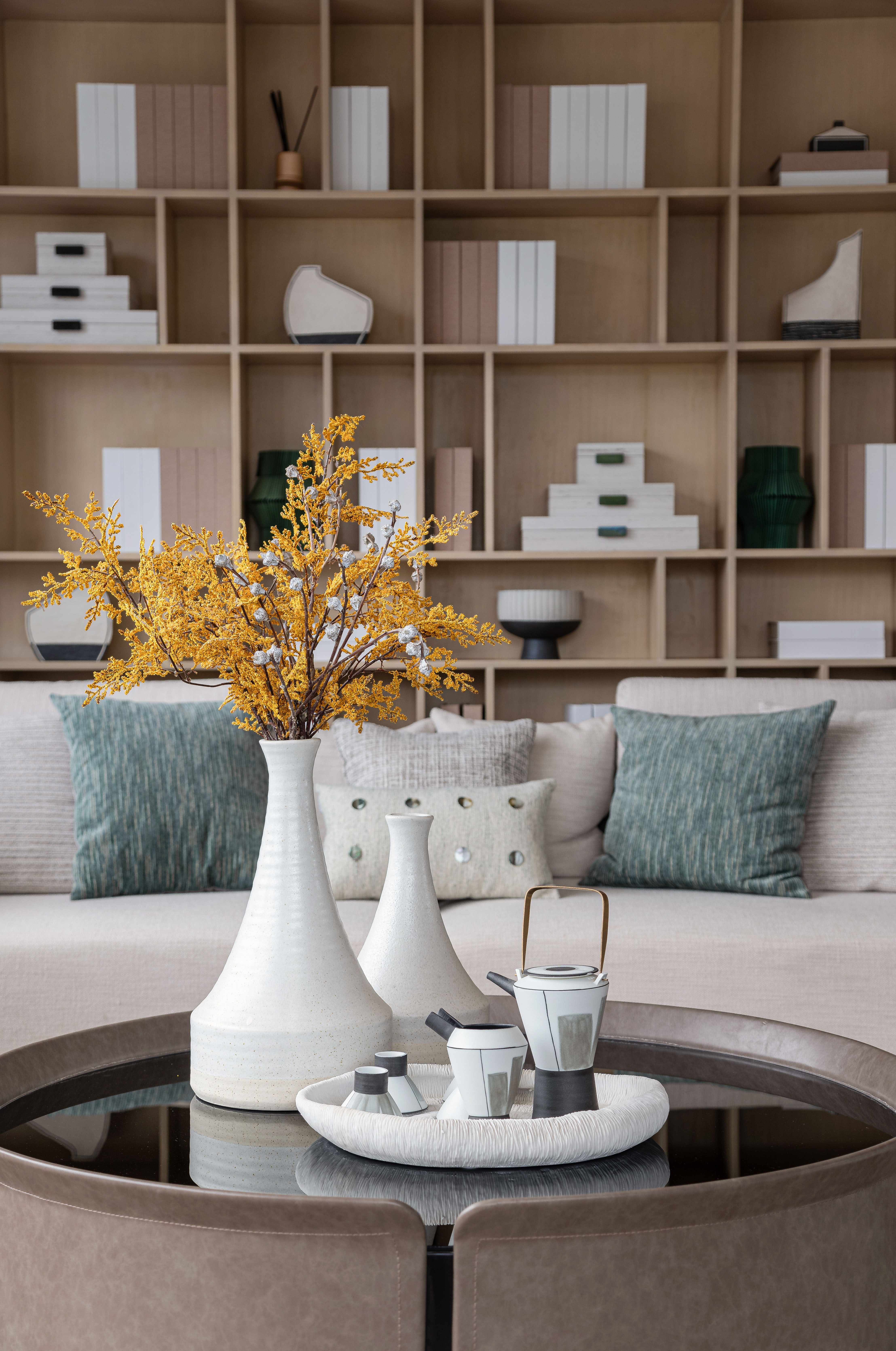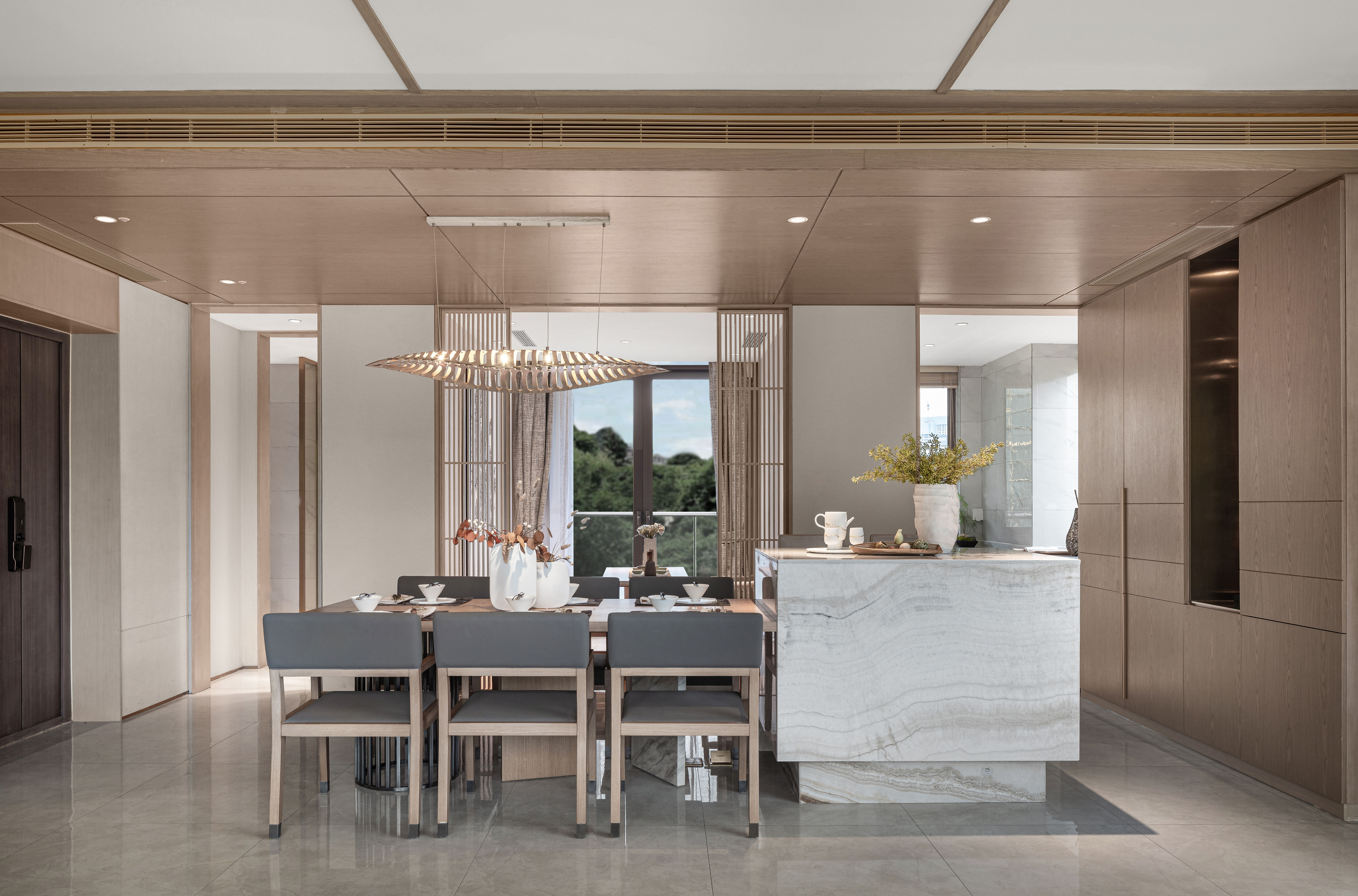 万物之始,大道至简,衍化至繁 设计是保留生活的一种方式,大面积的玻璃元素是不可或缺的主角,承载着窗外的四时变化。客餐厅明亮清透,以原木色为主基调,质感自然且肌理丰富,赋予空间无限的生命力。地毯与沙发柔软的质感将造型简洁、立体的茶几故意错开,矛盾之间,情理之中。坐案硬朗,沙发柔软,一张一弛之间传递出生活的动态与平衡哲学。