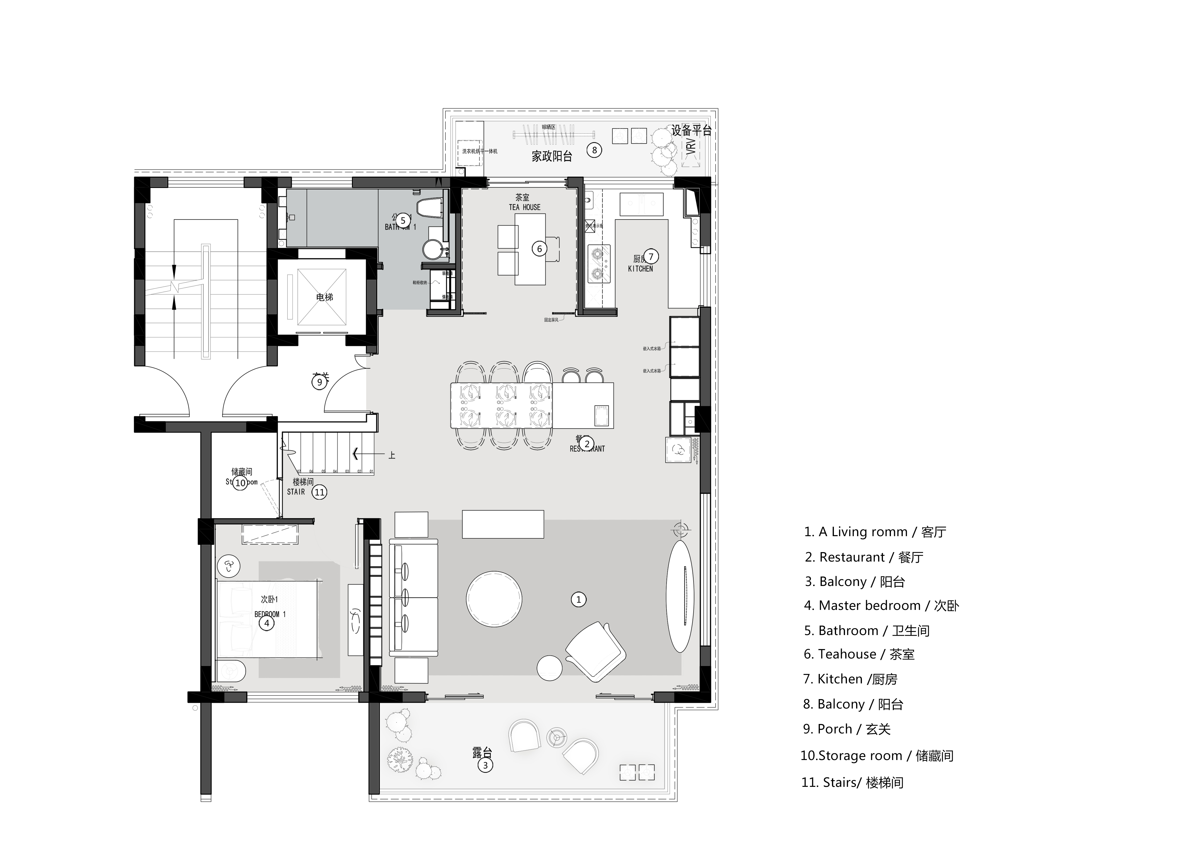 空间布局:设计是保留生活的一种方式,大面积的玻璃元素是不可或缺的主角,承载着窗外的四时变化。客餐厅明亮清透,以原木色为主基调,质感自然且肌理丰富,赋予空间无限的生命力。地毯与沙发柔软的质感将造型简洁、立体的茶几故意错开,矛盾之间,情理之中。坐案硬朗,沙发柔软,一张一弛之间传递出生活的动态与平衡哲学。