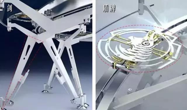 桌盘下方利用5毫米的钢板塑成剑与盾牌的设计,象征着放下骄傲或者成见的盾牌和剑。而交叉的剑又放射组成一个更强固的结构,俯视圆桌时,彷彿有十二天将,手牵手,心连心。
