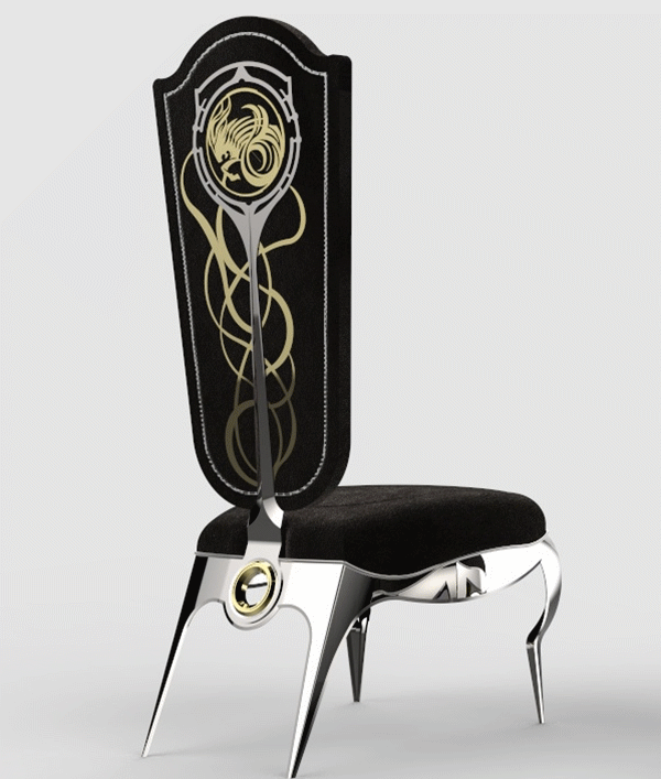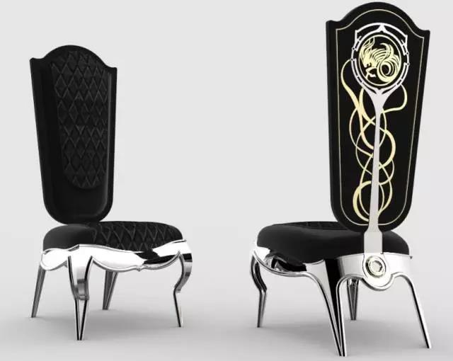 在这些极具现代感的家具外形下将一些看似无法关联甚至相互冲突的元素通过设计完美结合。例如金属、玻璃的材质与古典主义通常难以联系,金属和玻璃通常质感较硬、比较现代、过于简洁,难以体现典雅品质。黄书恒却一反常规,在多款家具中使用金属与玻璃演绎出古典尊贵的家具。