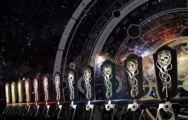 椅背分别刻上精心设计的代表不同星座的金色图腾,在图腾的设计上将剑、盾牌元素与星座巧妙融为一体。在材质的选择上极具质感的高级皮料与坚硬的金属形成强烈的视觉对比,层次丰富、刚柔并济,整体呈现出神秘且尊贵典雅的气质。