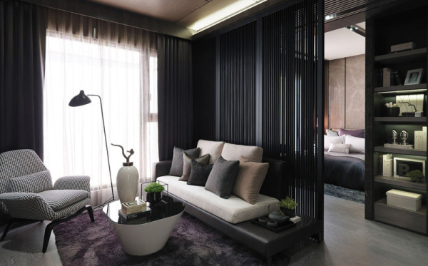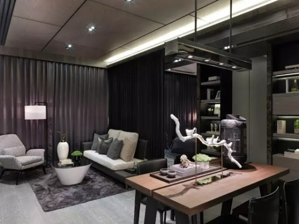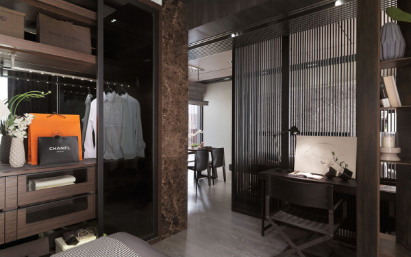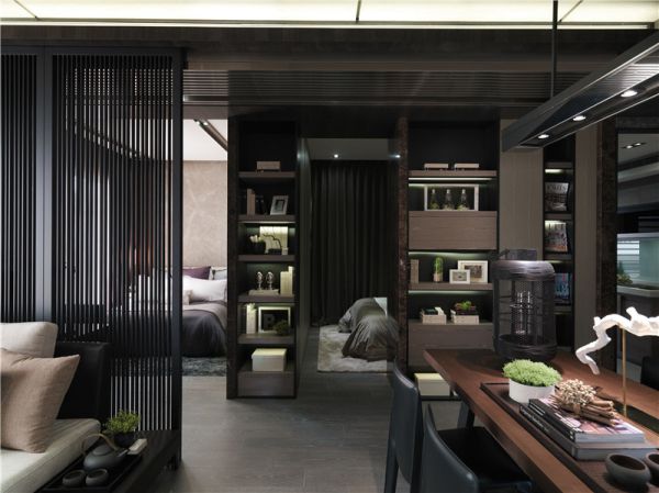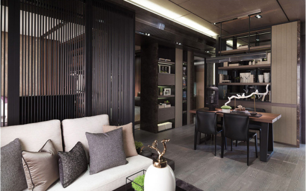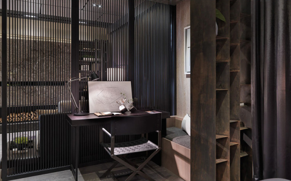 灰、褐、黑、朱等大量沉稳色阶串连所有区域的选择,刻意压低了场域内光源,帘布衬与墙面装饰线条,每一笔设计都来自迥异的深色质感。
