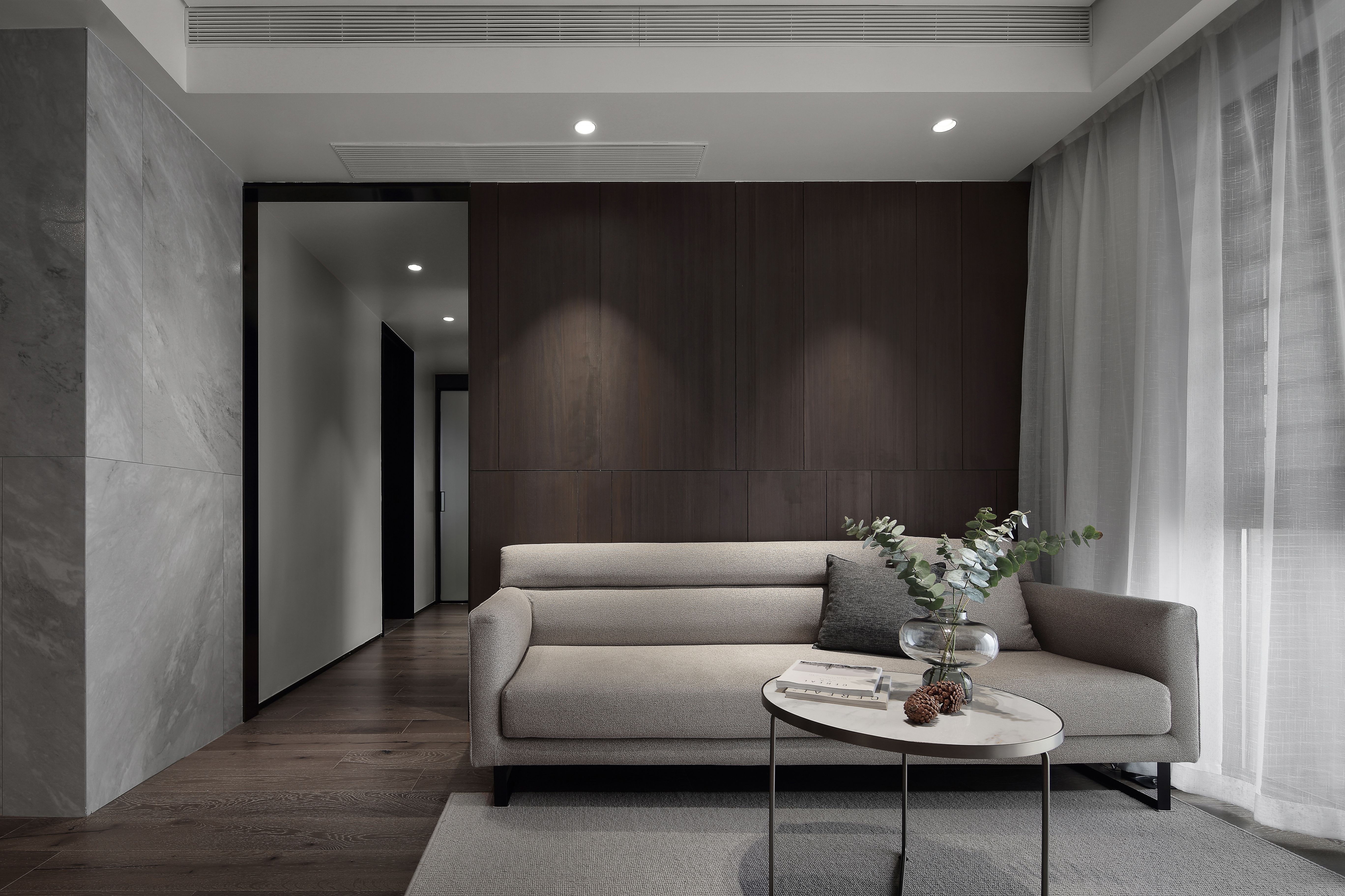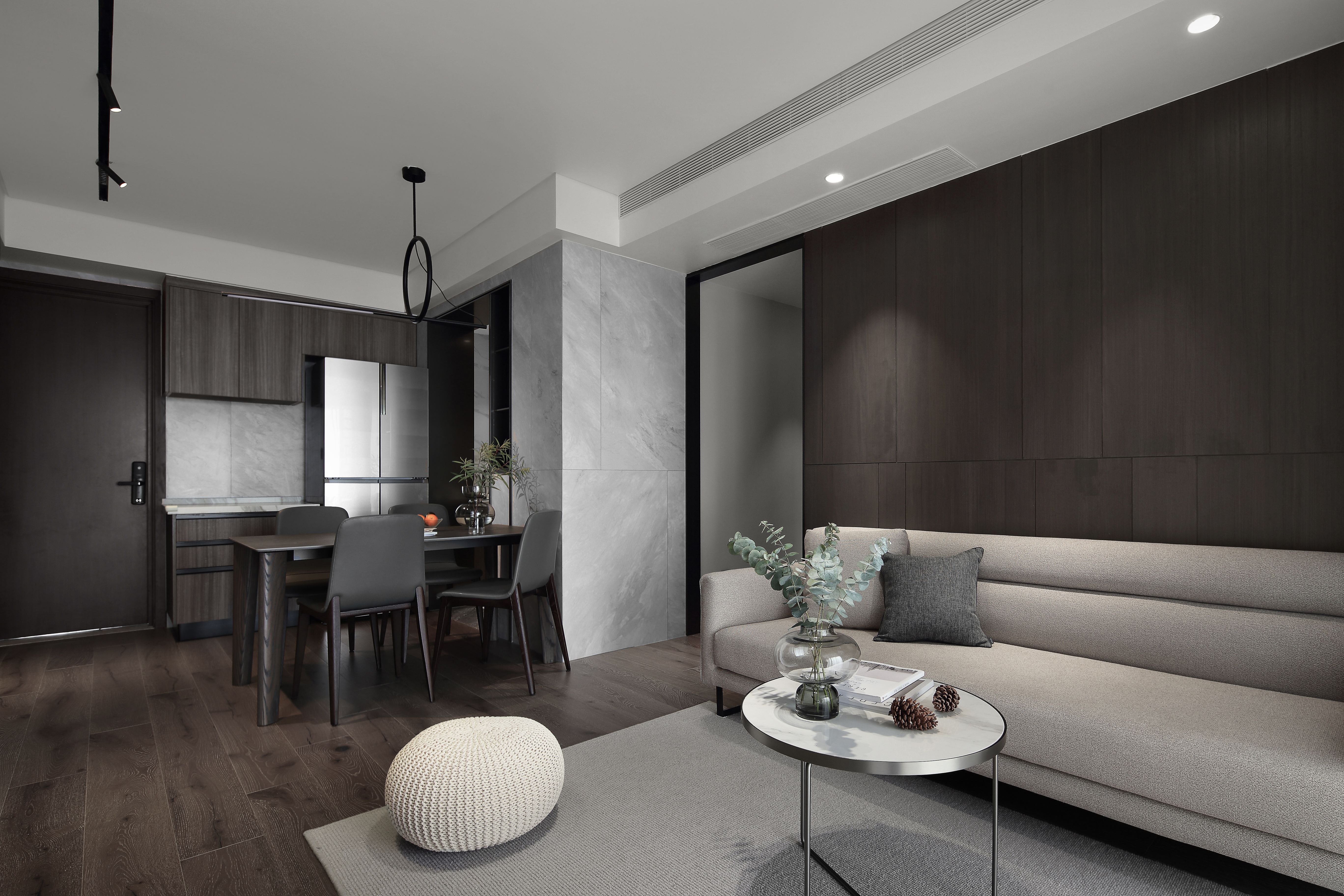 设计选材:沙发背景墙用木色的免漆KD板,铺垫出全房的简约基调,干净环保。
