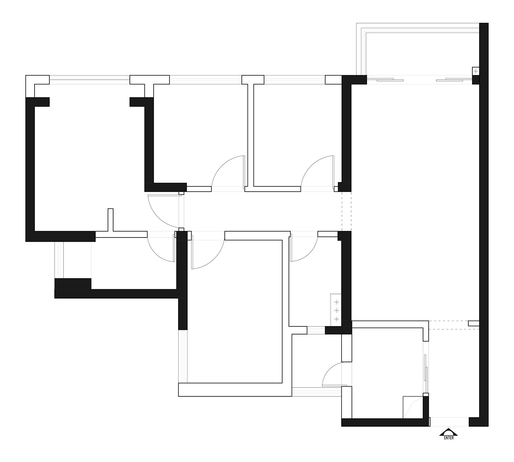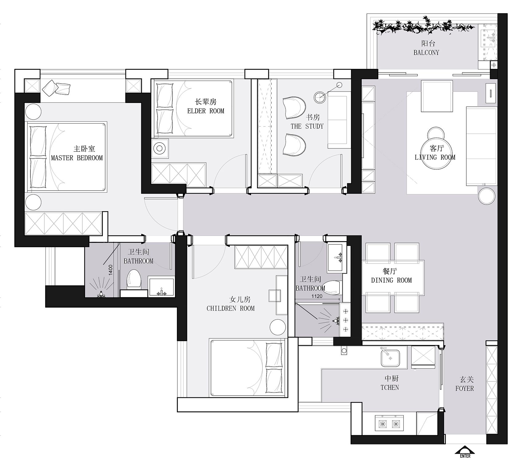 1、三室已经足够,把其中一间房改造成使用率更高的书房:2、将小阳台并入厨房,增加厨房的面积;3、餐厅增加了西厨,日常可以做茶水台使用