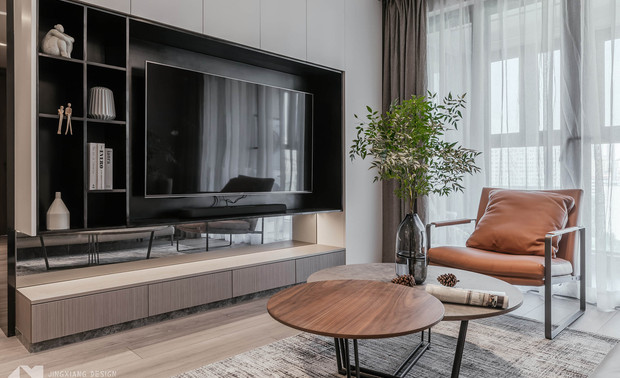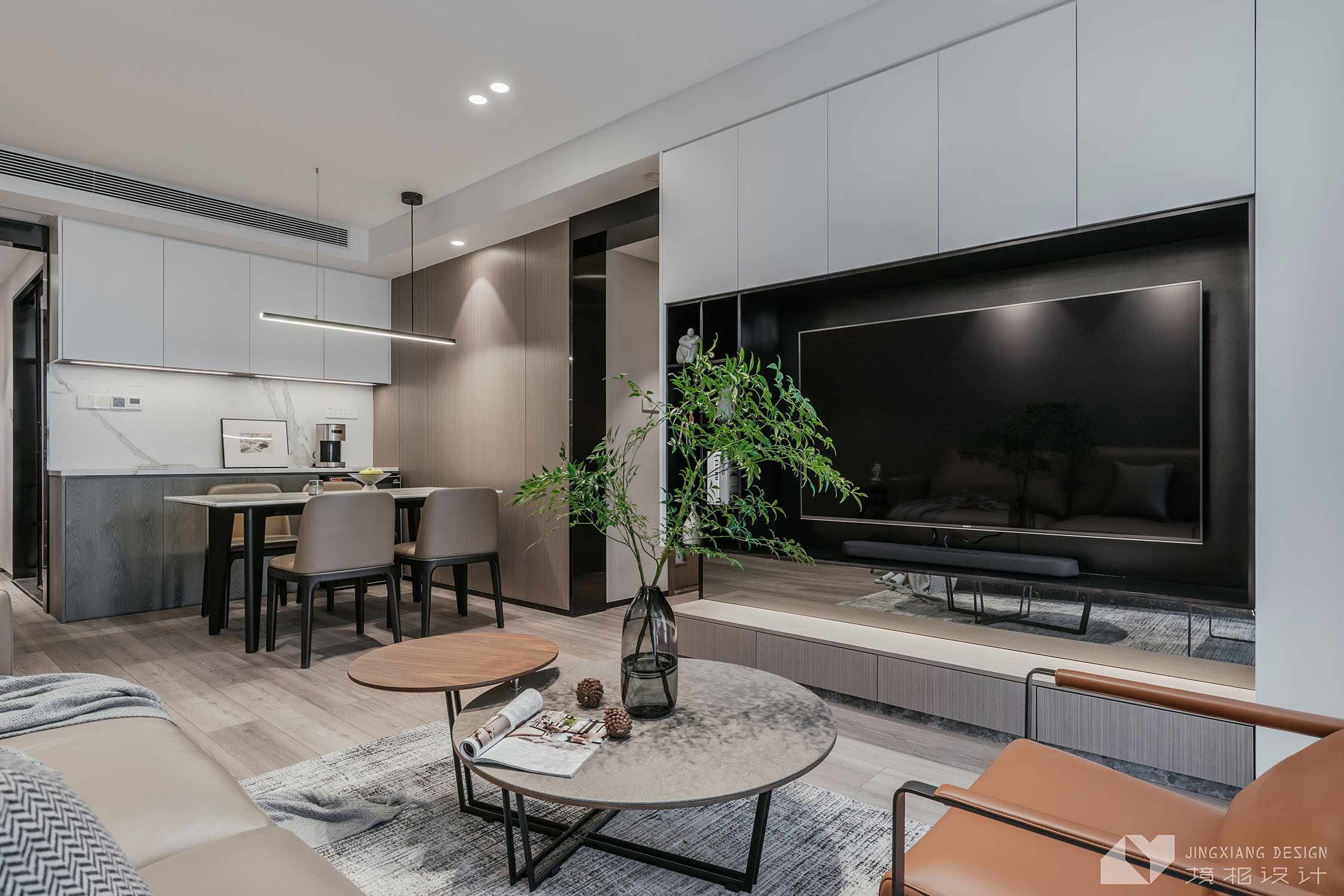 不同材质的互相搭配,各种凸显气质的线条,色彩形成的视觉协调,展现设计带来的魅力!客厅采用实木科技木皮,考虑到客厅面积,没有制作把手,按压式回弹器让柜子更加干净整洁。