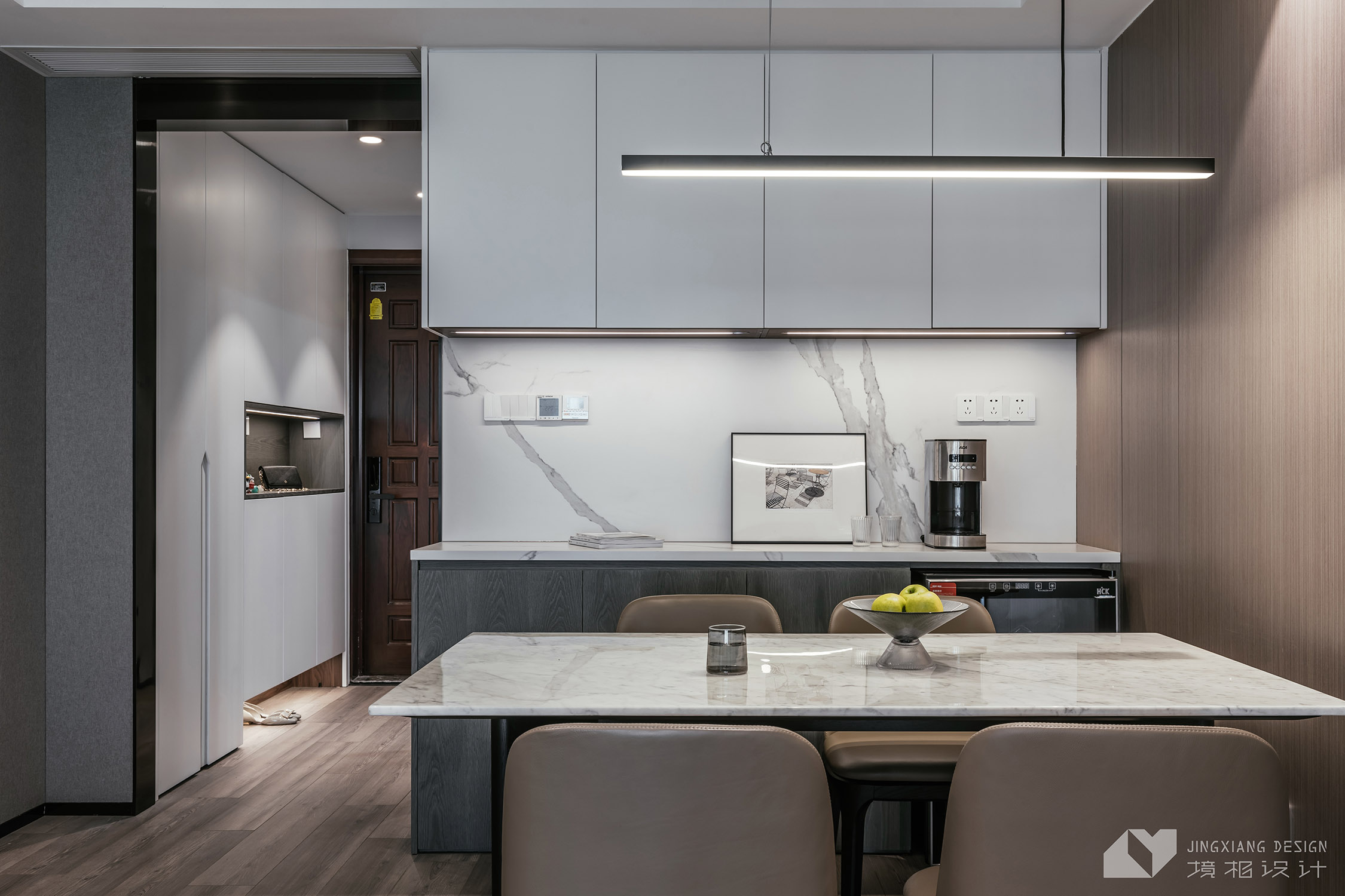 屋主夫妇二人喜欢干净简单的现代风格,还有餐厨一体的敞亮空间。所以设计师便根据屋主需求与习惯,打造出这个简约又不乏高级感的灰度世界!