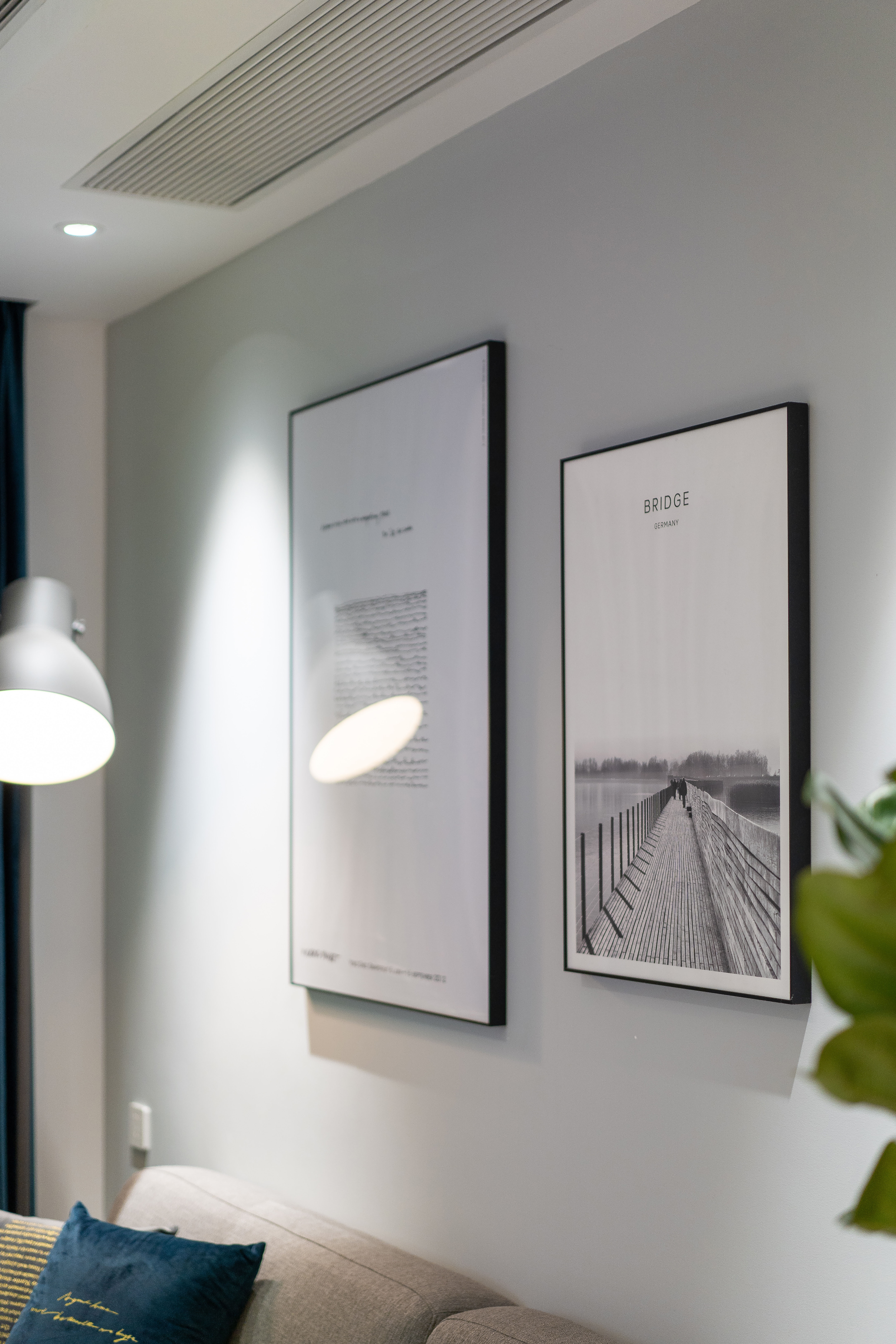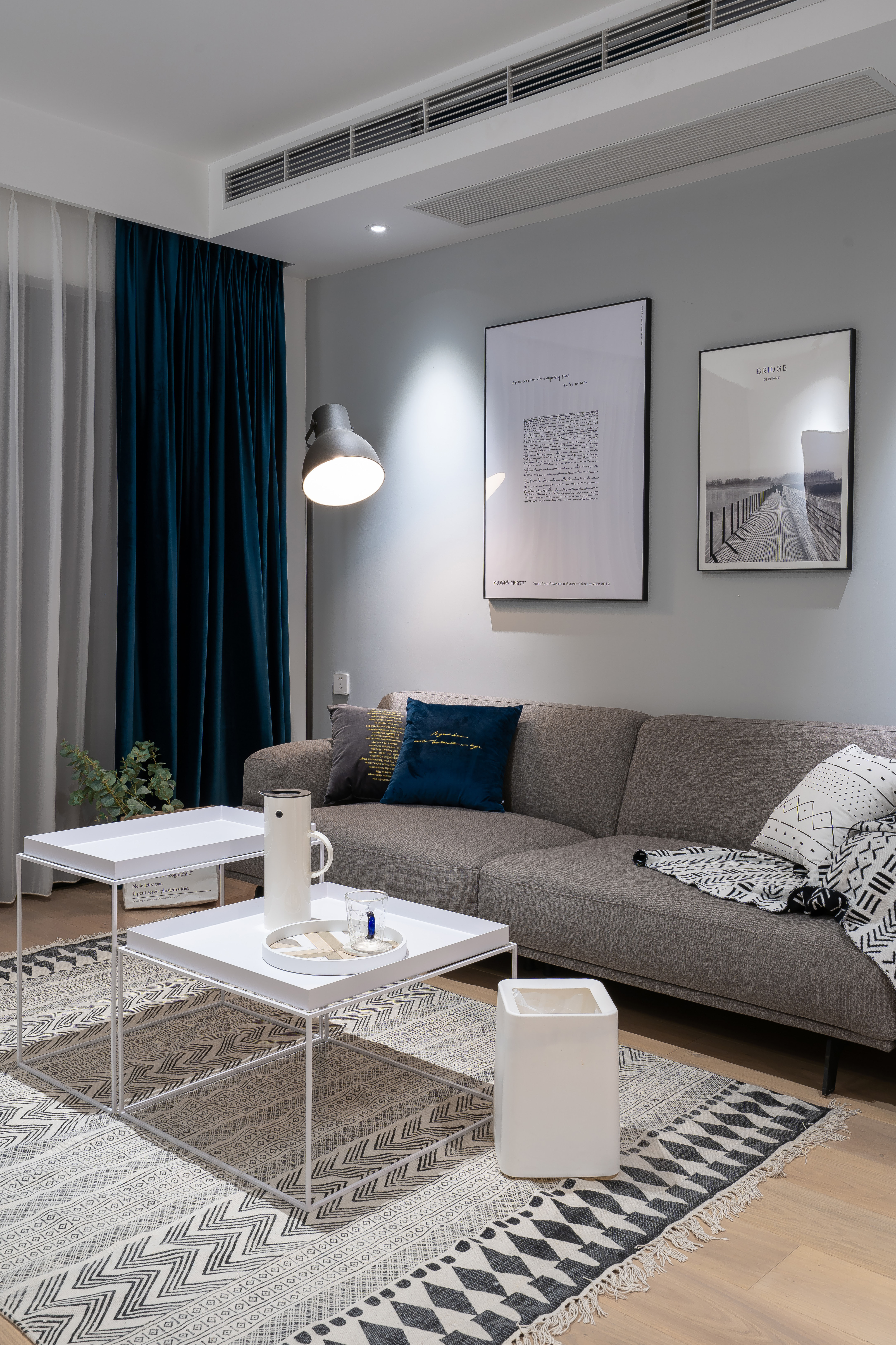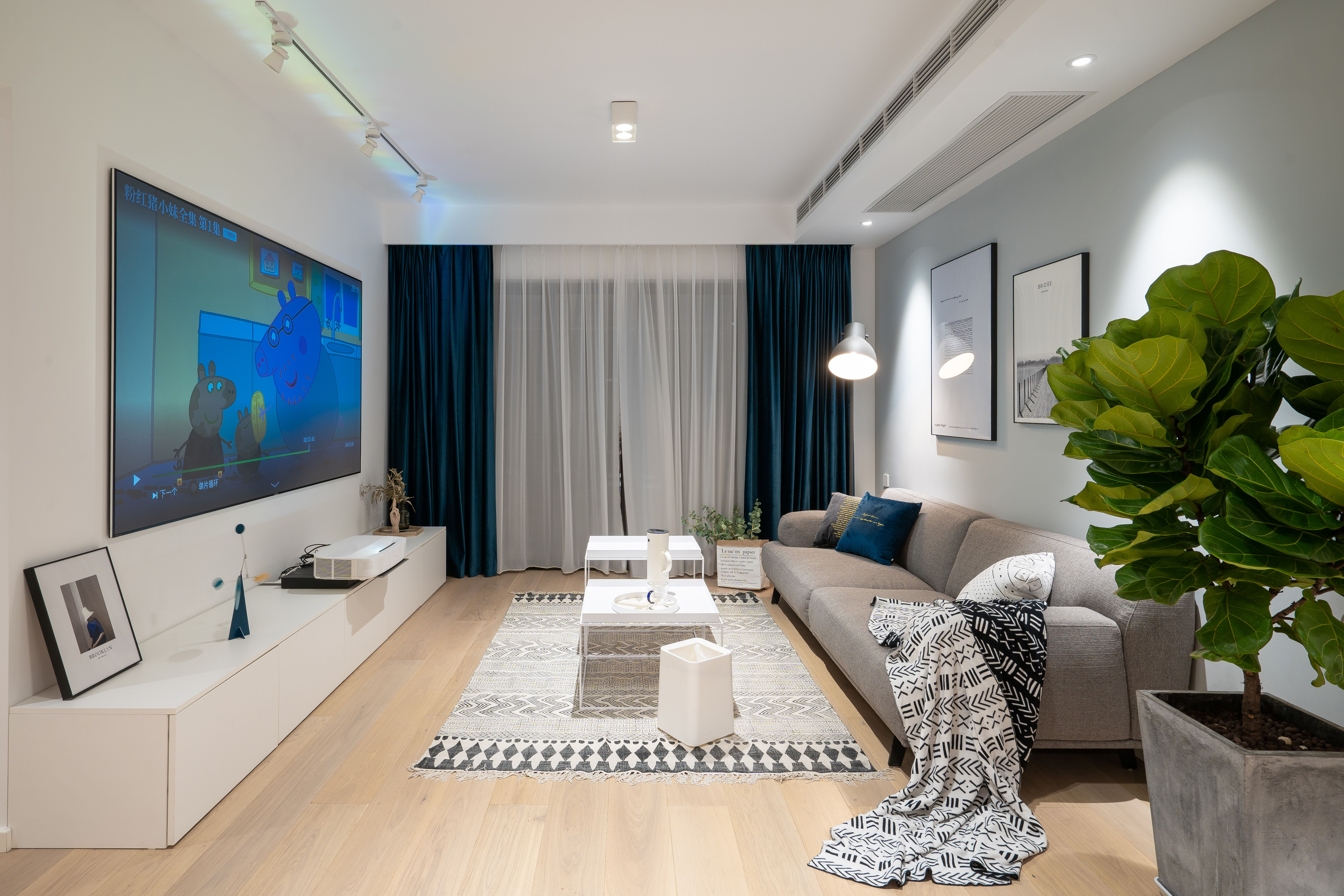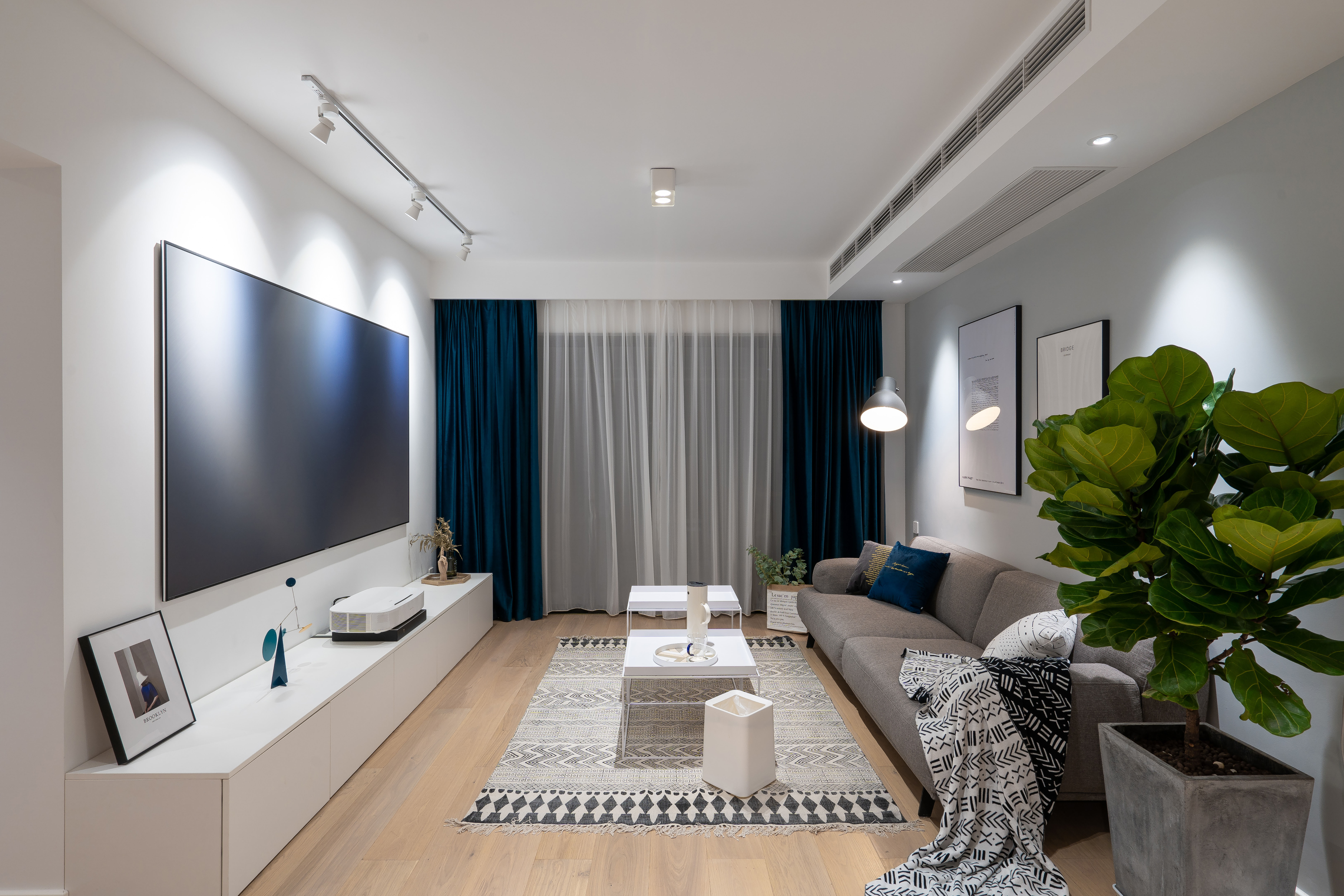 客厅沙发上方做了一长条单边吊顶,用于隐藏空调风管机;并没有多余的天花,采用无主灯设计,以明装暗装和轨道射灯来打造明暗空间效果。 客厅摆放一个大尺寸激光电视,虽然清晰度达不到高清电视级别,但大屏幕分辨率玩爆投影幕布,完全可以满足男主人晚上看球赛,偶尔放假还可以在家煲煲剧,谁不装谁后悔。