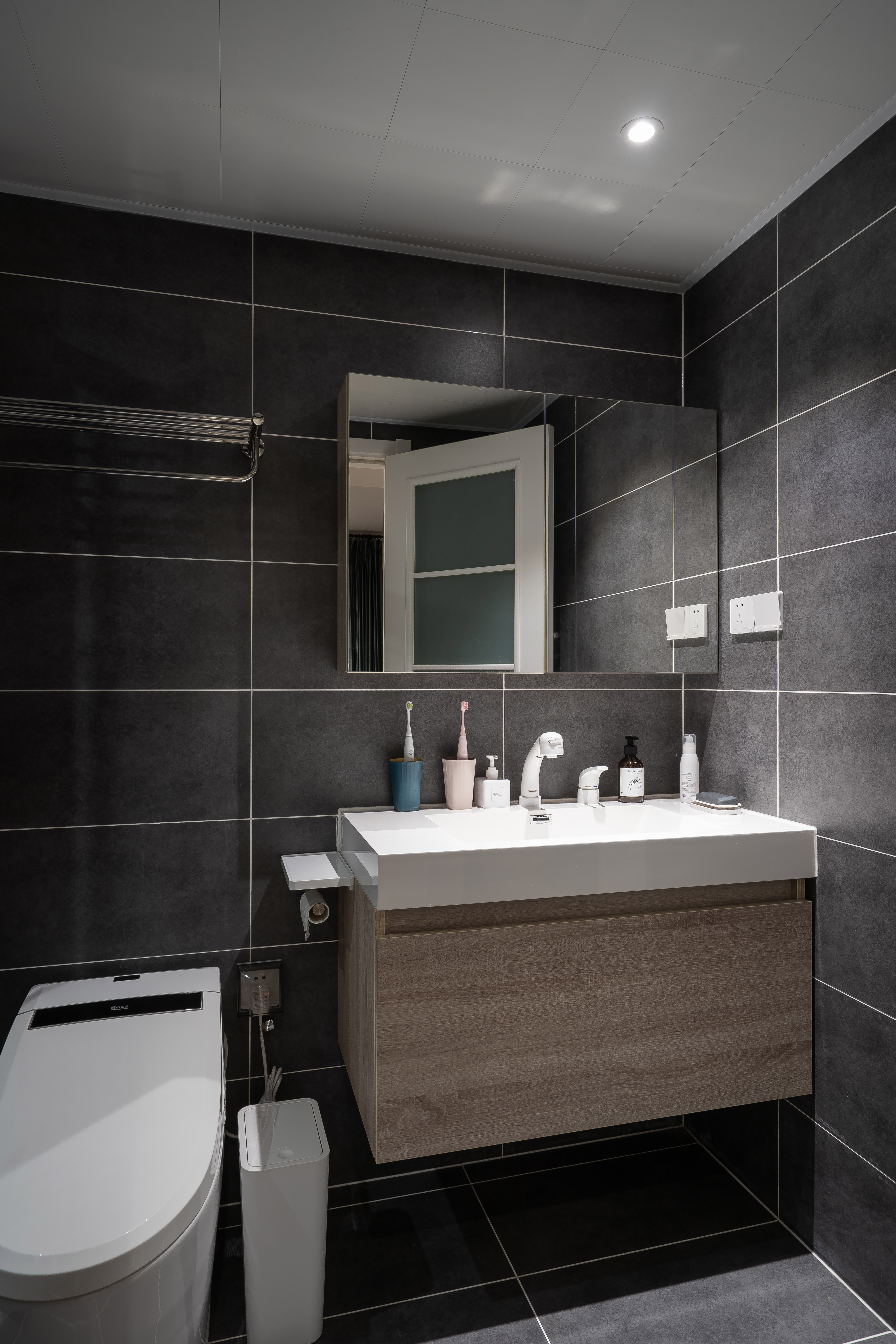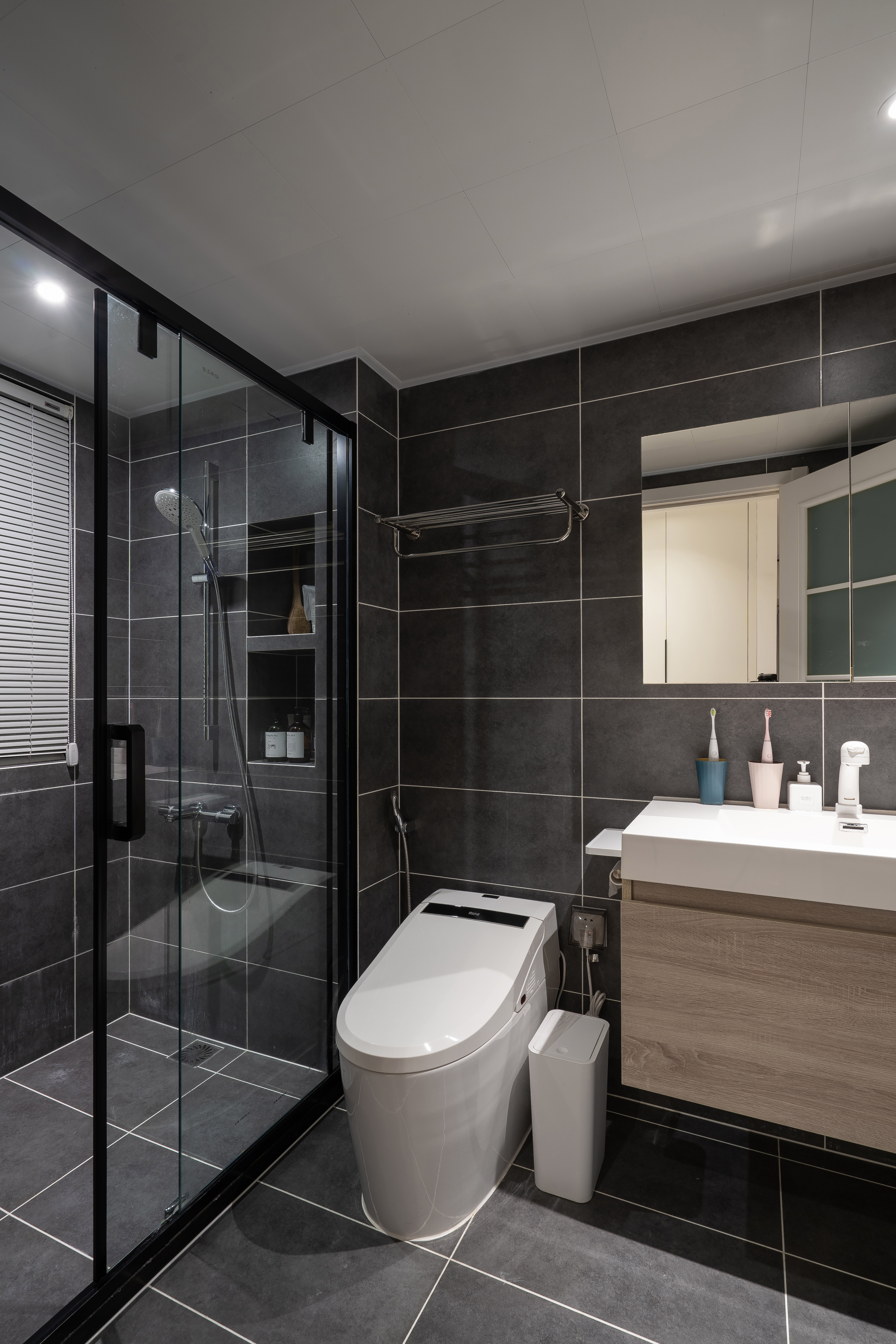 设计选材:客厅摆放一个大尺寸激光电视,虽然清晰度达不到高清电视级别,但大屏幕分辨率玩爆投影幕布,完全可以满足男主人晚上看球赛,偶尔放假还可以在家煲煲剧,谁不装谁后悔。主卧窗帘采用的是丝绒材质,这个垂感非常好的材质如果只做在飘窗内,由于长度不够完全体现不出它的美感,所以我们将窗帘设计在了飘窗外,立马提升了高级感。厨房门采用的是极细框玻璃推拉门,采用的是无门套,无地轨的做法,无门套无疑会让显得这个门更加简洁,无地轨即是做吊趟门,这样地面打扫卫生无死角非常方便。 卫生间地面墙面用的都是深灰色仿古砖,深色砖超耐脏,很适合懒