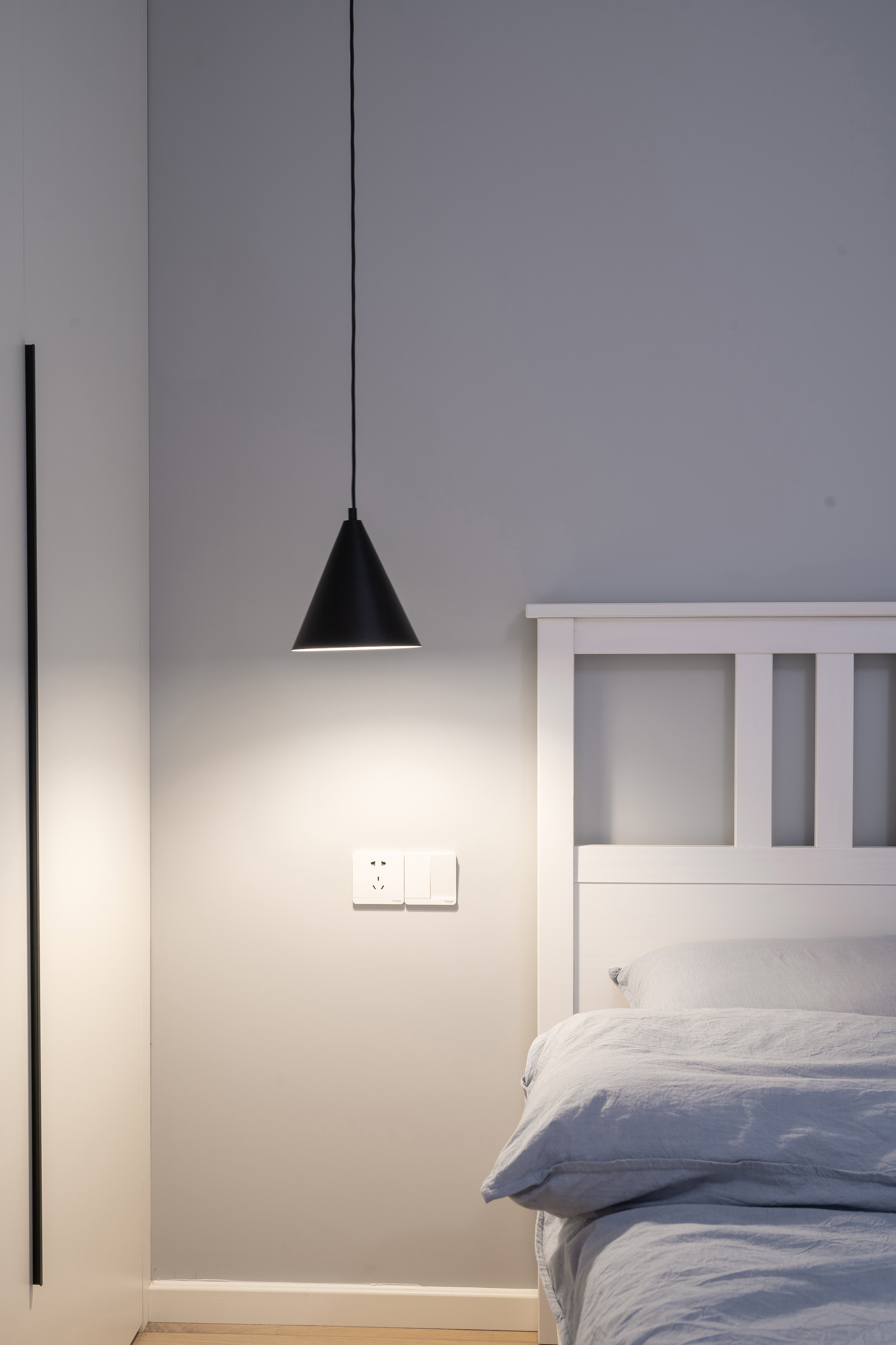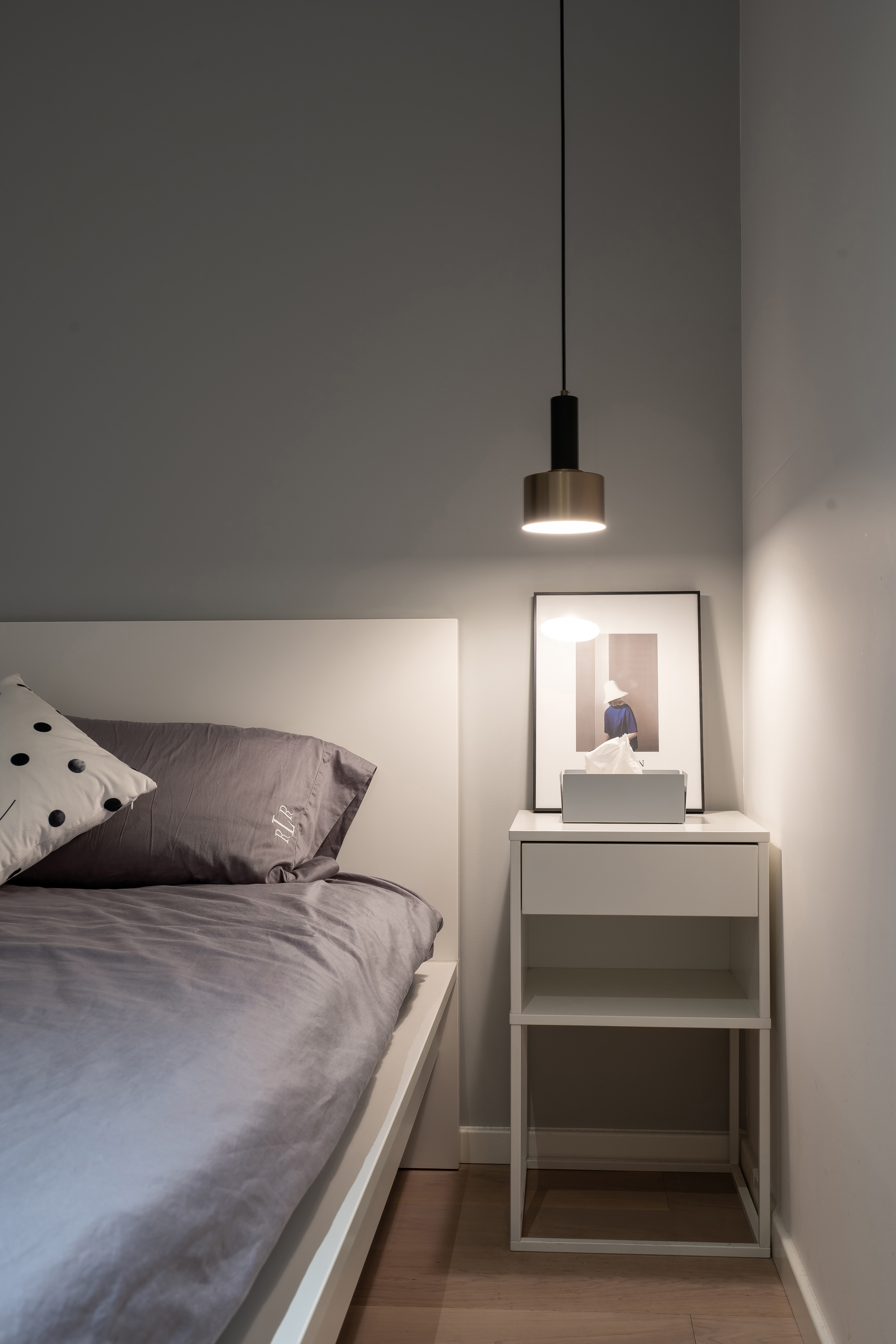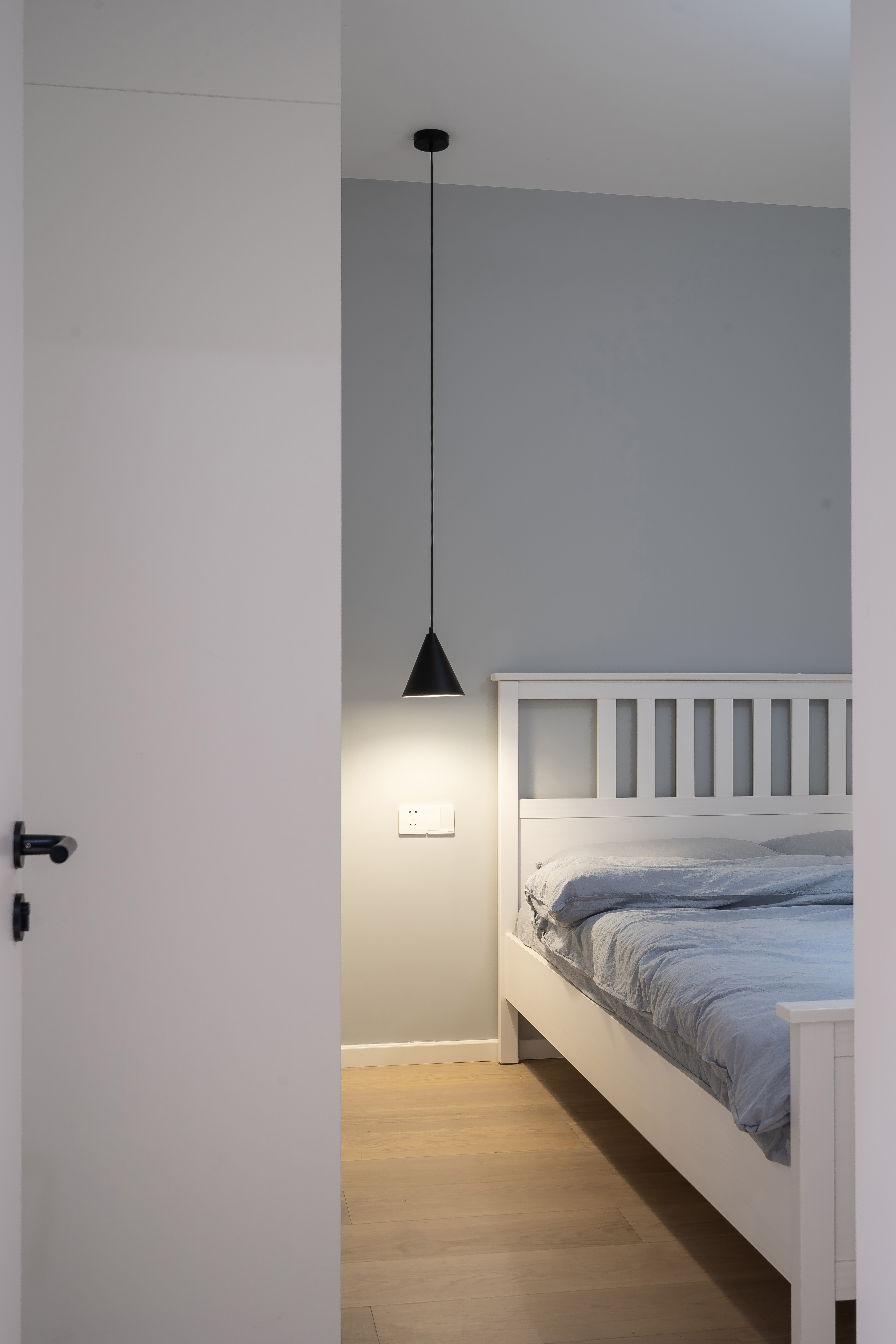 主卧单独隔出了一个小衣帽间,做了L型衣柜,白色一门到顶的柜门,搭配单条黑色长拉手。衣帽间上方做吊顶,用于隐藏主卧的空调。休息区没做任何吊顶,同样是无主灯设计,在床尾设计了两个单头射灯,加上床头两边小吊灯,这样一来,就降低了主卧的照明度,靠局部灯光打造休息区的氛围效果。