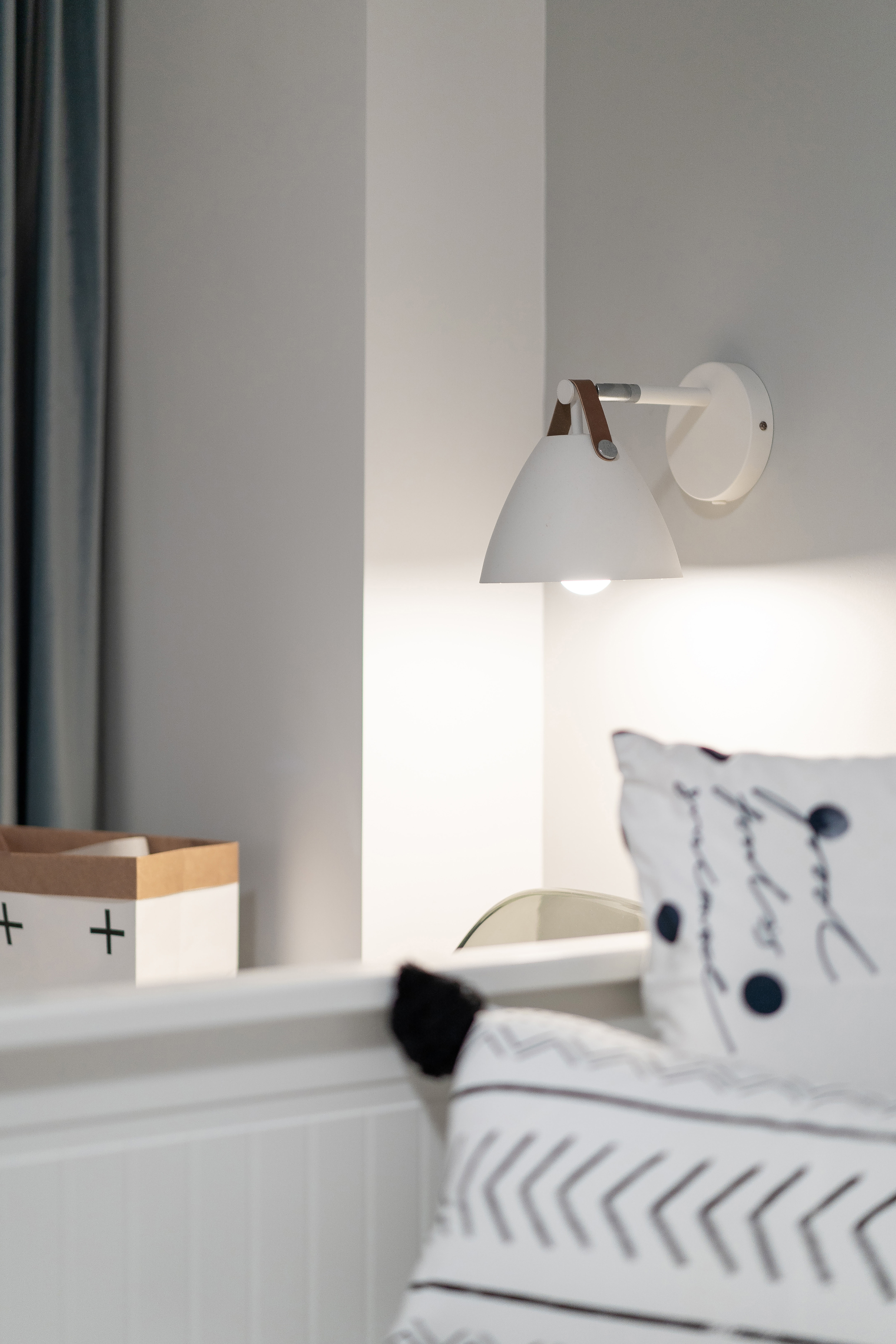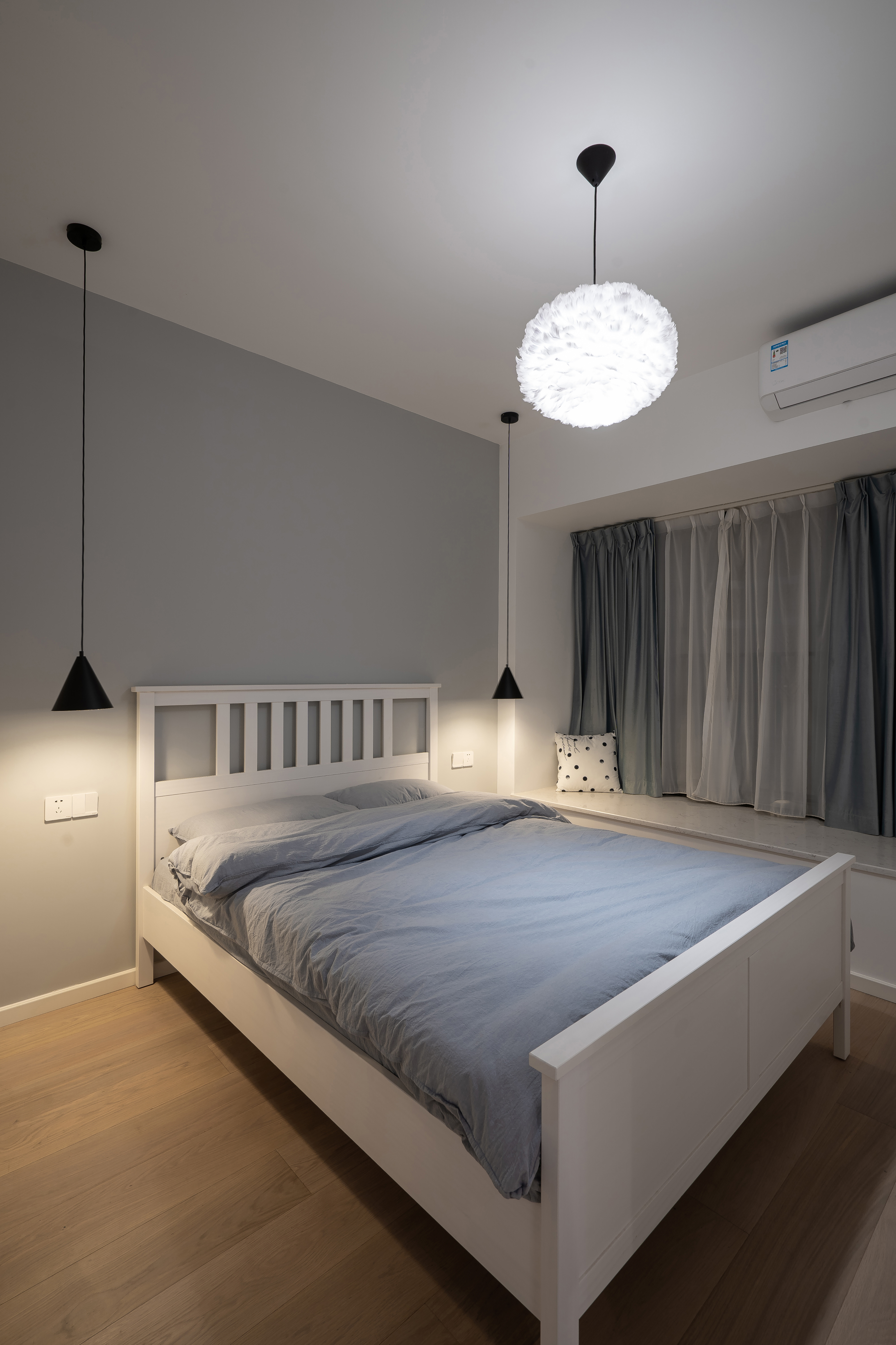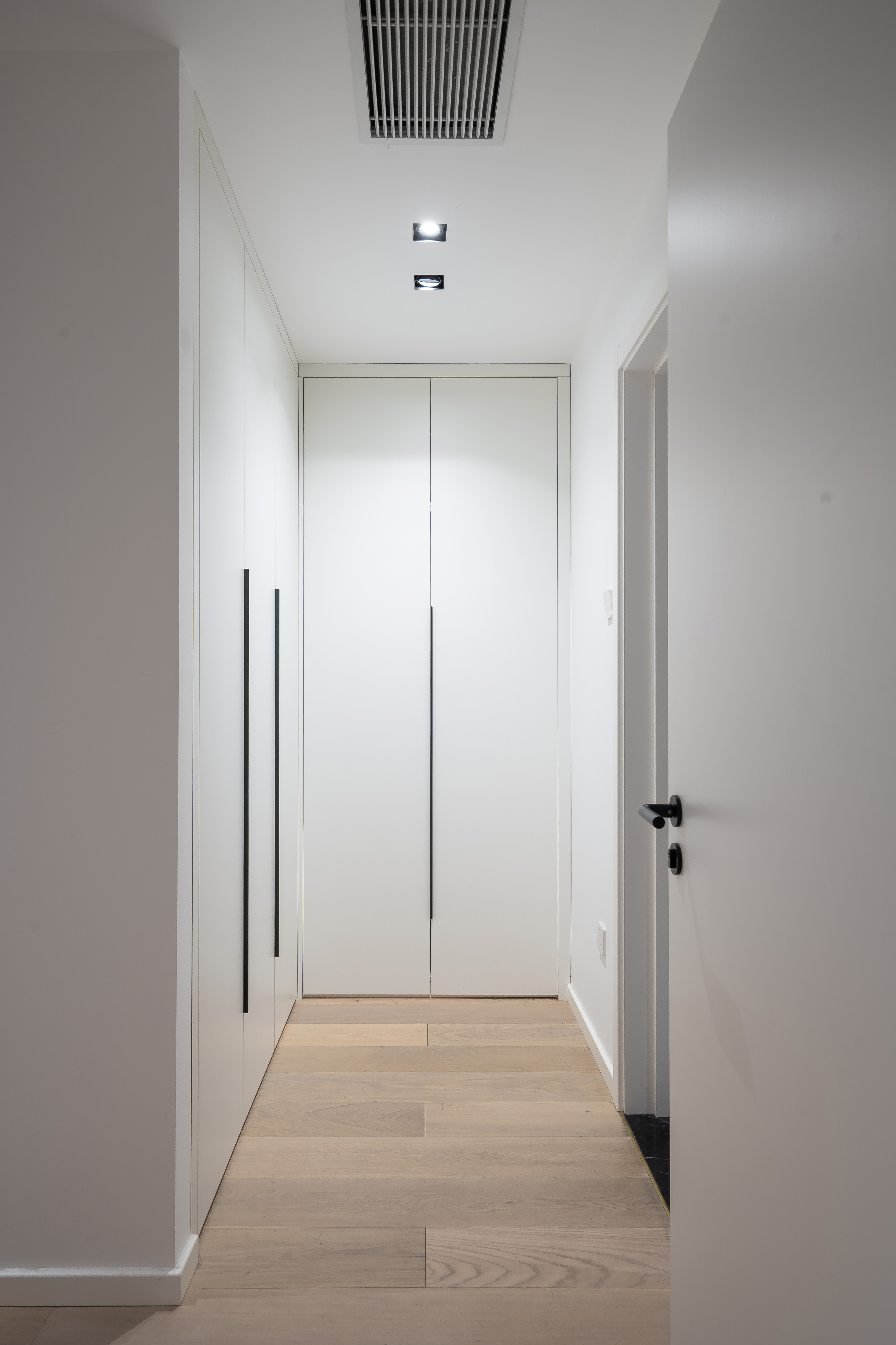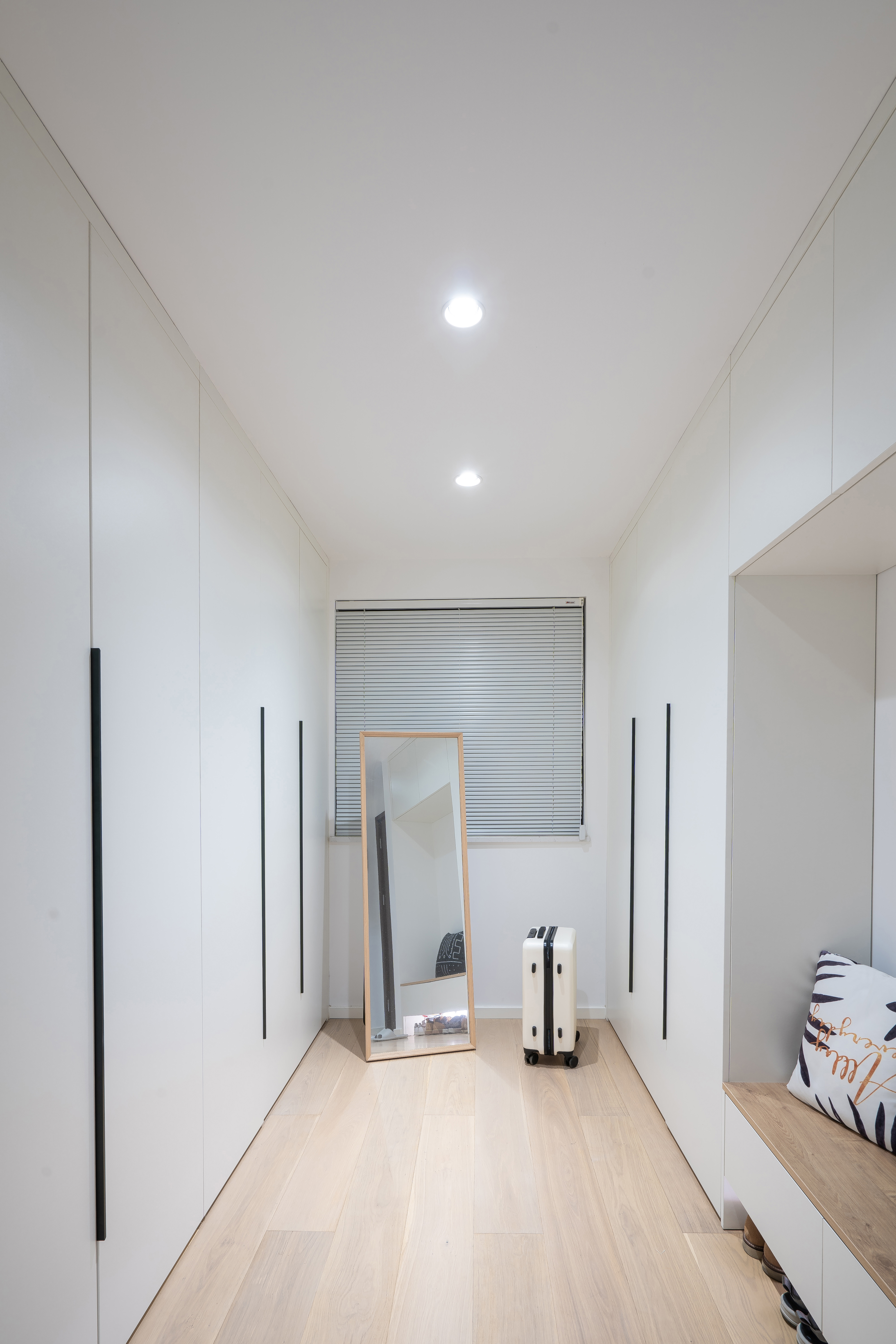 主卧单独隔出了一个小衣帽间,做了L型衣柜,白色一门到顶的柜门,搭配单条黑色长拉手。衣帽间上方做吊顶,用于隐藏主卧的空调。休息区没做任何吊顶,同样是无主灯设计,在床尾设计了两个单头射灯,加上床头两边小吊灯,这样一来,就降低了主卧的照明度,靠局部灯光打造休息区的氛围效果。