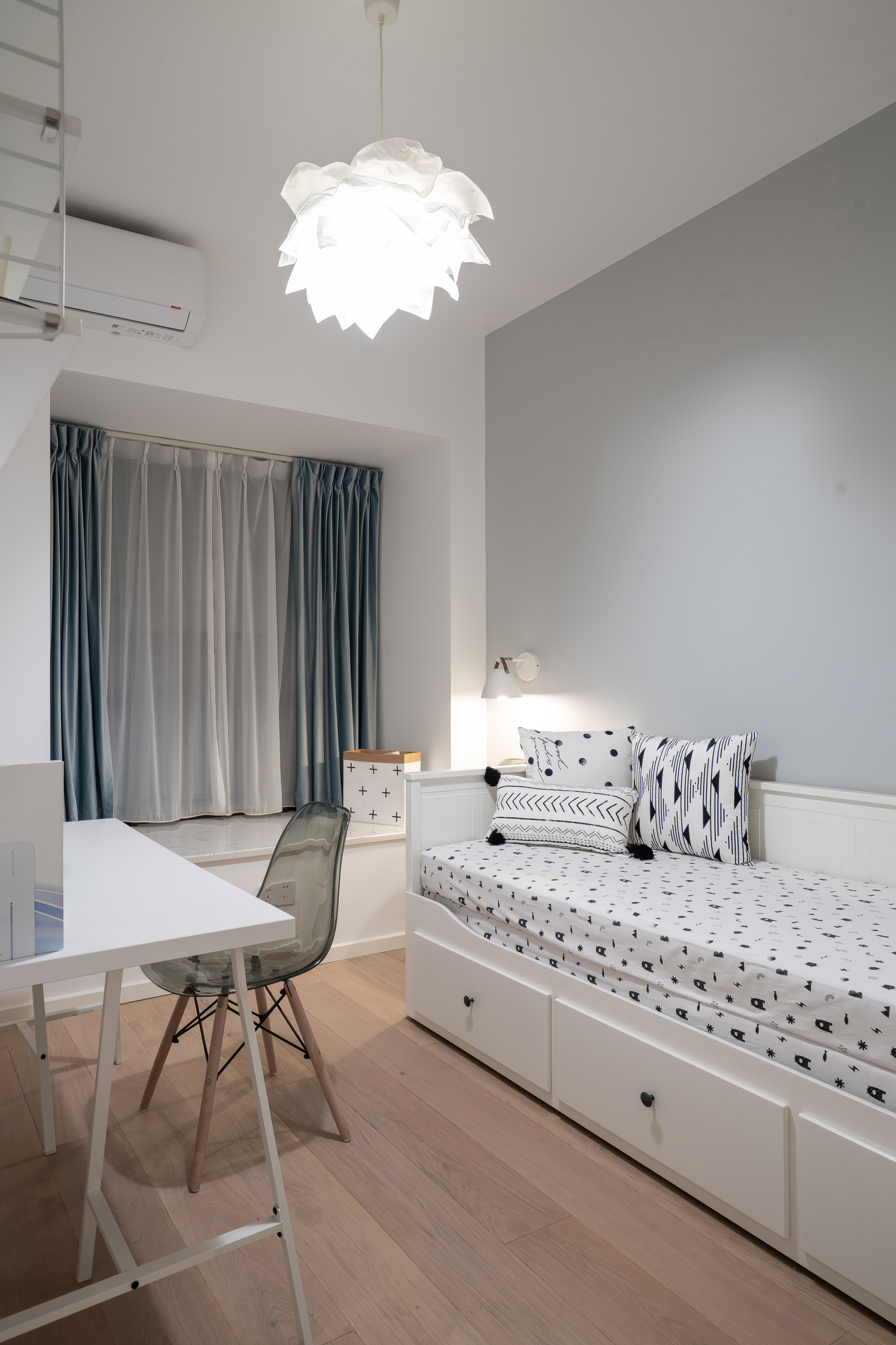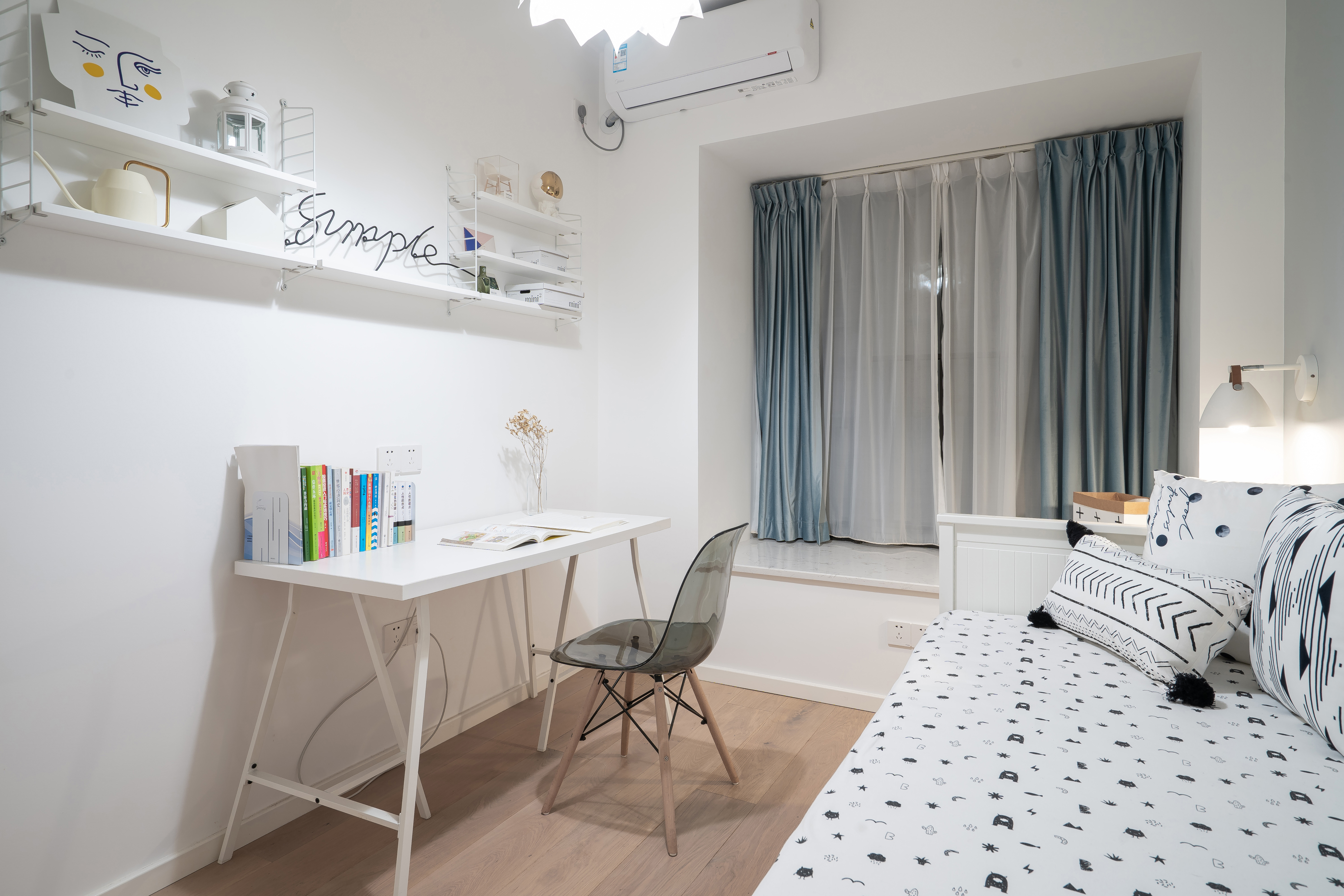 由于现在还没有宝宝,儿童房也设计了书房的功能,添置了一张宜家的沙发床,宜家的书桌椅,宜家的灯,颜值高,又实用。