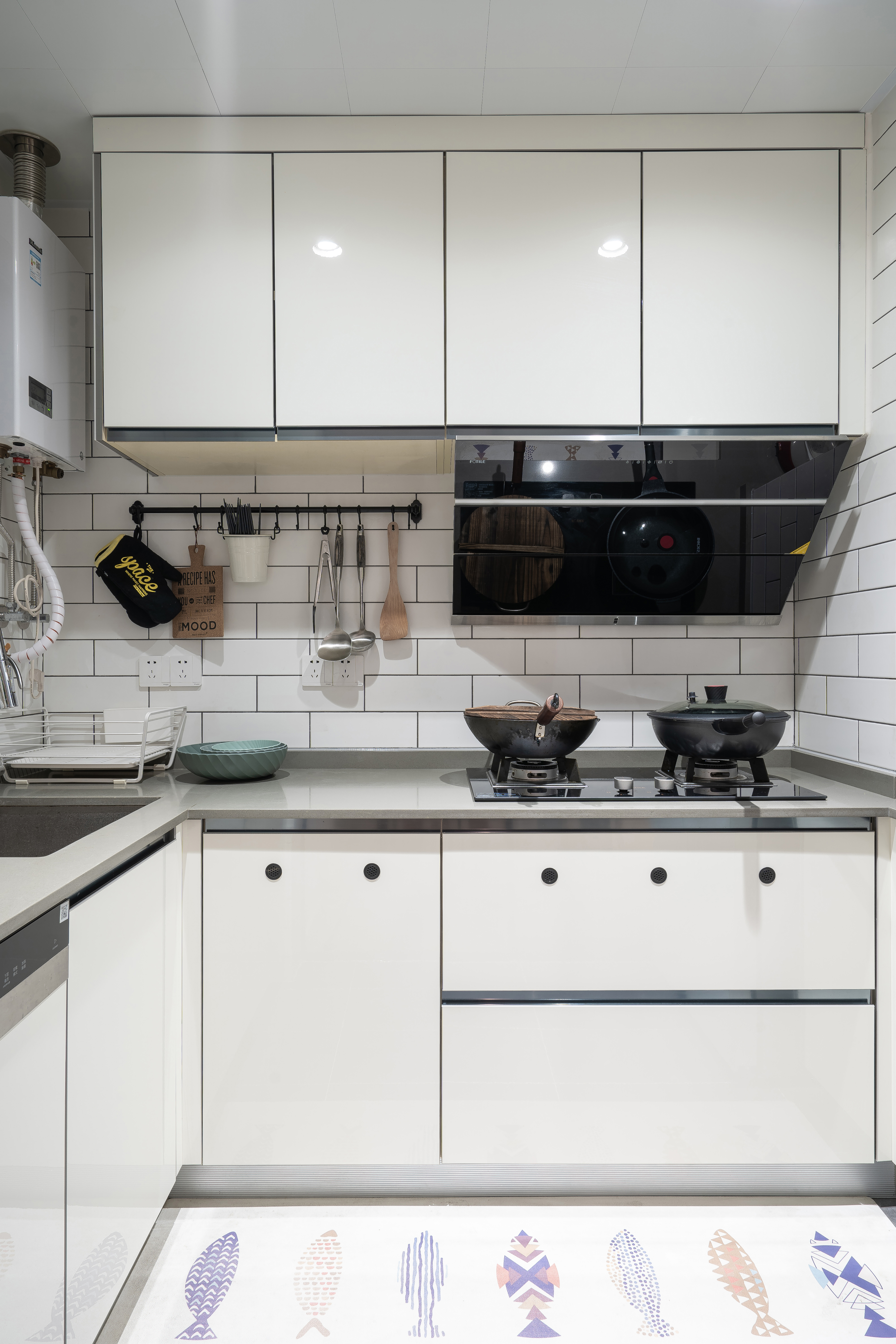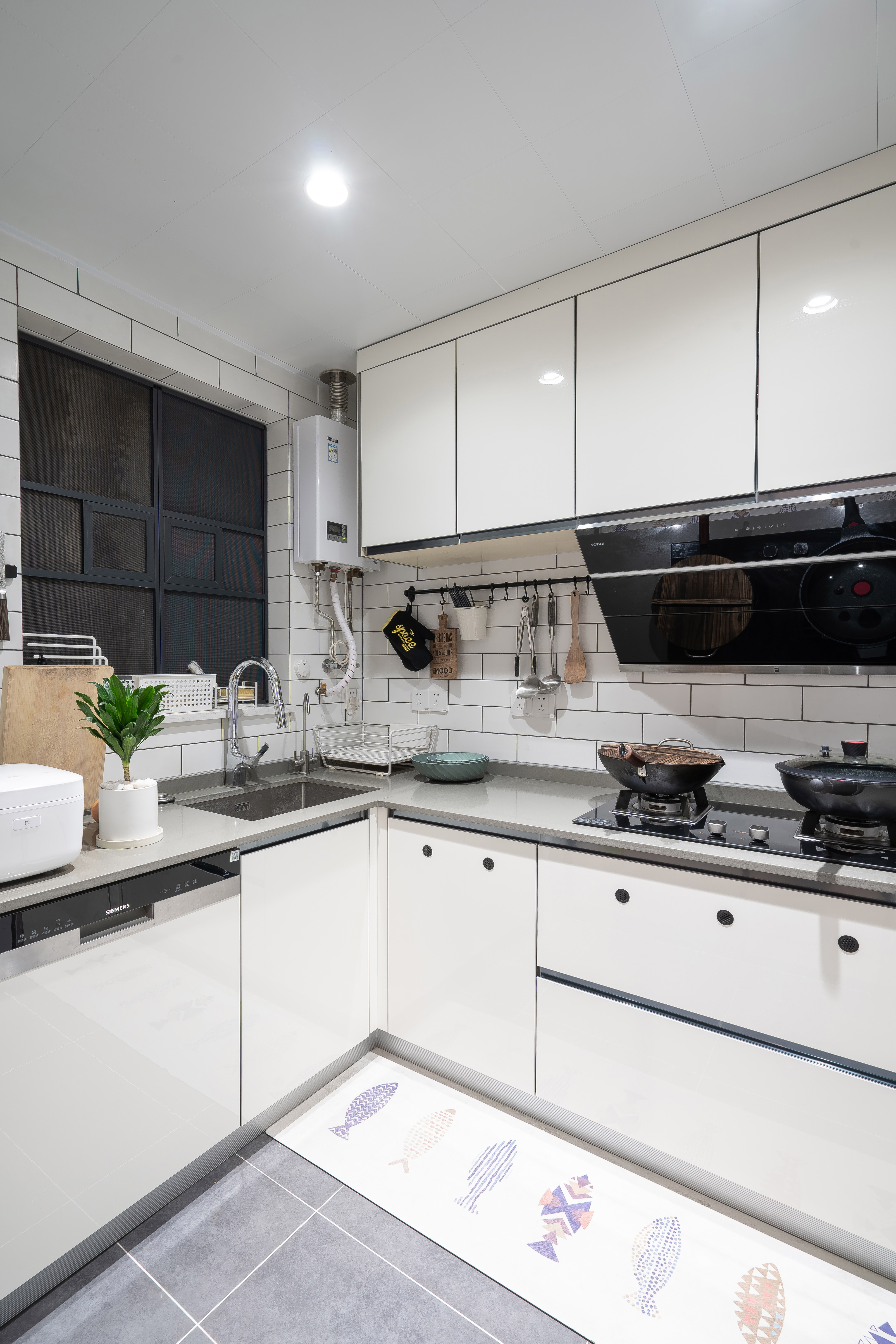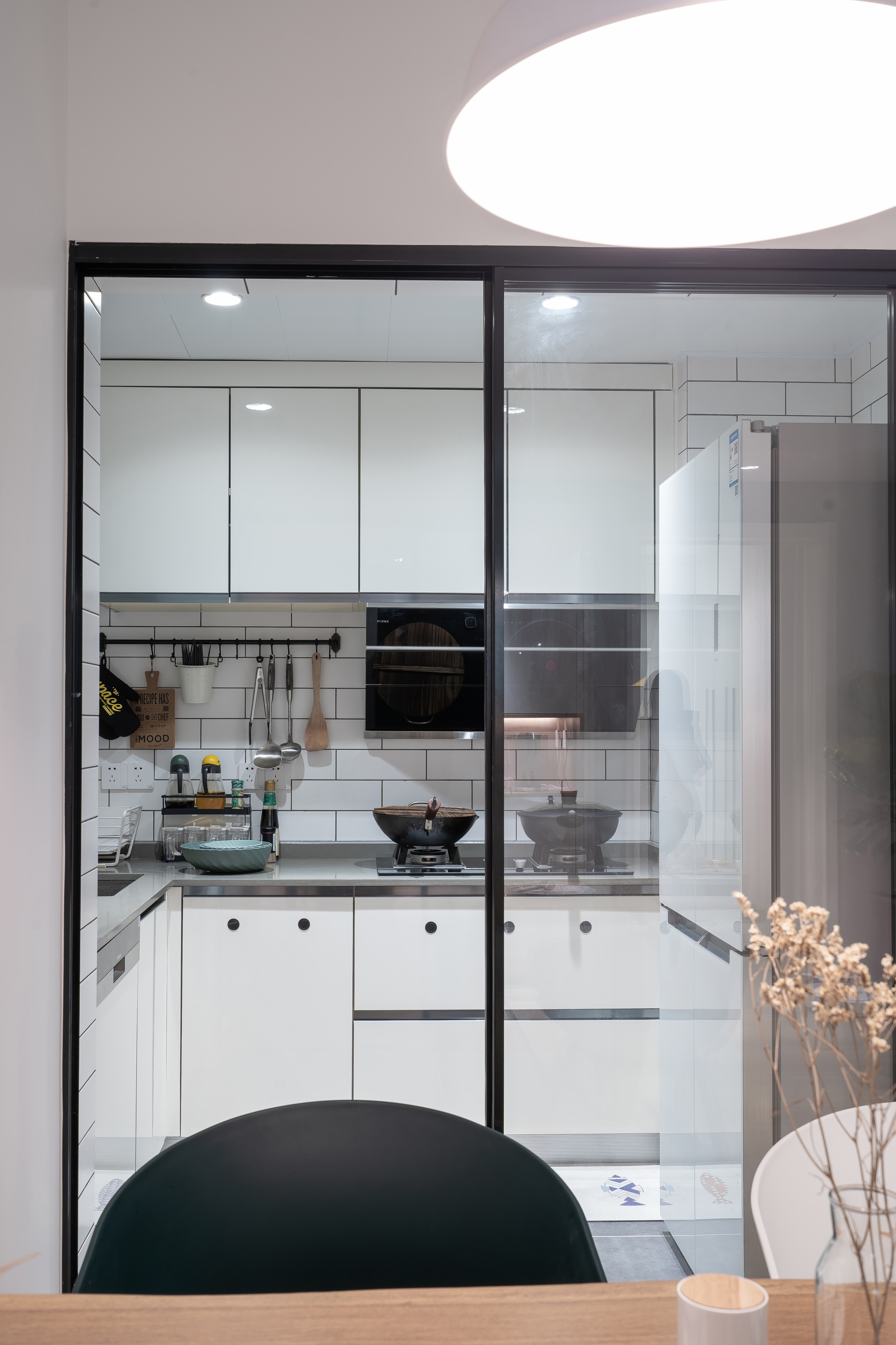 厨房门采用的是极细框玻璃推拉门,采用的是无门套,无地轨的做法,无门套无疑会让显得这个门更加简洁,无地轨即是做吊趟门,这样地面打扫卫生无死角非常方便。 厨房墙面贴的是长方形的真小白砖,用的铺贴手法是工字铺贴,这种贴法非常考验师傅的手工,但贴出来颜值超高也超百搭。