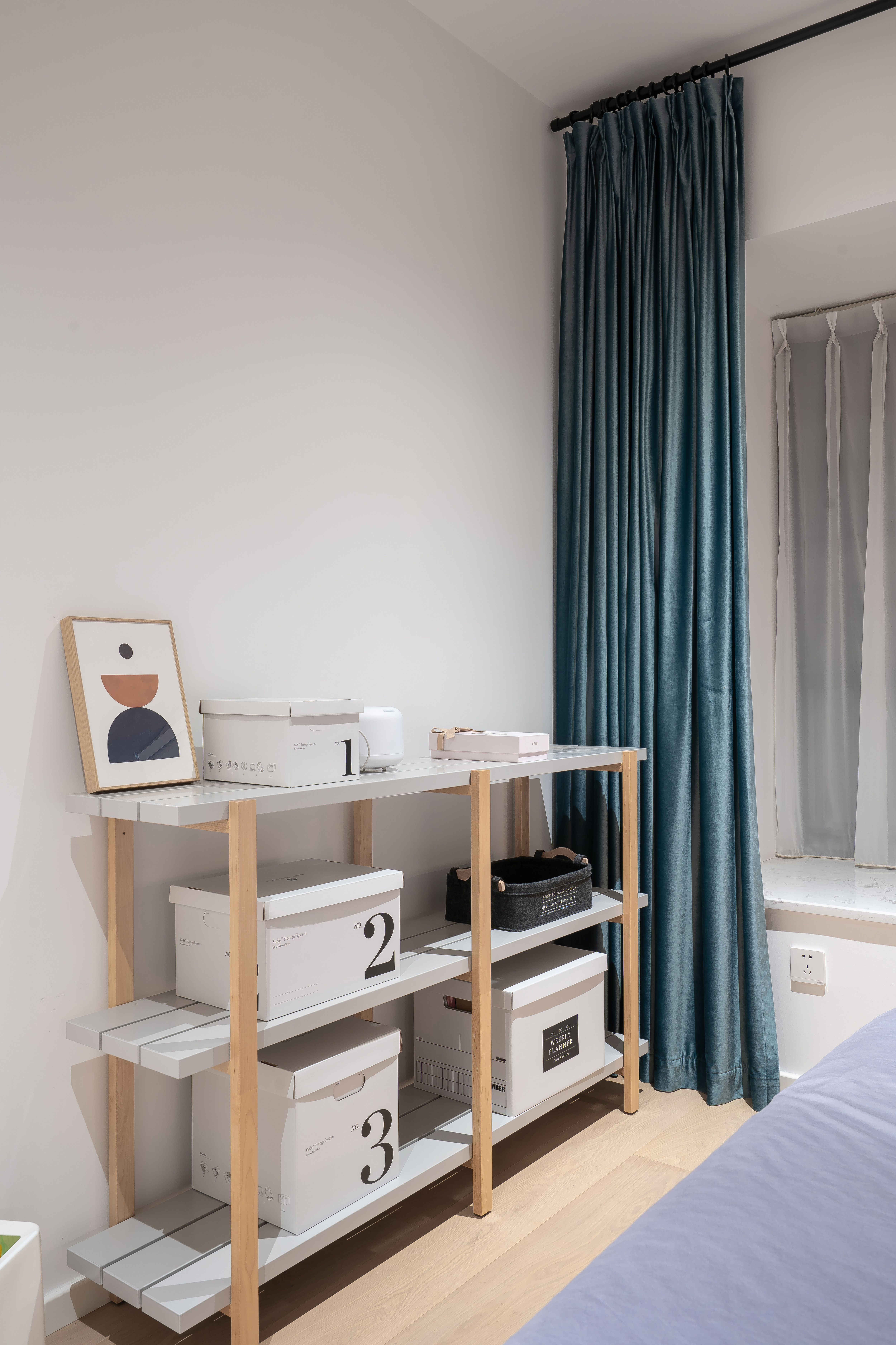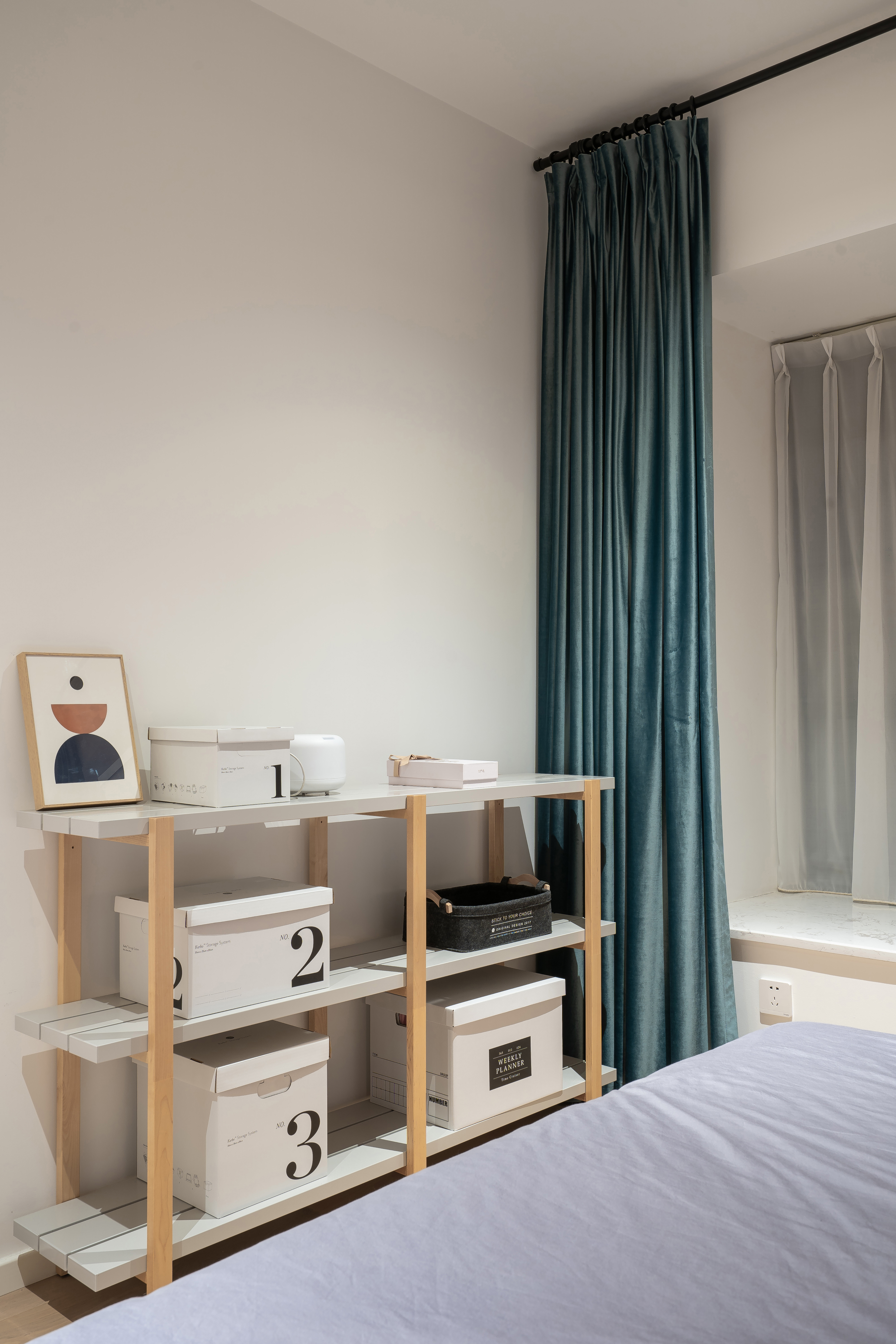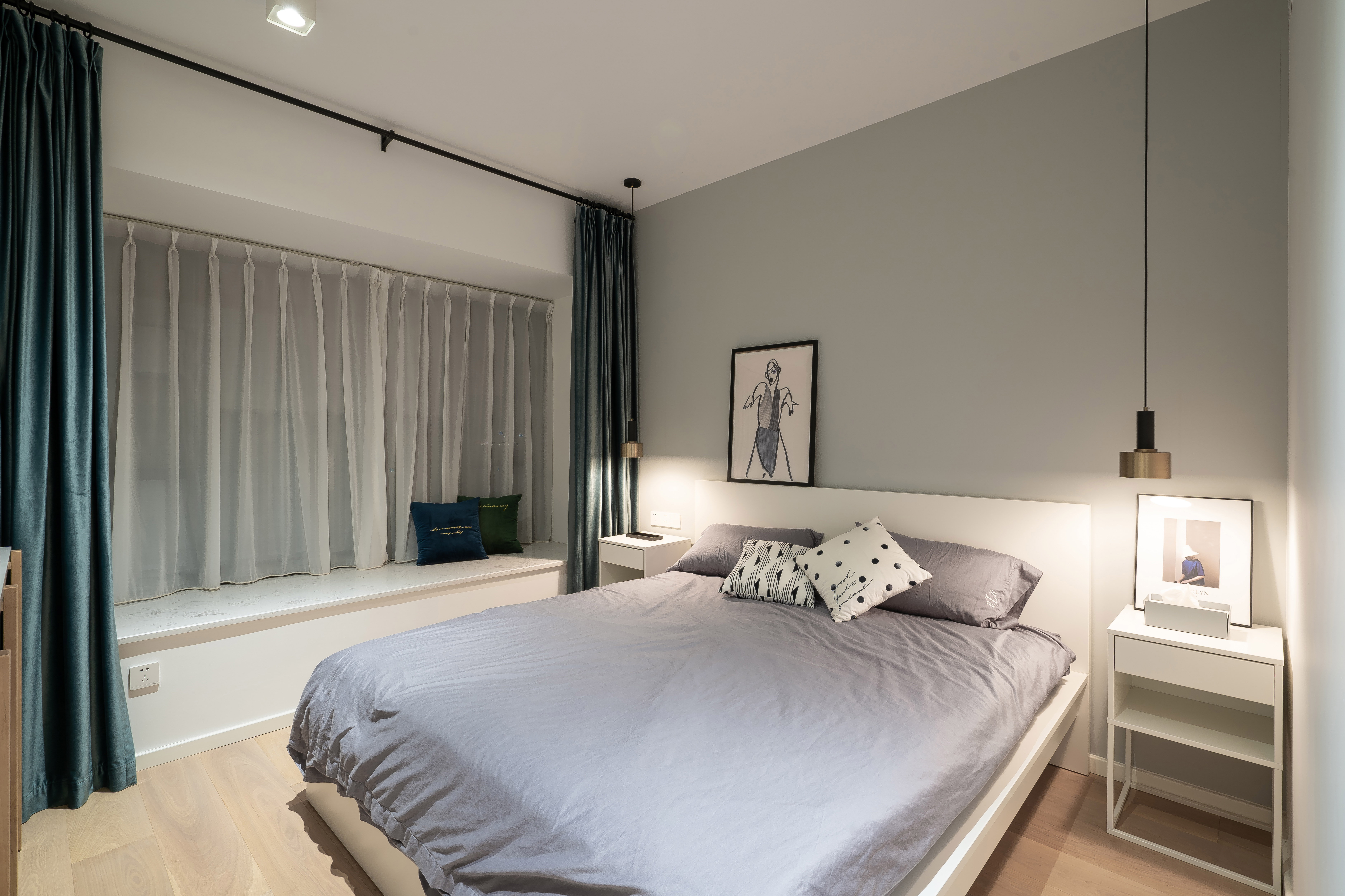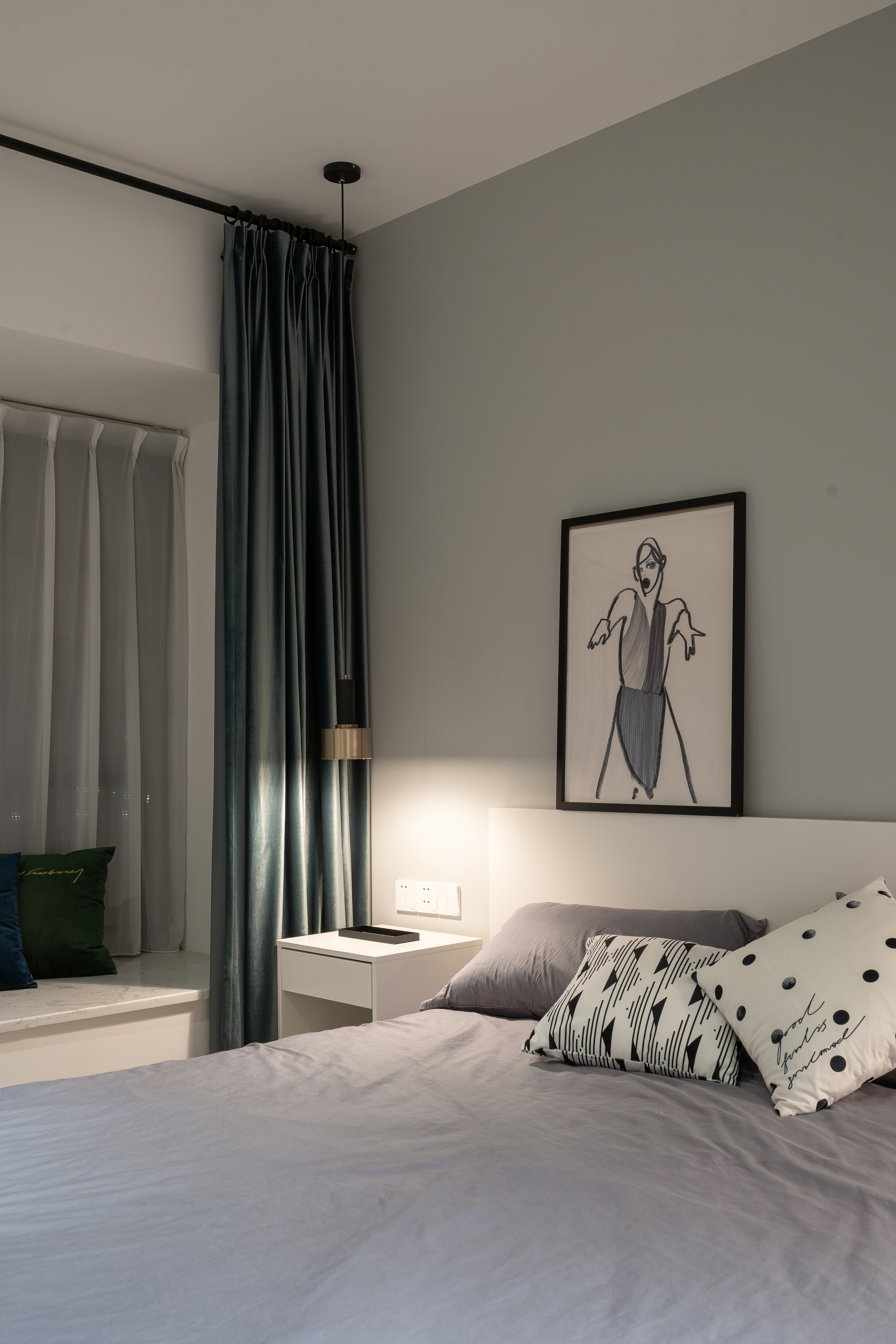 主卧窗帘采用的是丝绒材质,这个垂感非常好的材质如果只做在飘窗内,由于长度不够完全体现不出它的美感,所以我们将窗帘设计在了飘窗外,立马提升了高级感。