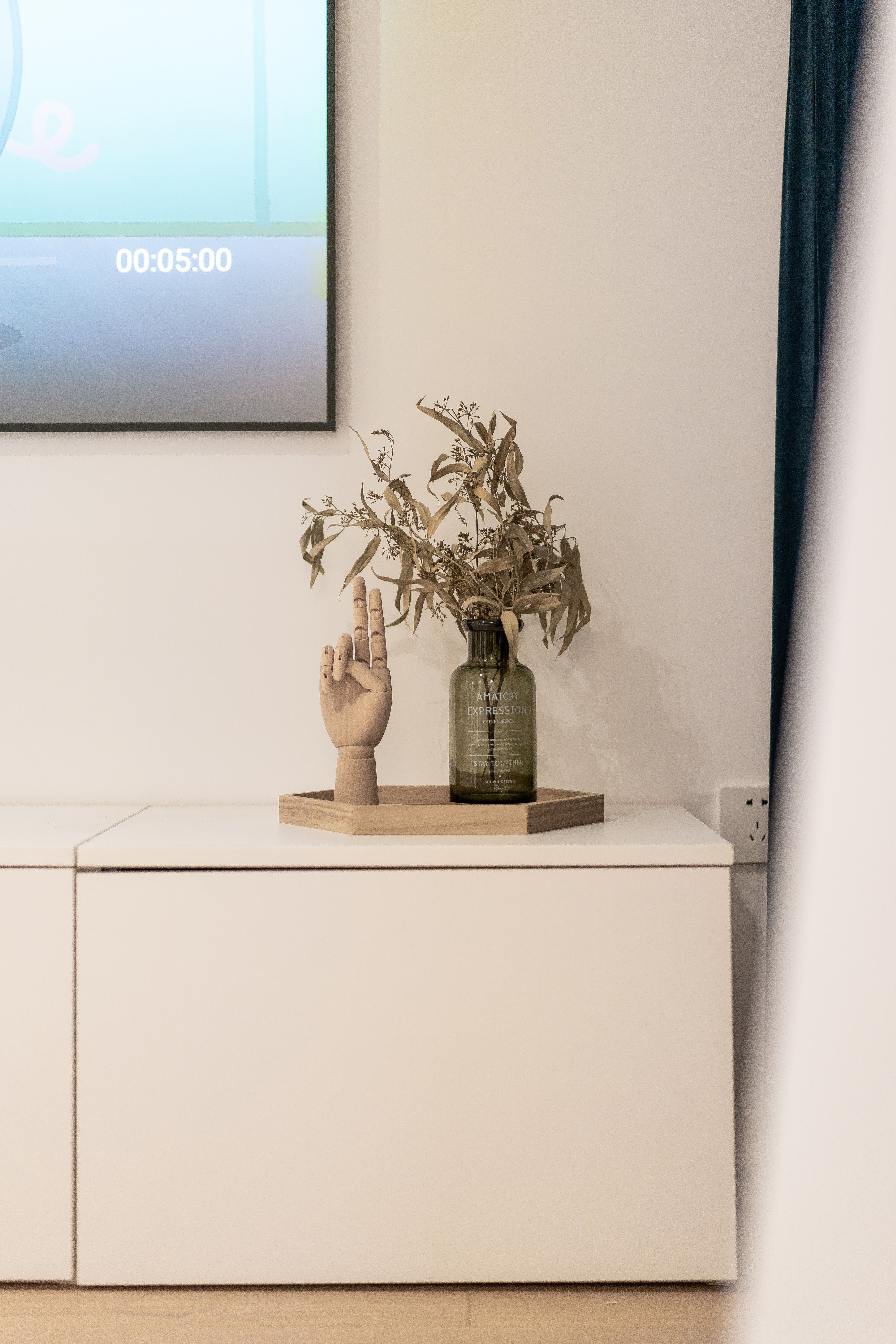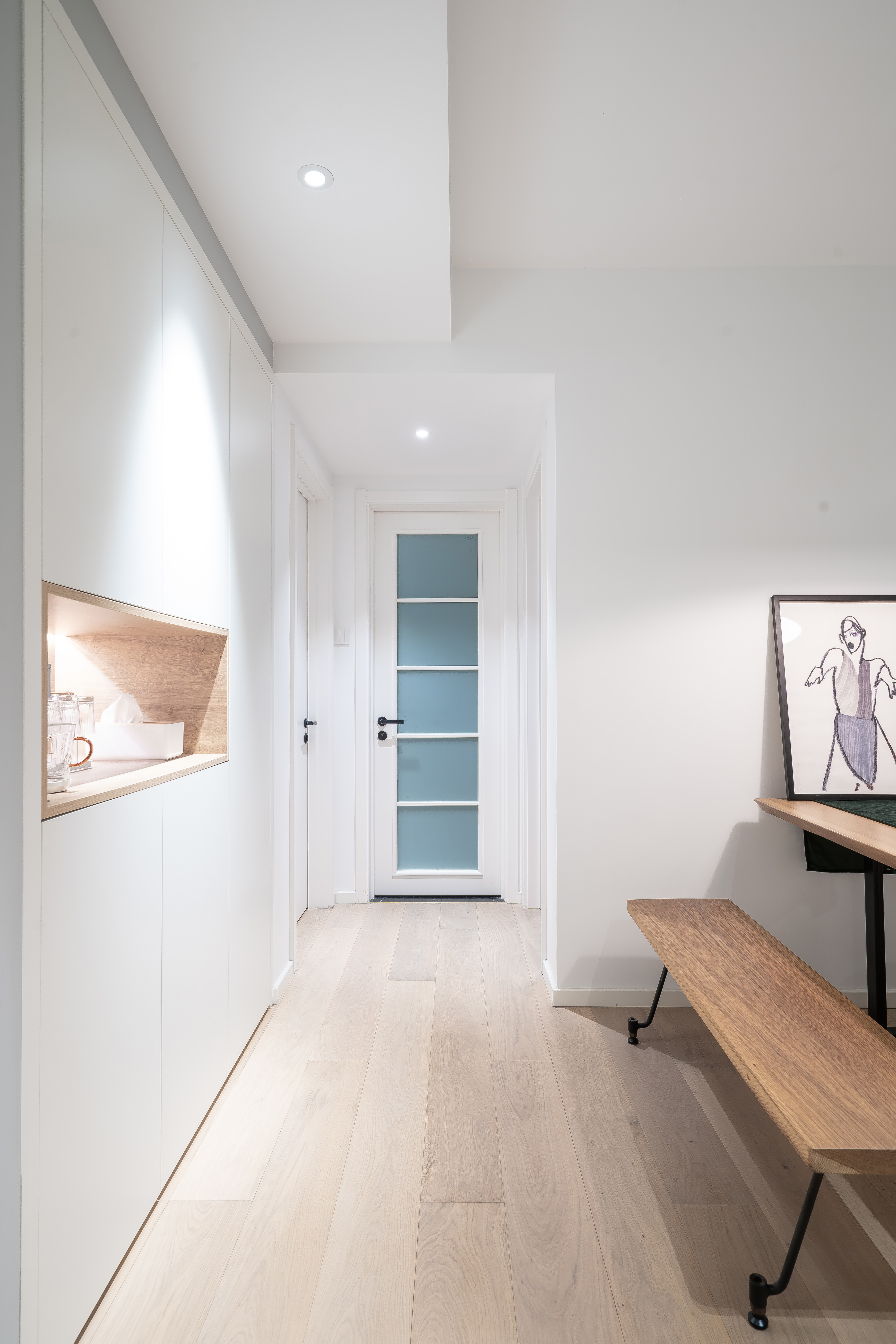 空间意境:进门是一条走廊,左边就是鞋帽间,两排柜子分别容纳了家中大量的杂物和换季的衣物鞋子,白色到顶的柜门,结合了换鞋凳的原木色,整个柜体显得简洁又不过于单调。 在玄关走廊的墙上我们设计了一块黑板墙,可以给未来的孩子涂鸦,或记录家庭温馨小事。