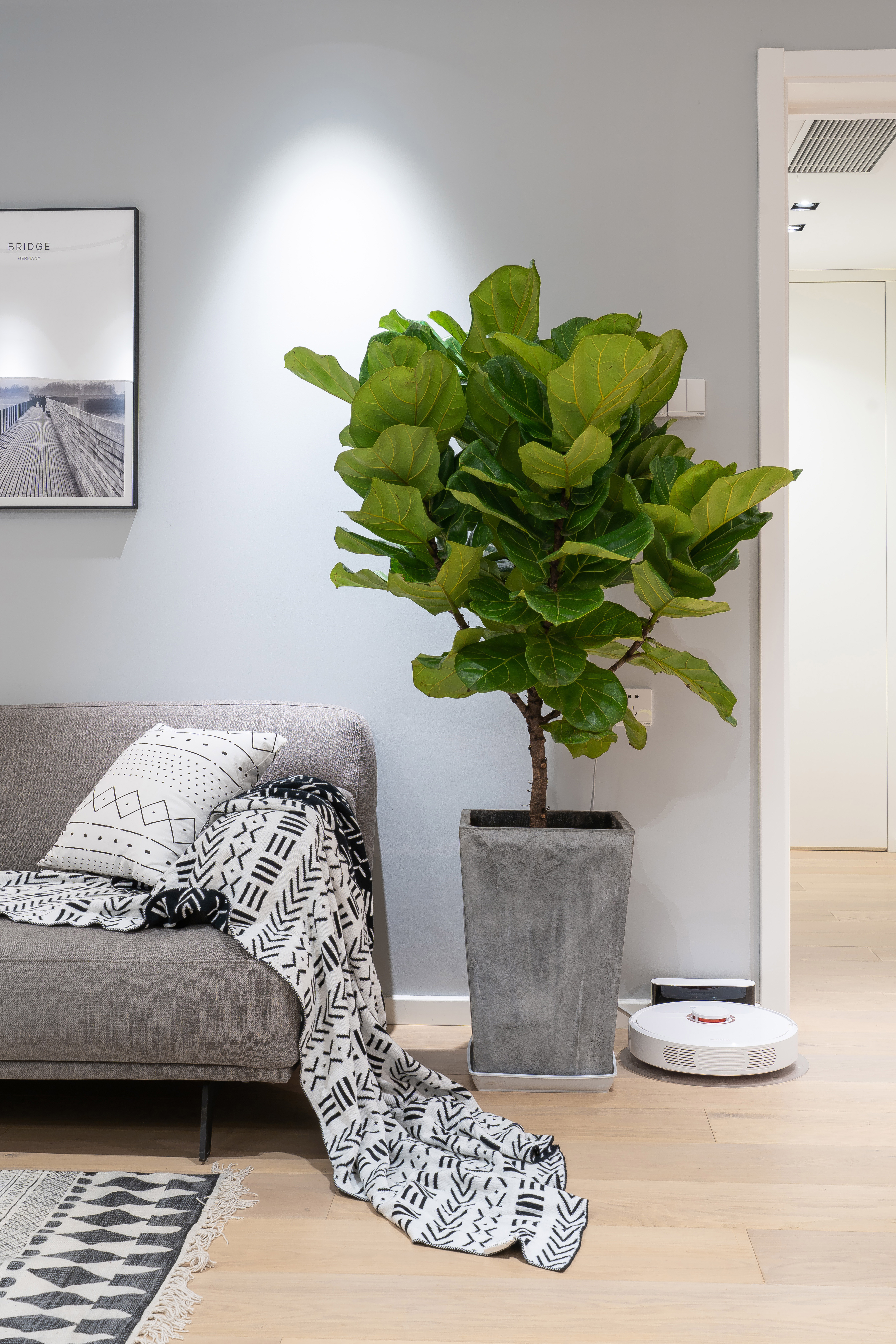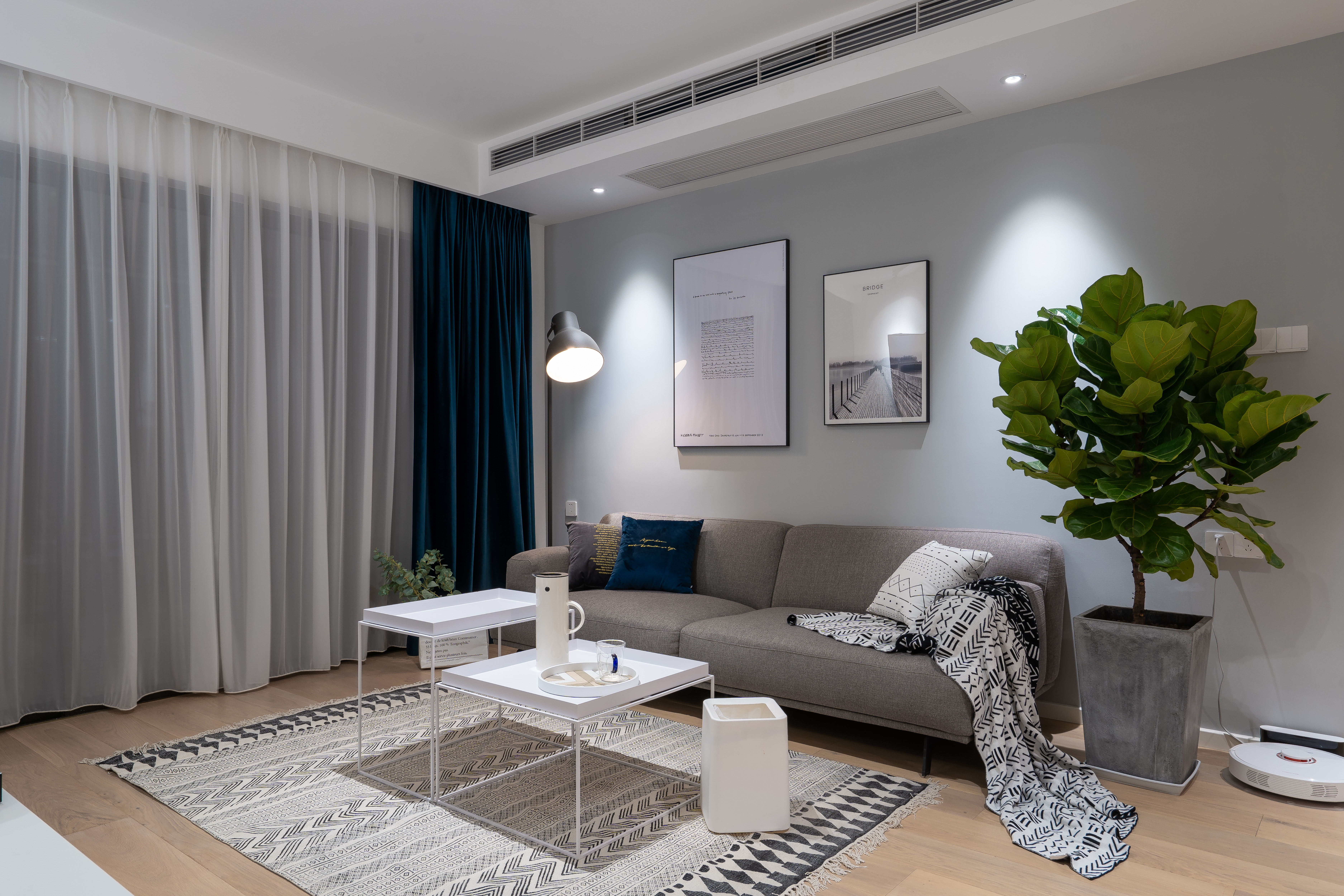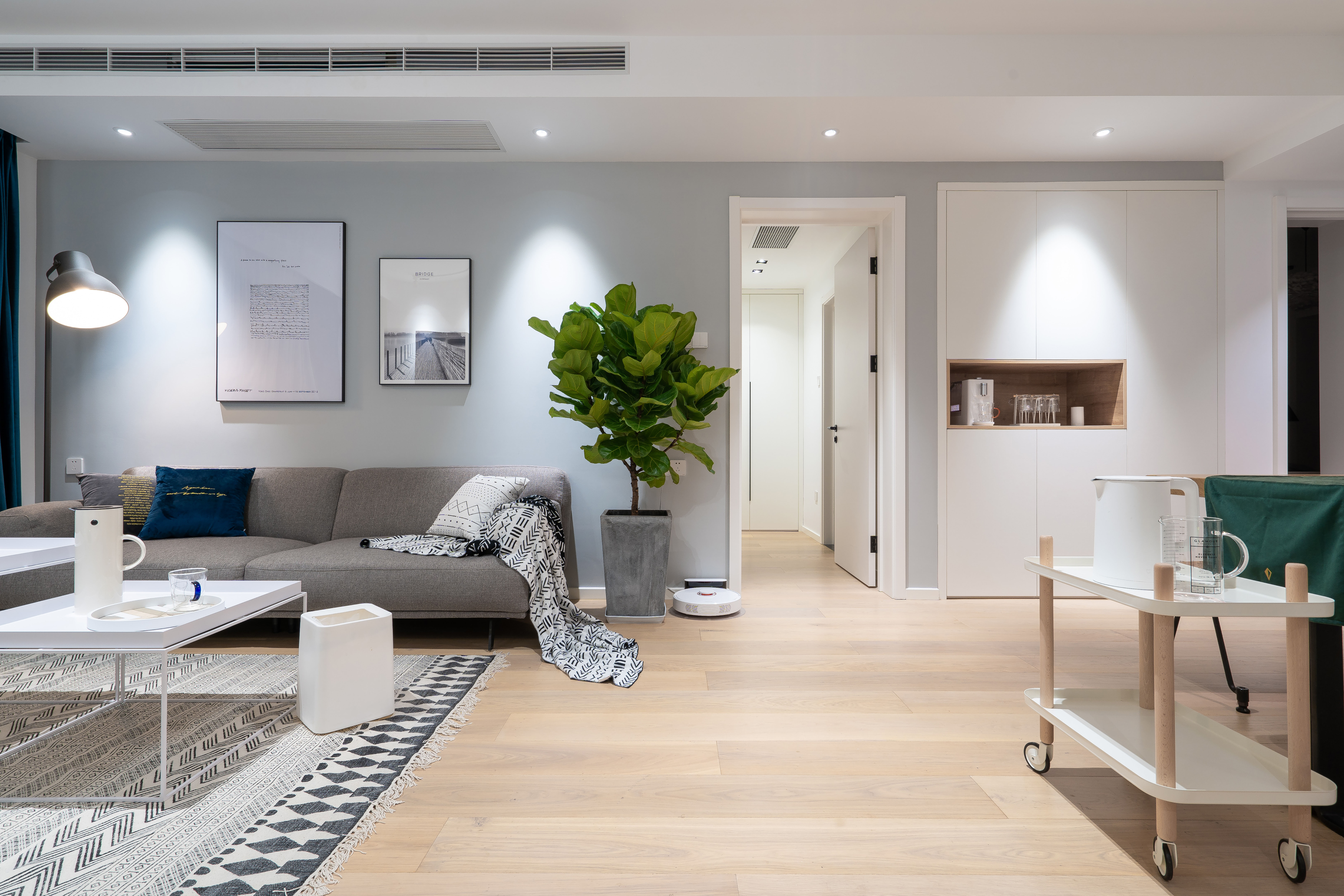 走过走廊就到了客餐厅,客餐厅是非常方正的长方形,非常地舒适宽敞。 暖色的木地板搭配浅灰色的墙面,再点缀上琴叶榕的绿色...以浅色调来缓解主人工作一天的压力与疲惫。客厅沙发上方做了一长条单边吊顶,用于隐藏空调风管机;并没有多余的天花,采用无主灯设计,以明装暗装和轨道射灯来打造 -