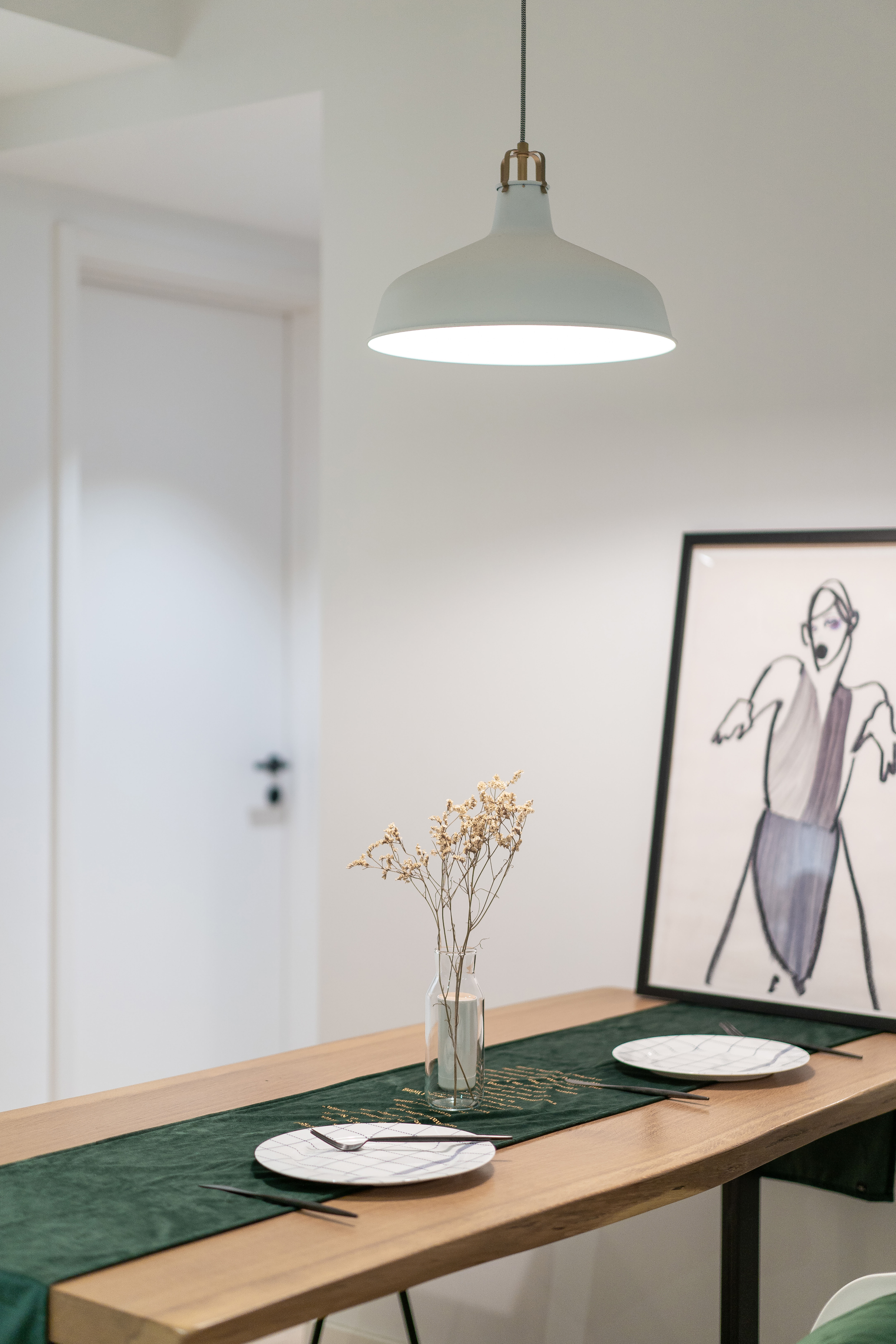 走过走廊就到了客餐厅,客餐厅是非常方正的长方形,非常地舒适宽敞。 暖色的木地板搭配浅灰色的墙面,再点缀上琴叶榕的绿色...以浅色调来缓解主人工作一天的压力与疲惫。
