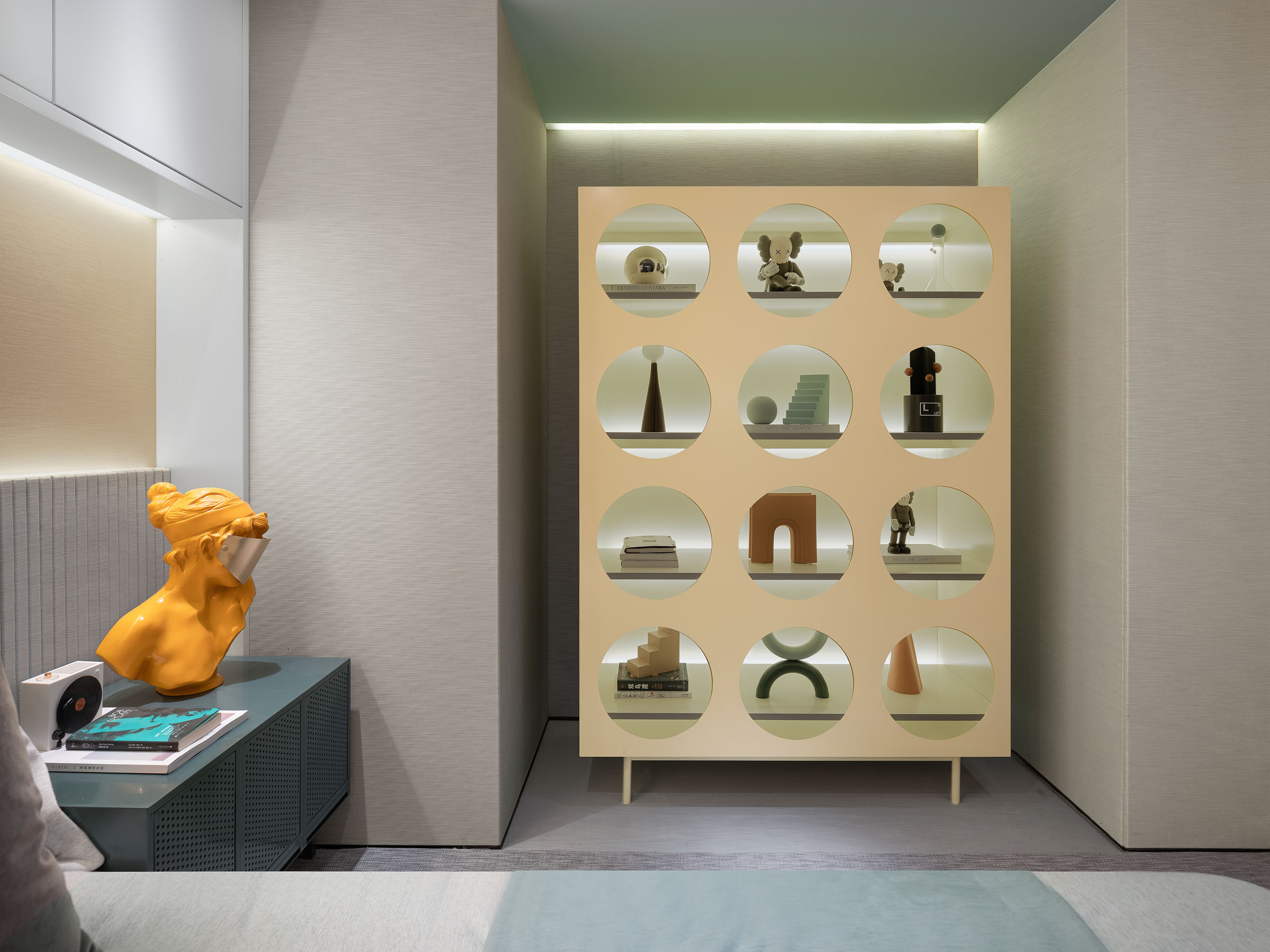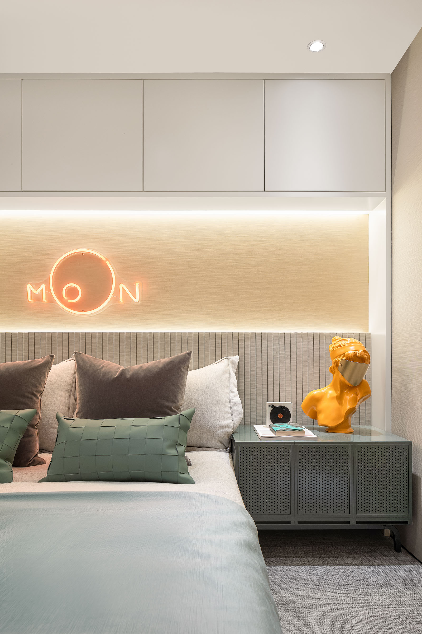 空间意境:熟悉的概念以难以预期的形式出现在熟悉的情境里。绿色总能够让人和大自然产生关联,汲取山川中的微风,舒缓放松,布置出永远有新鲜感的家。渐变墙纸增加空间的趣味性,清新不腻,演绎出了独特的设计语言。