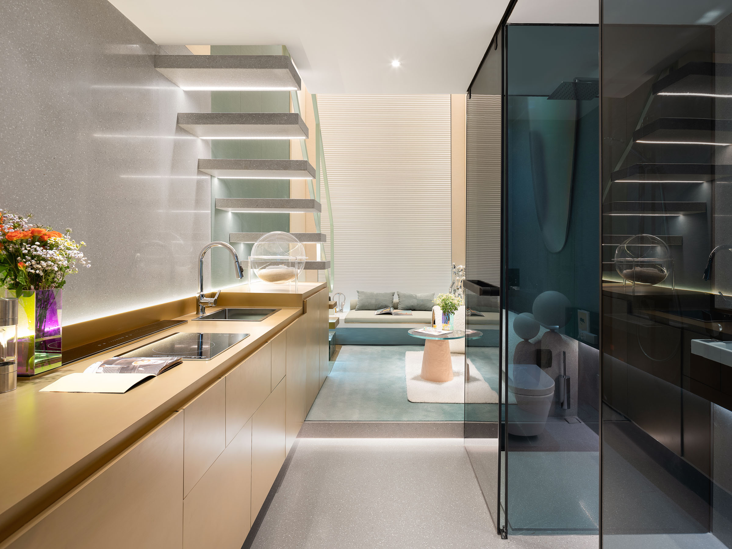 设计选材:厨房在工业风的基础上,通过艺术装饰增添了空间的软化感,金属感充斥整个空间,暗银色让整个空间酷冷沉静。利用家具的折叠功能,将抽油烟机隐藏,让厨房变吧台,更增添空间整洁感。
