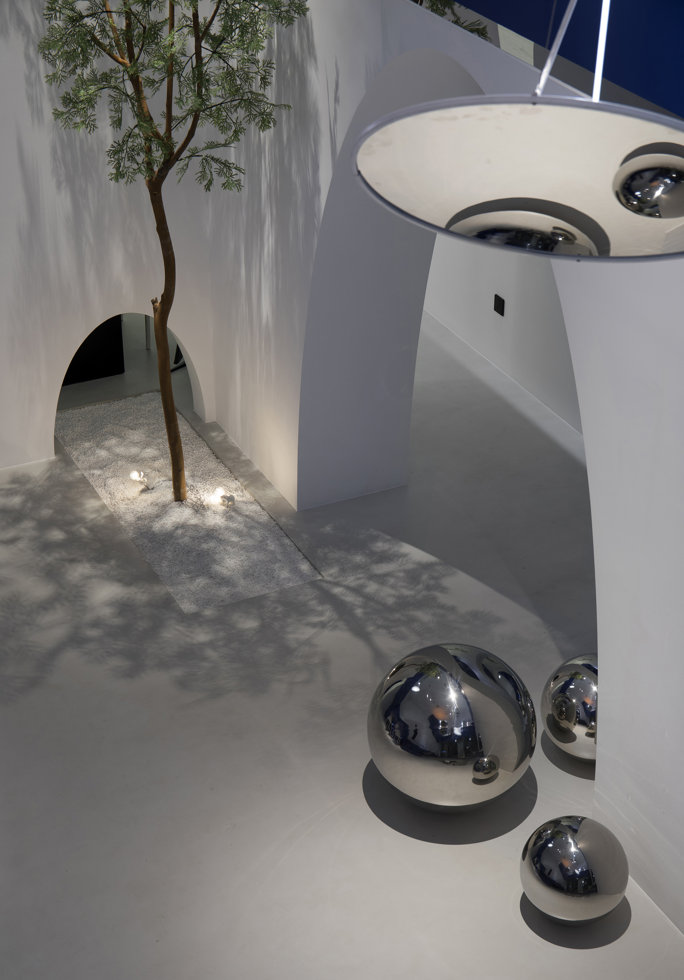 一眼望去,那棵绿植吸引着众人,相较于传统的大面积绿植而言更有韵味,这或许更好的体现了少即是多。镜面玻璃球的运用,让人从球中窥视了整个空间的全景,充满着趣味性。