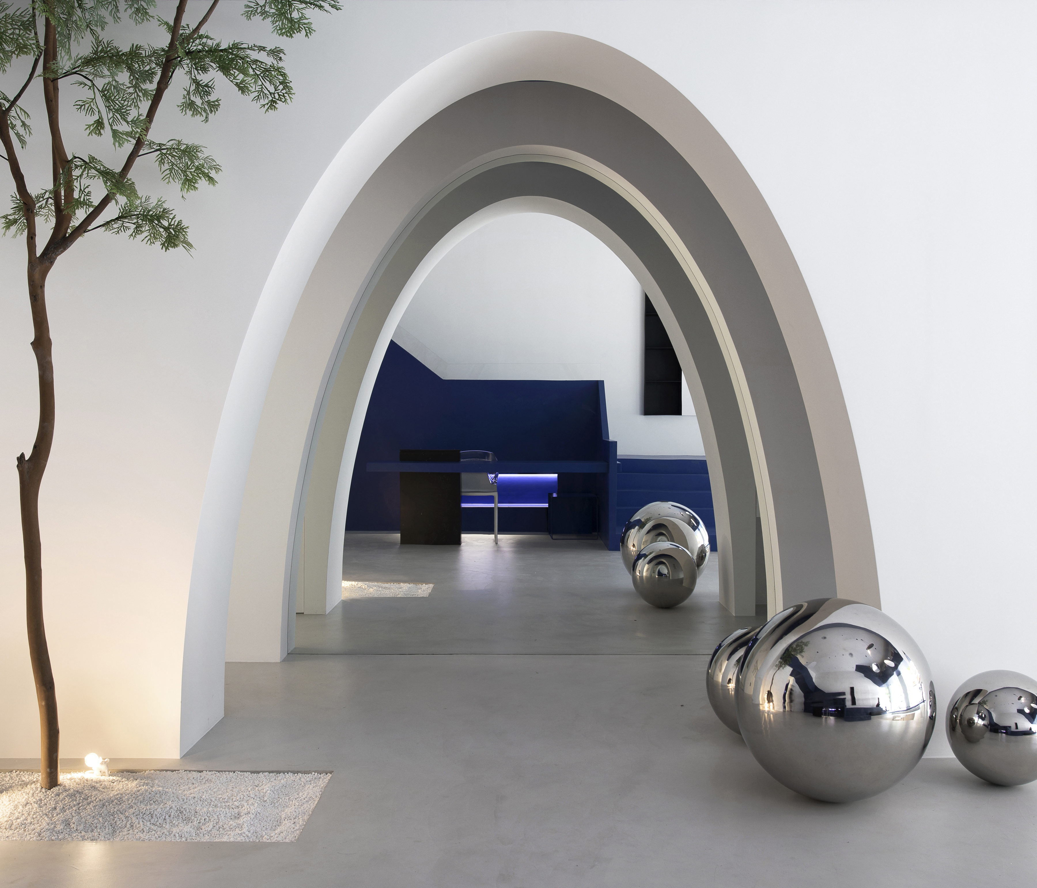 周边的圆弧形门洞,顿然使直线形的空间,有了柔和之感。门洞内的大片镜面的处理,让空间延展,仿如盗梦空间般,无形中将空间放大数倍。