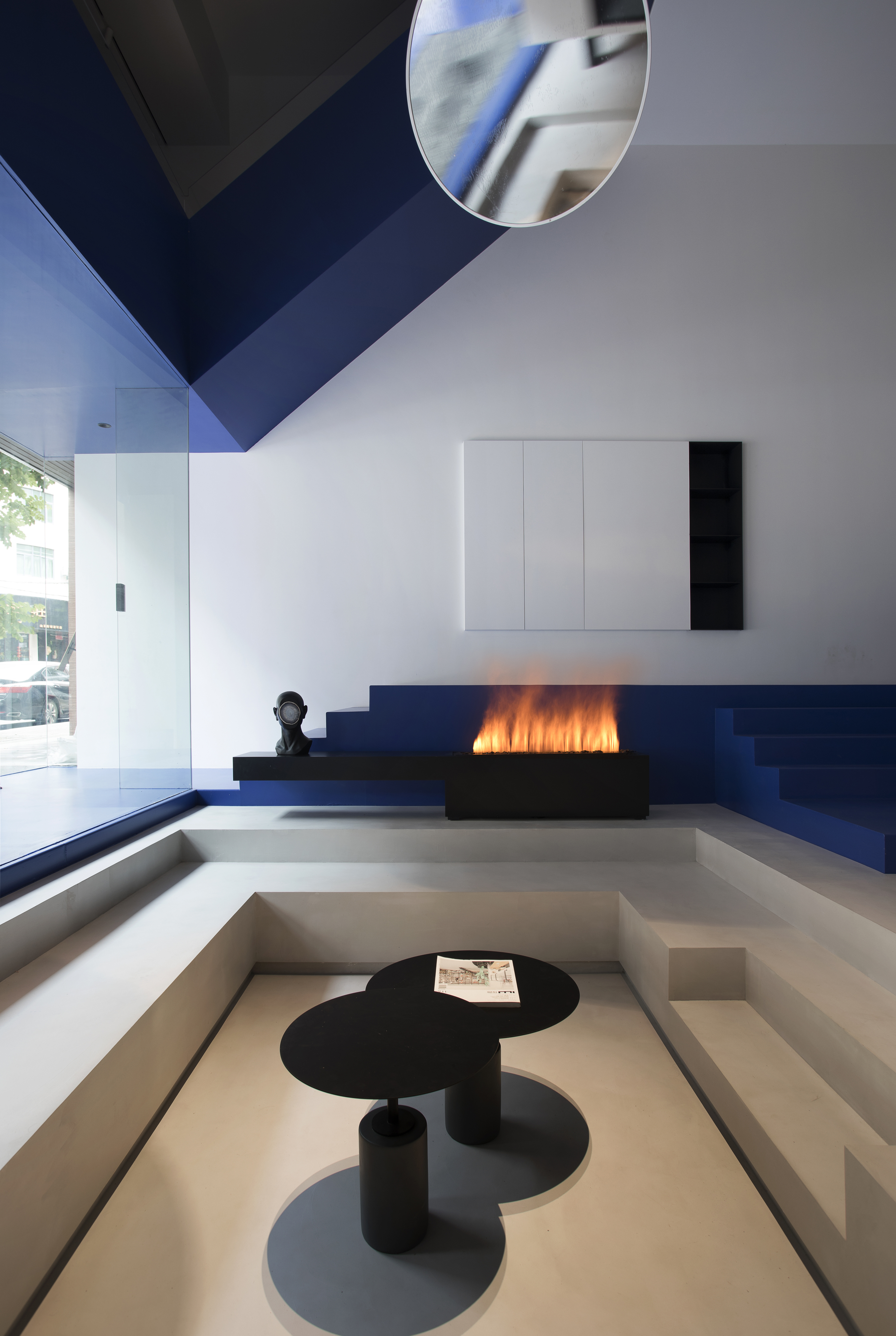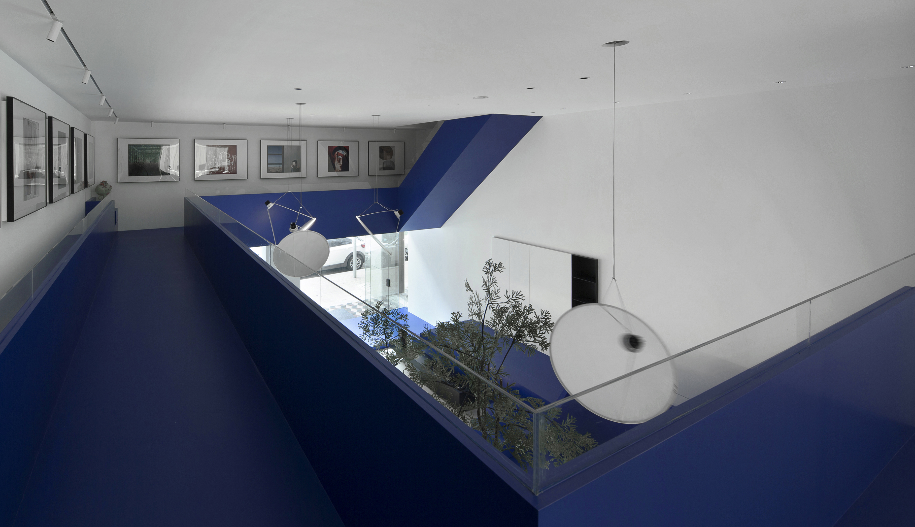 空间布局:向后退让的灰空间,并非隔离而是模糊了室内外边界,更多是在于拉近外部行人与室内空间的交流。从遇见、步入、安坐,一切的发生都在诉说着人与空间的融合。你可以在心里任意的定义它的存在意义和功用,它的存在自然、自由,充满想象。艺术来源于生活,生活是艺术的本质。设计者将蓝色的楼梯同艺术长廊做结合,这点让人印象深刻。行走于此,如同置于艺术馆的一角。值得一体的是,画是可以翻开的,里面可以放置书籍或材料样板,完美的实现艺术与功能的重合,再造。