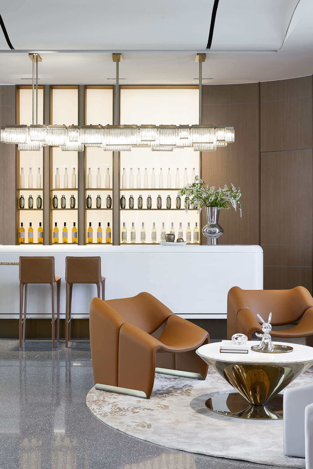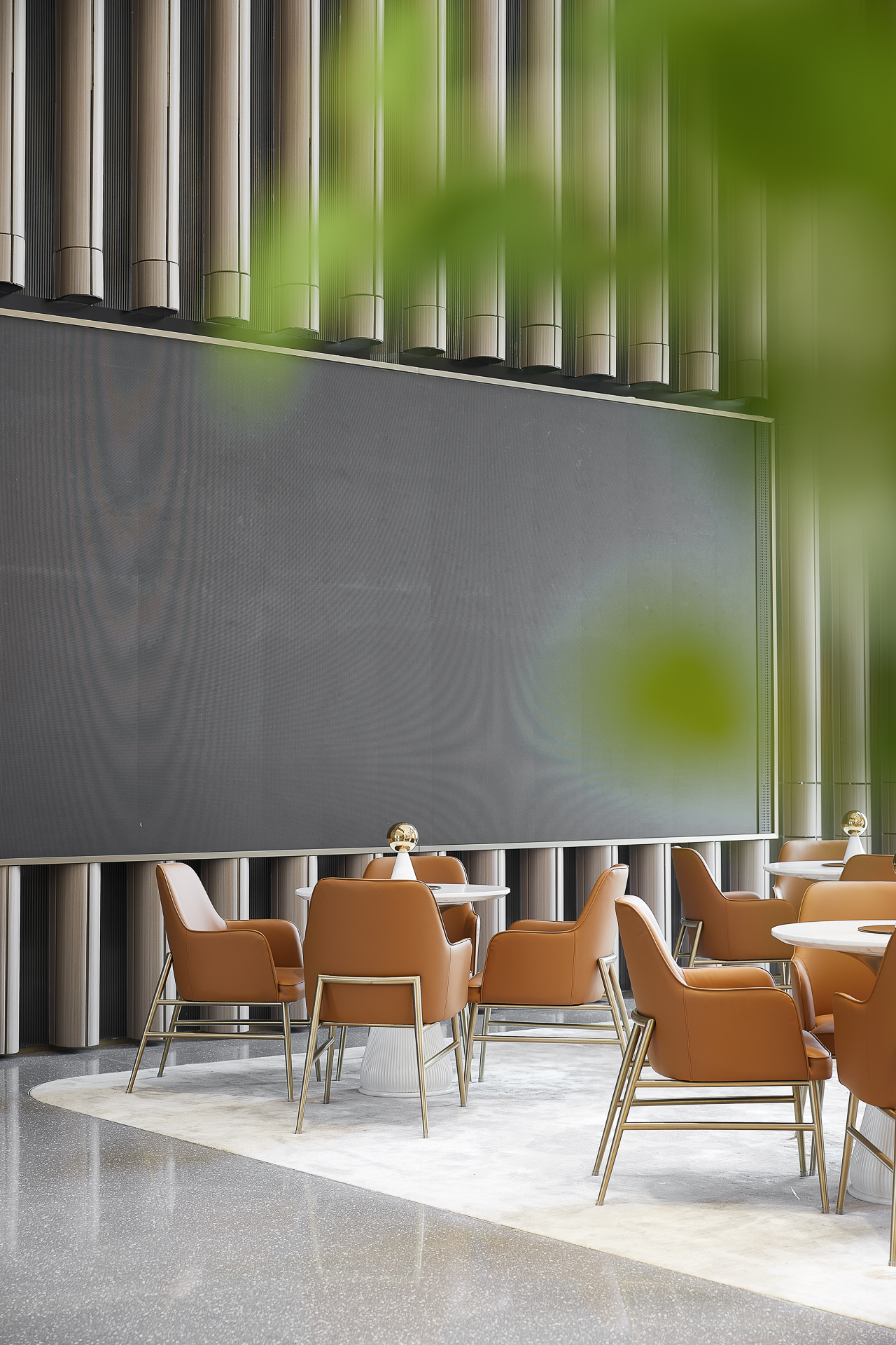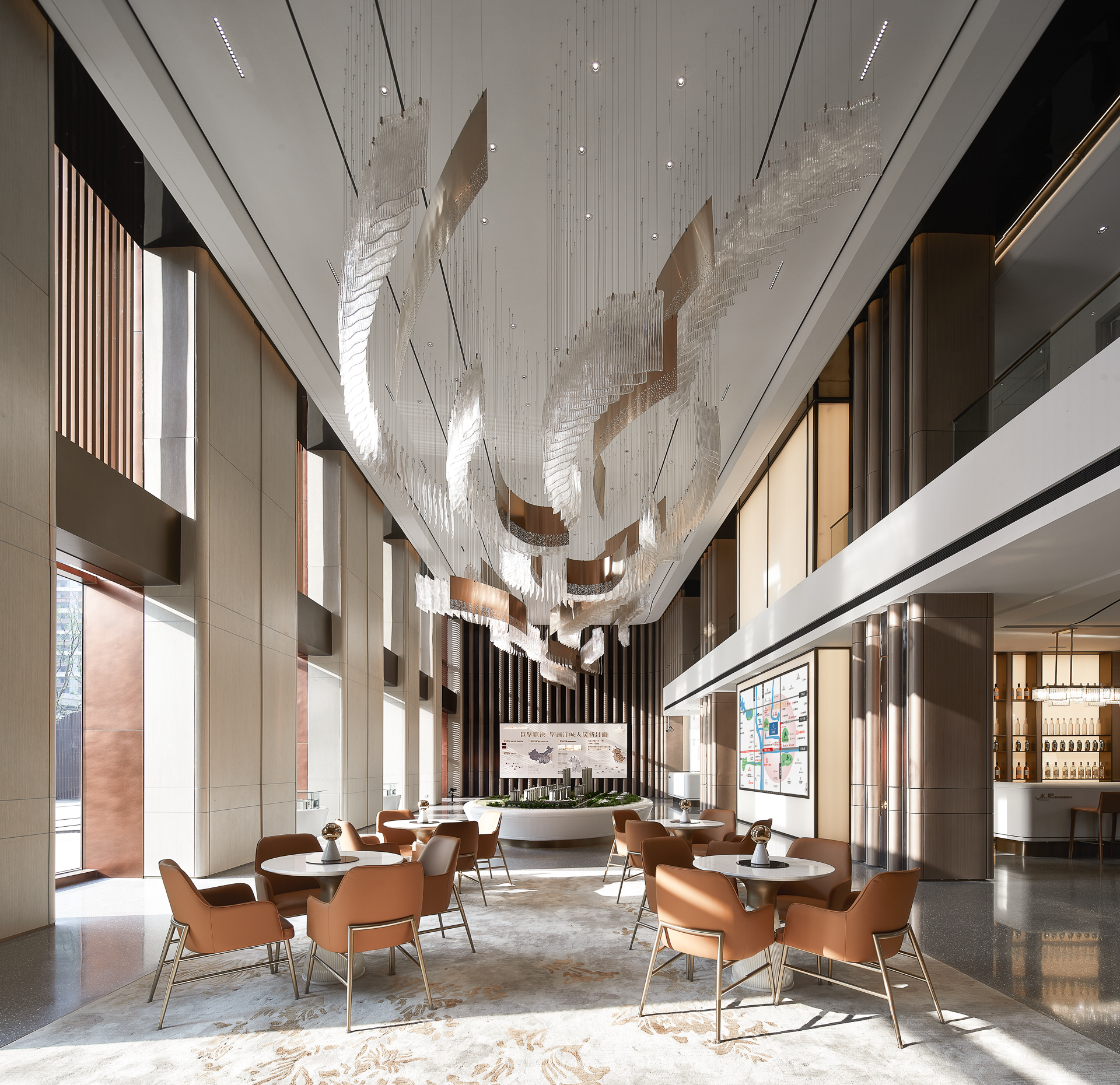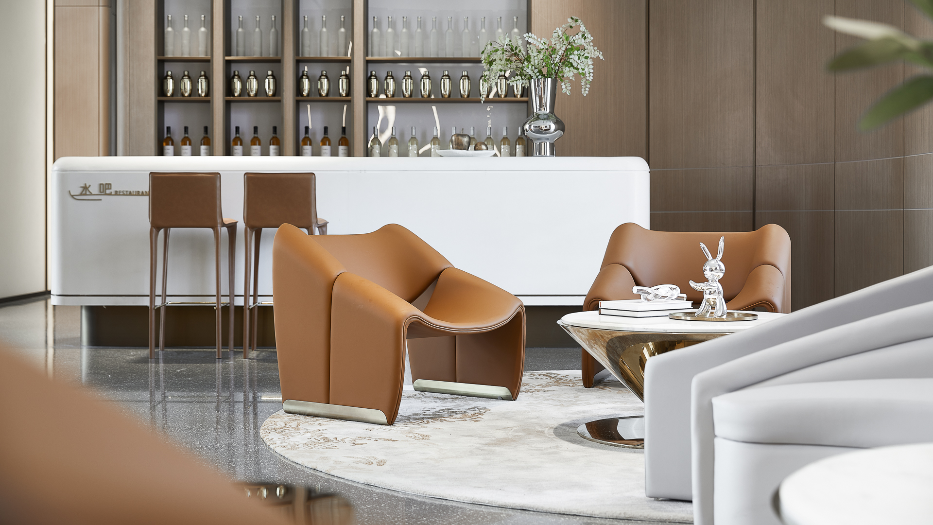 设计选材:以咖橘色系列家具为基础搭配,配以爵士白大理石、金属材质,局部点缀现代艺术小物,围合出清雅自然、舒适惬意的交流氛围,塑造出良好的初印象。一步一美景,艺术品以芜湖之水流动的形态为构想,作品最终以不锈钢、玻璃钢材质演绎出水的灵动之美。