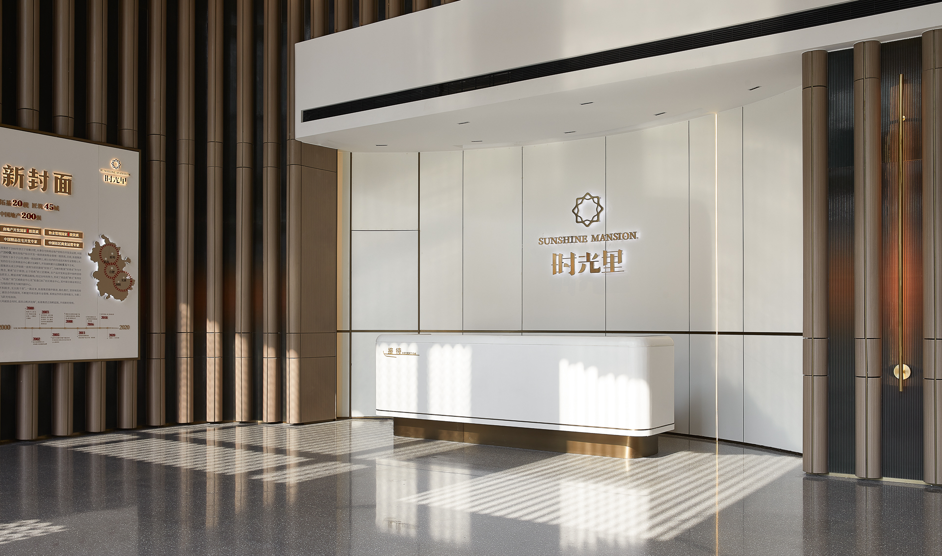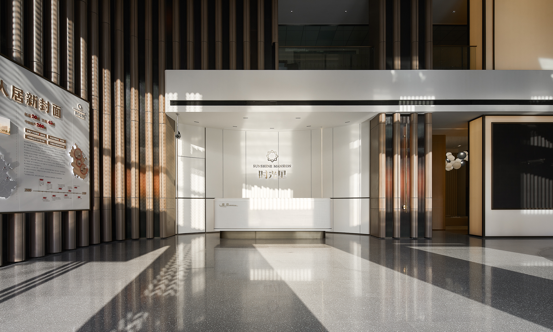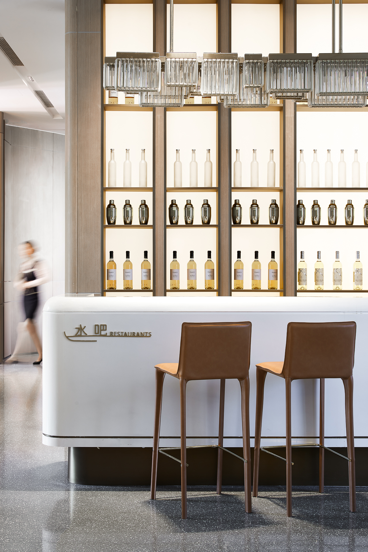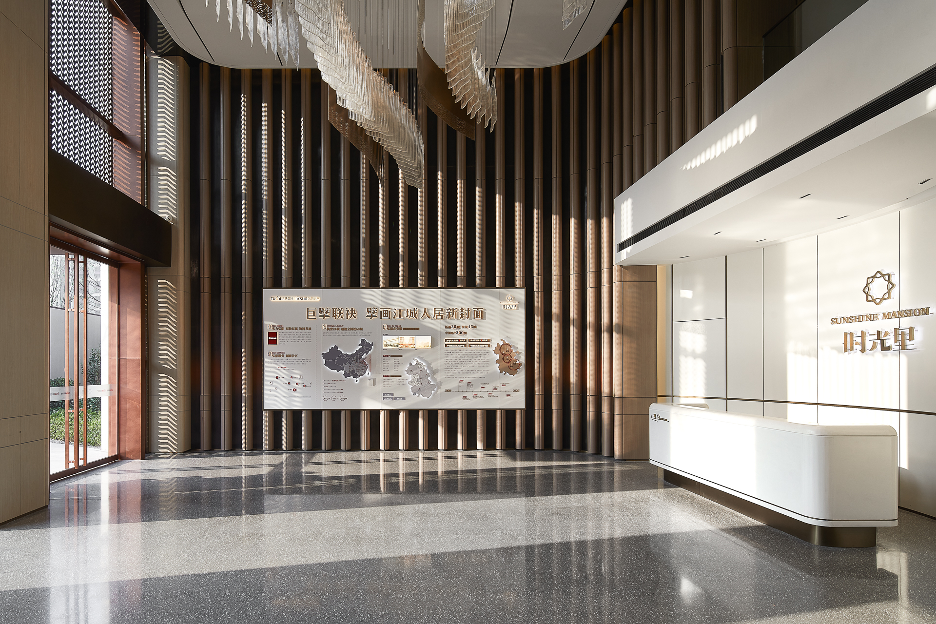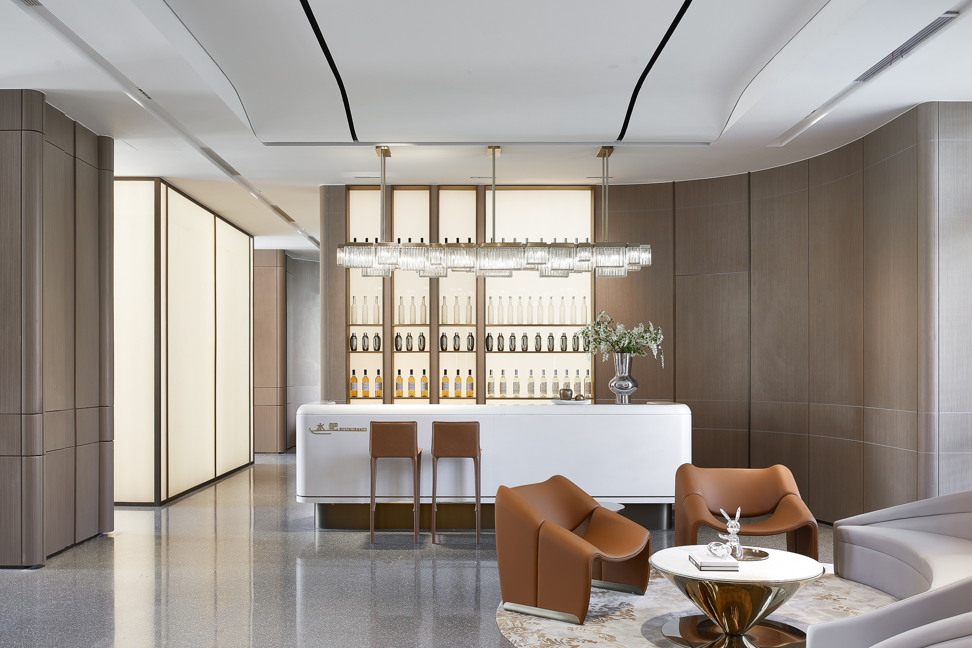 设计选材:以咖橘色系列家具为基础搭配,配以爵士白大理石、金属材质,局部点缀现代艺术小物,围合出清雅自然、舒适惬意的交流氛围,塑造出良好的初印象。一步一美景,艺术品以芜湖之水流动的形态为构想,作品最终以不锈钢、玻璃钢材质演绎出水的灵动之美。