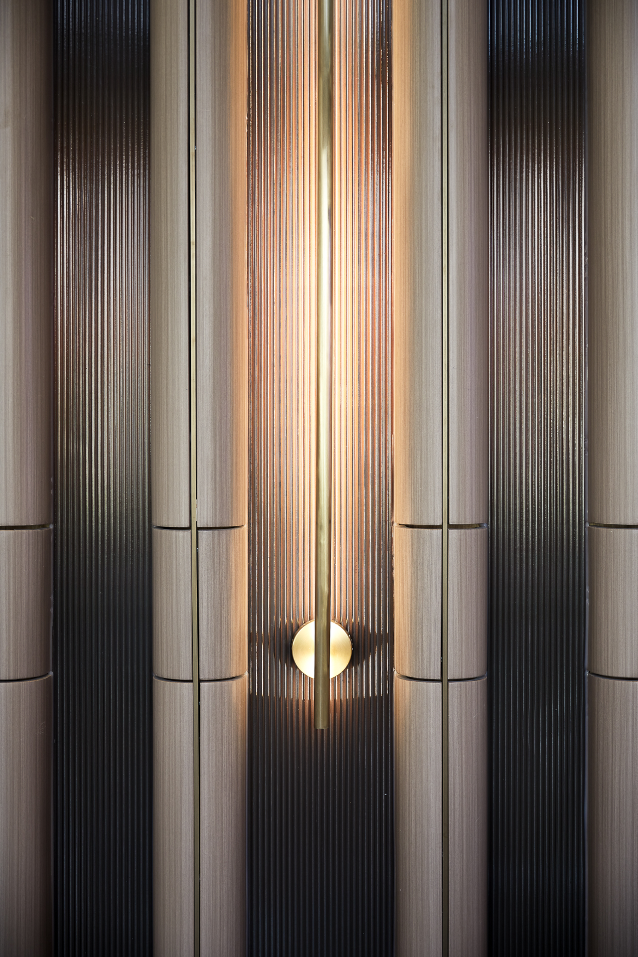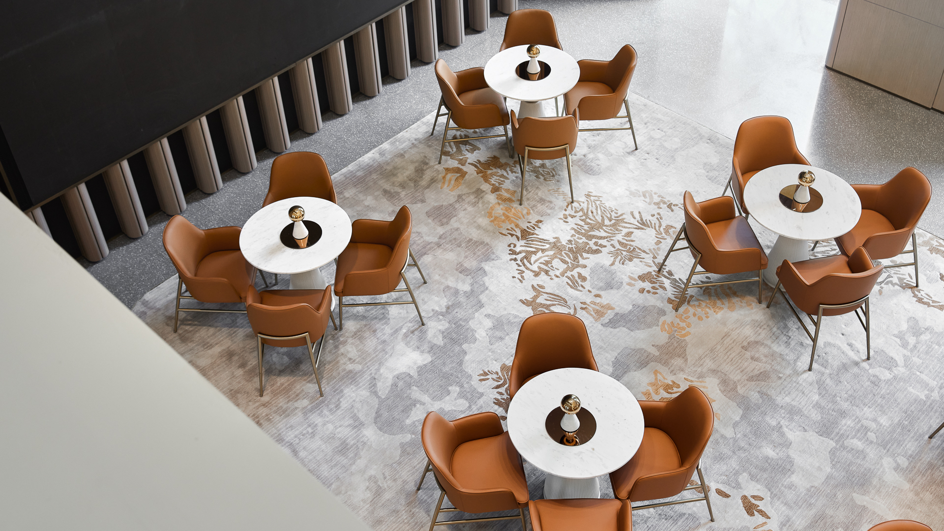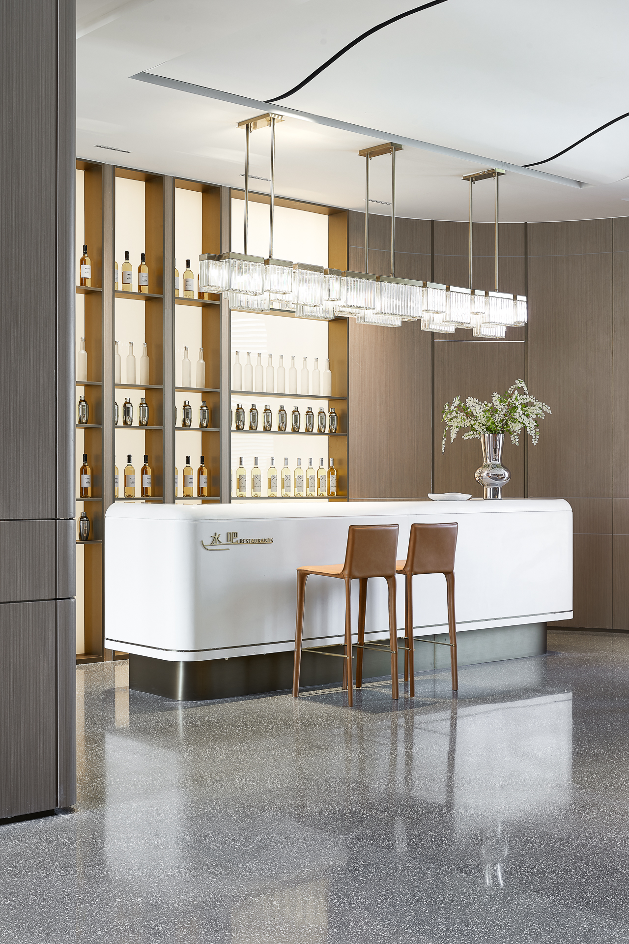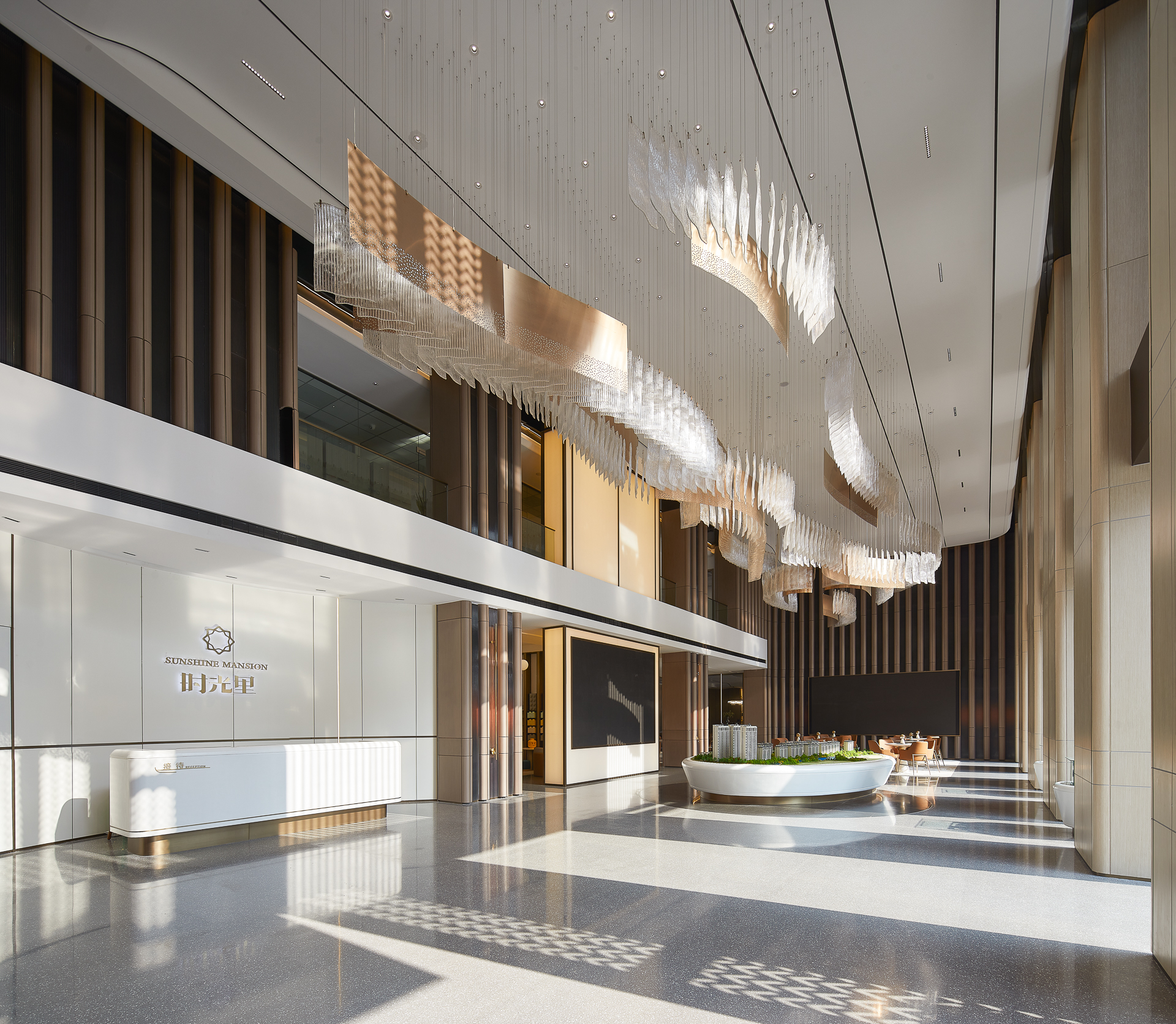 设计选材:以咖橘色系列家具为基础搭配,配以爵士白大理石、金属材质,局部点缀现代艺术小物,围合出清雅自然、舒适惬意的交流氛围,塑造出良好的初印象。一步一美景,艺术品以芜湖之水流动的形态为构想,作品最终以不锈钢、玻璃钢材质演绎出水的灵动之美。
