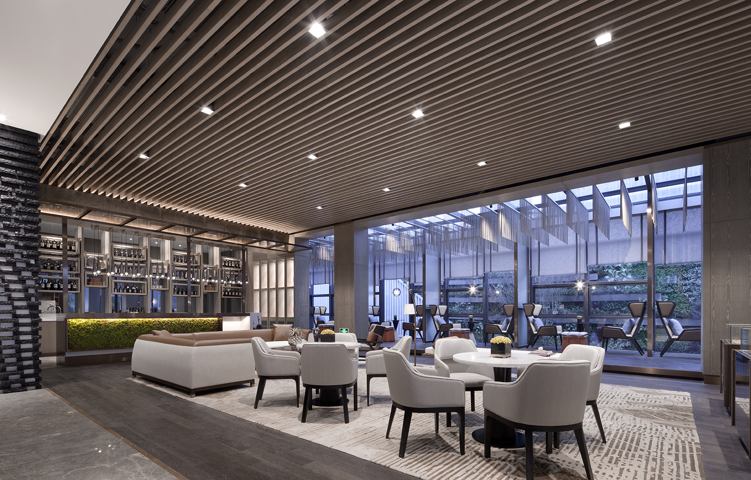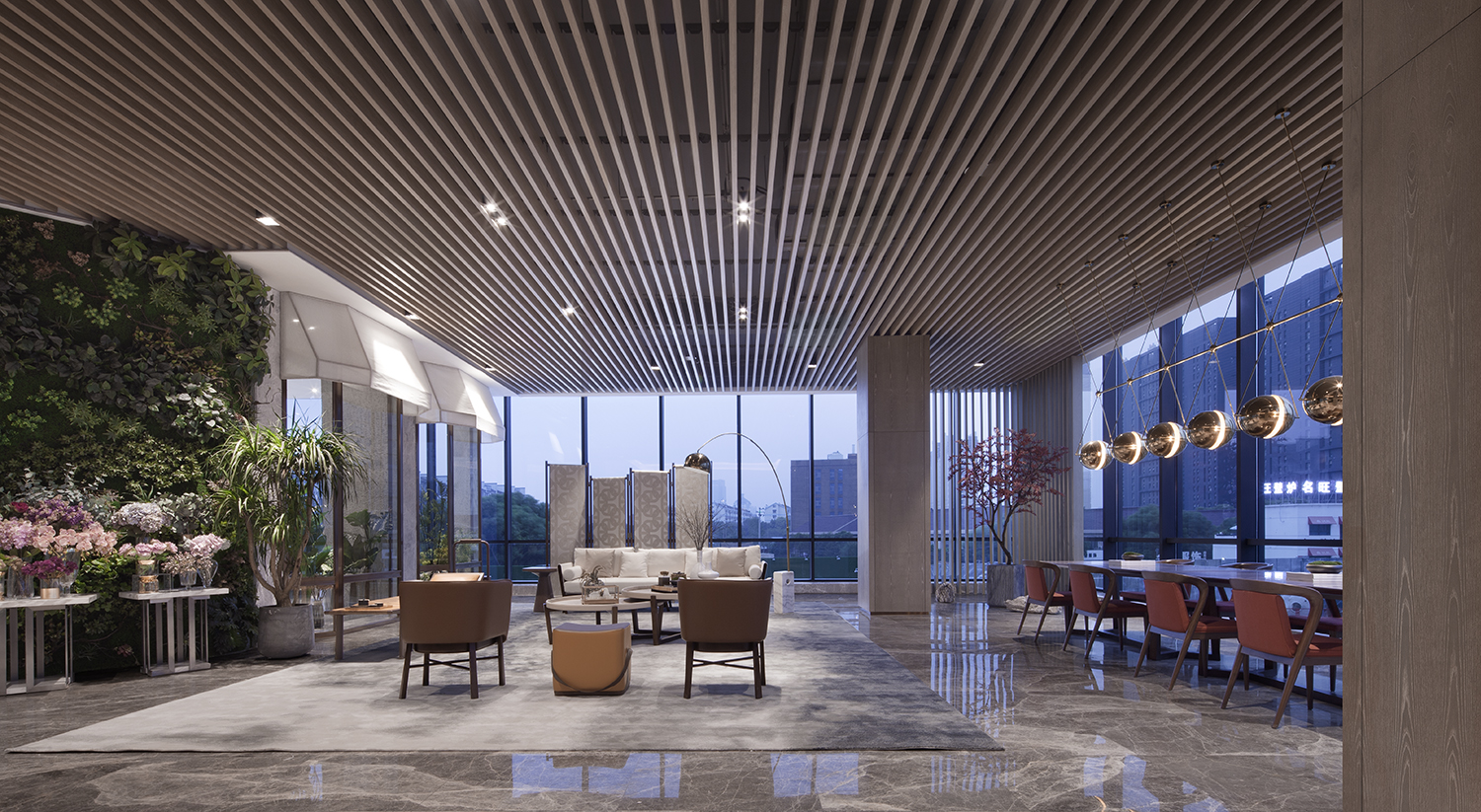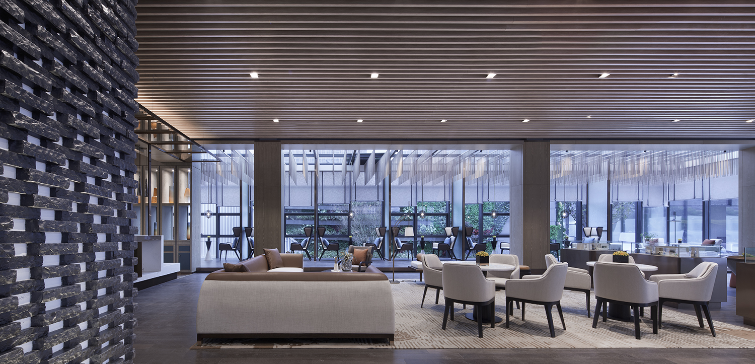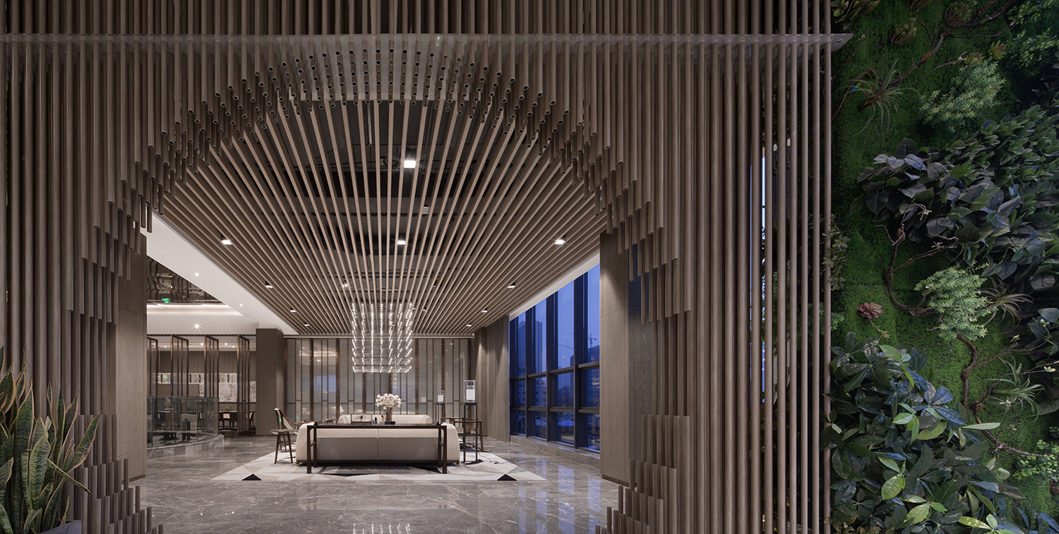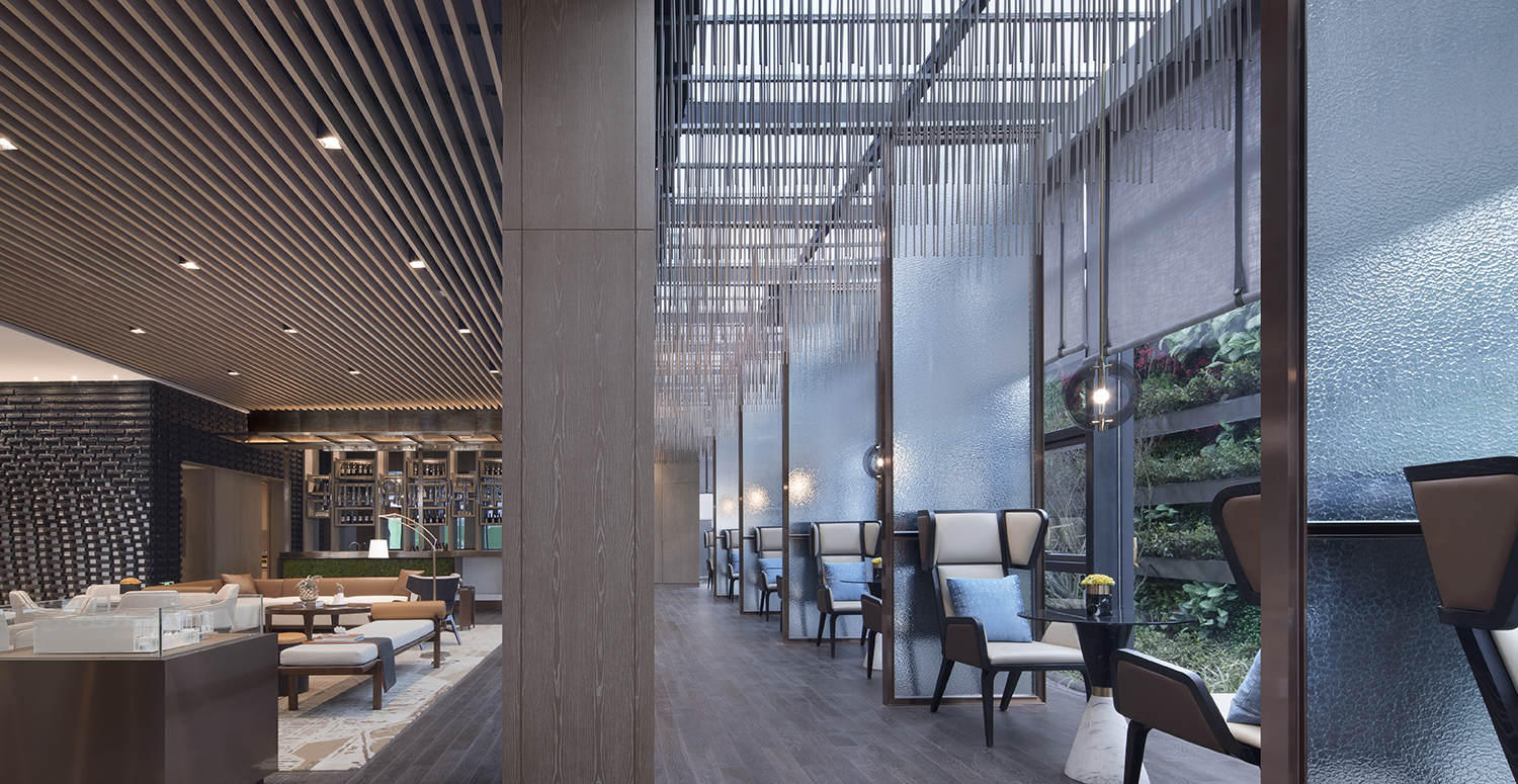 CHONGANFU SALES CENTER | 二楼洽谈区-4 木条天花序列、相互交错的细节处理,创造空间温度与视觉焦点,弱化空间概念,最终凸显出洽谈的重心。连结情感,是空间存在的理由和主题,我们用现代的材料以极简的方式来阐述,并在留白中展现去芜存菁的空间美学。 | 生活不只眼前的苟且,还有诗和远方的田野