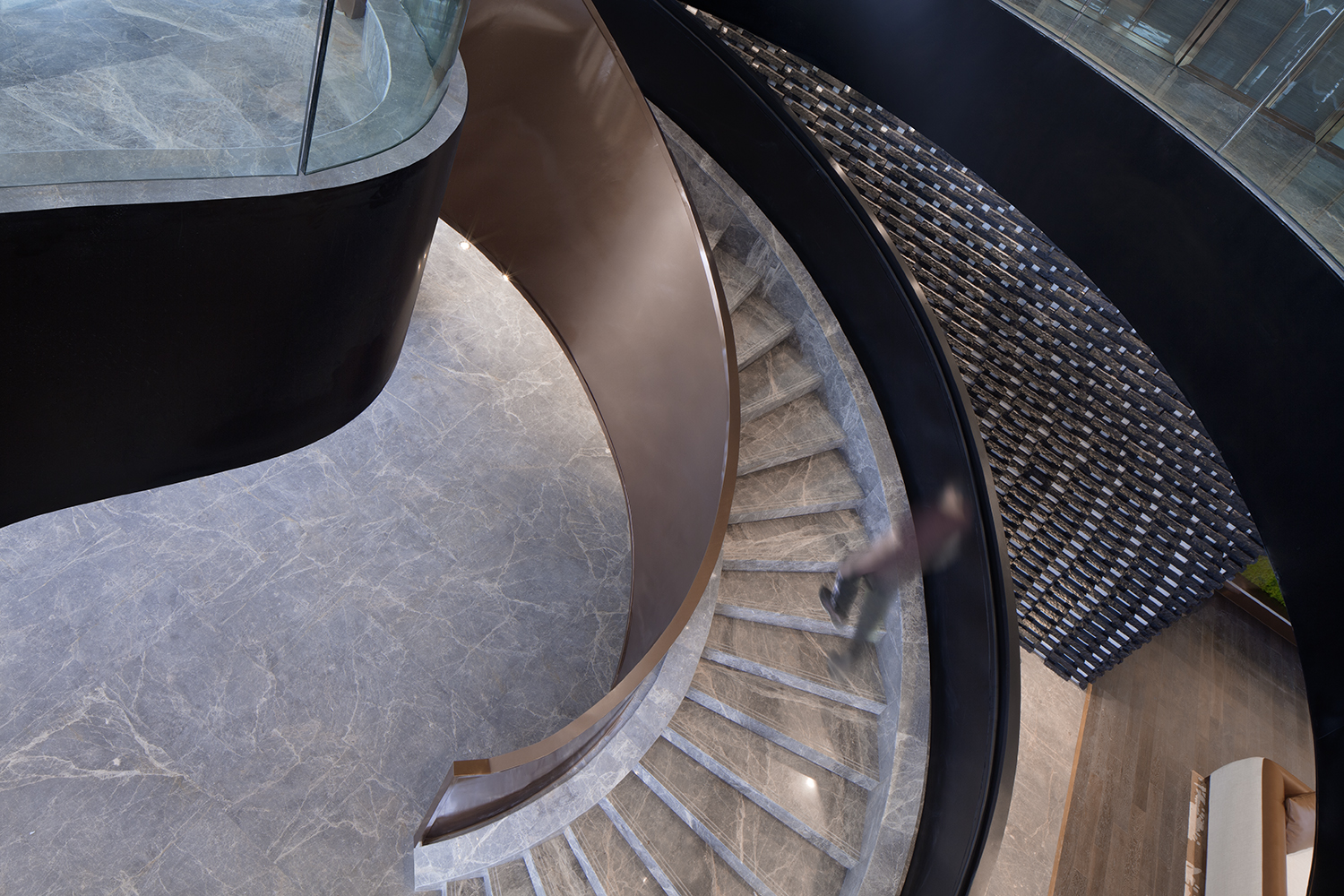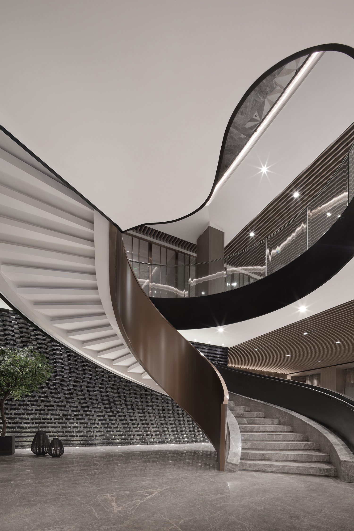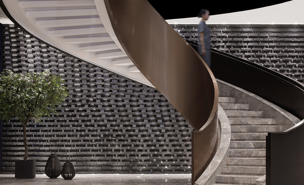 CHONGANFU SALES CENTER | 交通流线 虽是江南,但空间少了水便不成,只要一汪,便可让空间灵动起来。那些被切成不规则的黑麻石,错缝搭砌成墙,如缓缓流动的水面,藏光之下,水光潋滟。 “古运河穿城而过”,抽象成连接两层空间的如雕塑般的楼梯,拾级而上,或漫步而下。一级级的阶梯,延续了水的抽象处理,不张扬似有声。随风而动,不经意间可泛起砖墙上的片片涟漪。