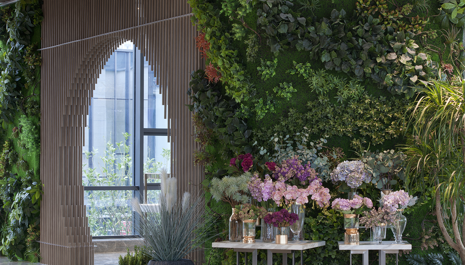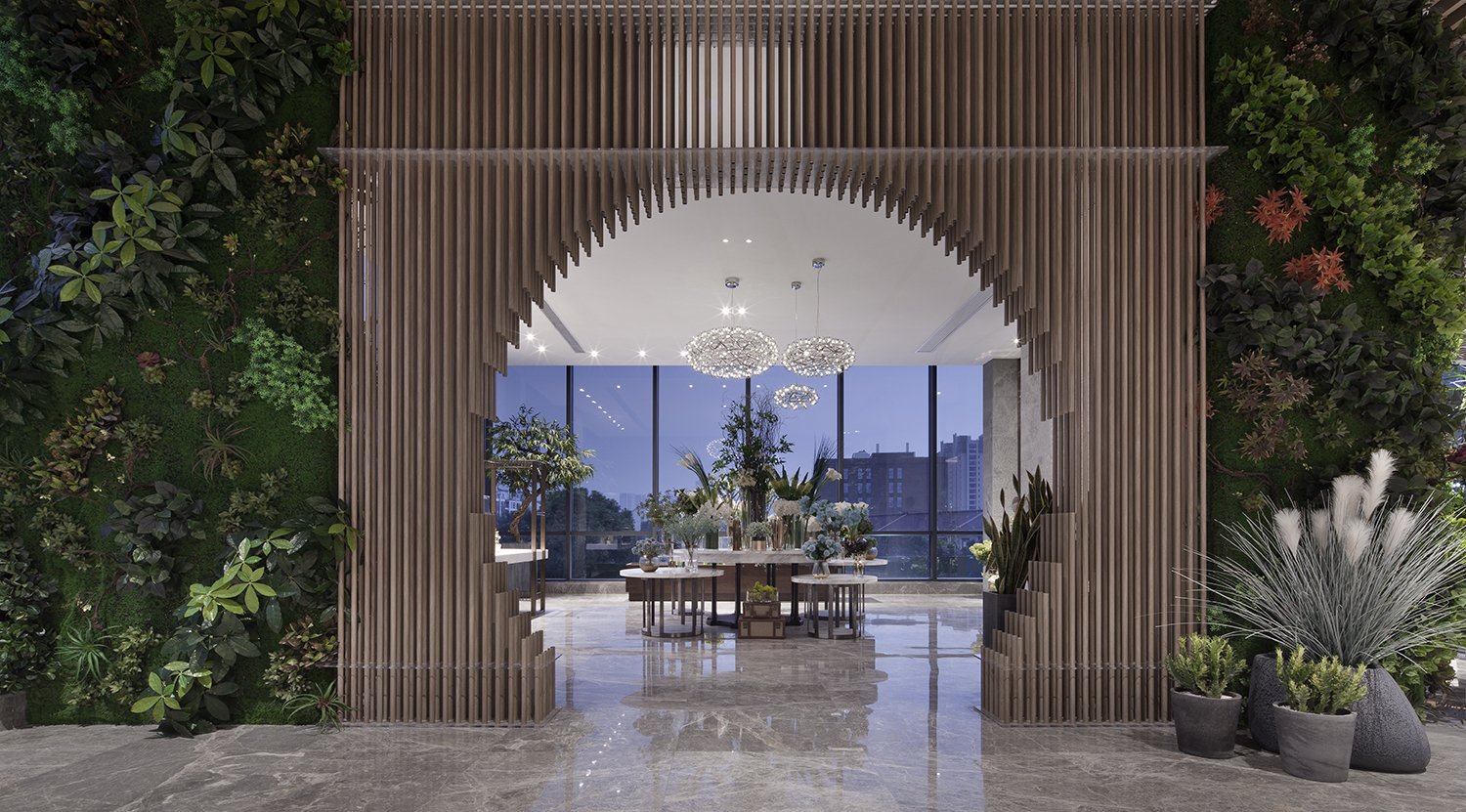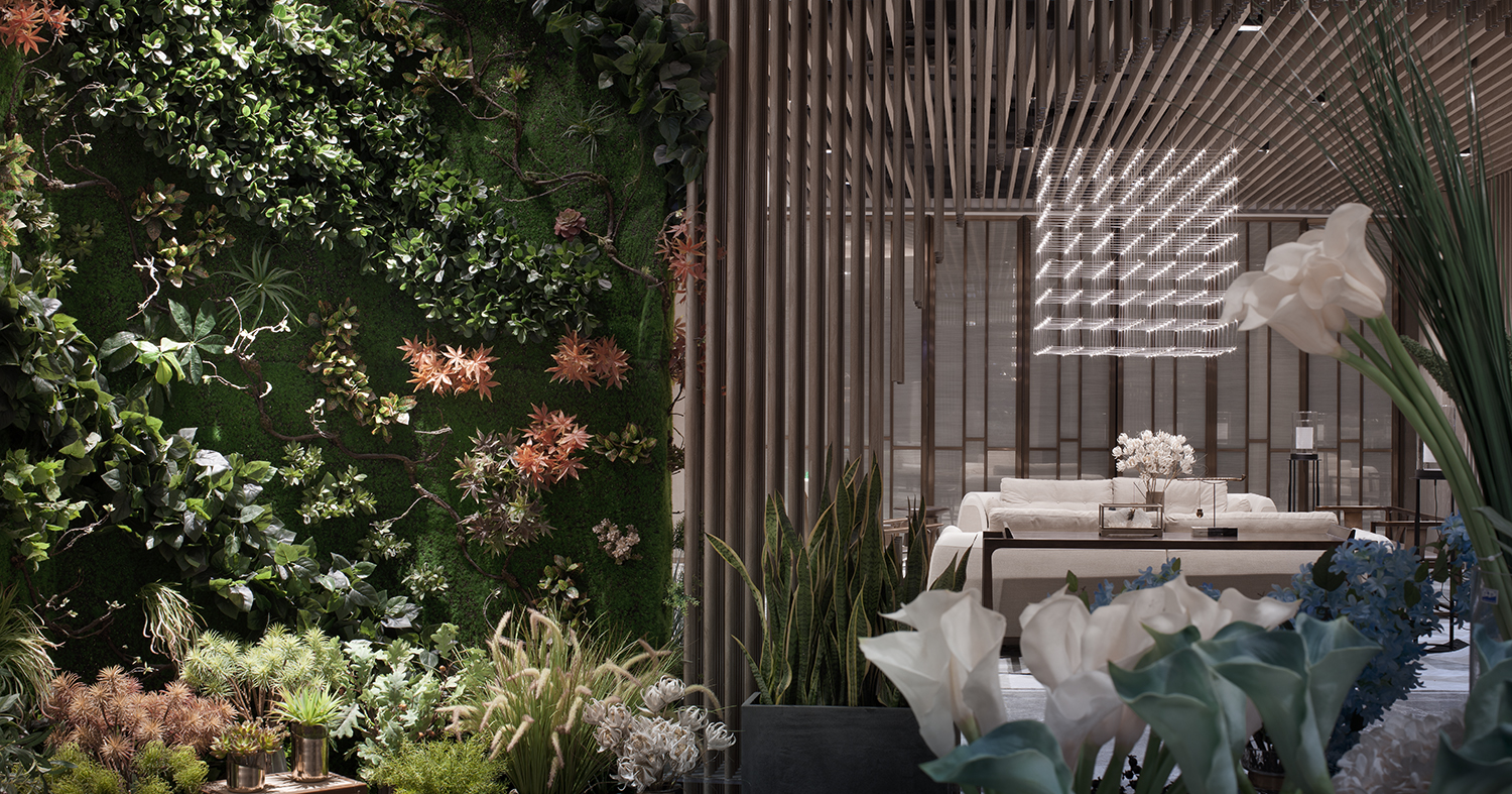 CHOGNANFU SALES CENTER | 二楼艺术装置/花房-2 空间一隅,灯光的晕染下,鲜花、空间、材质交融在一起,实为身心放松的生活花园一角。