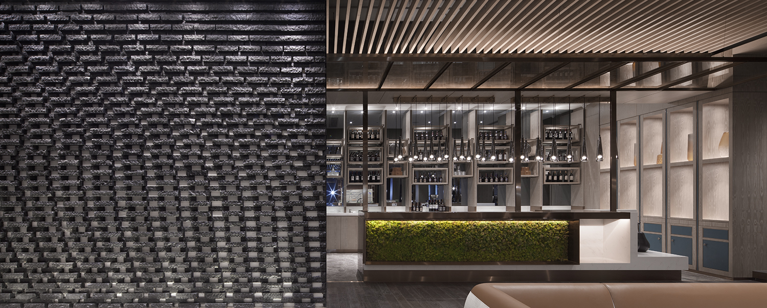 CHONGANFU SALES CENTER | 吧台区 印象里的江南,除了小桥,流水,还有古镇街道及一间间古色古香的商铺。吧台区的设计,设计师特意将古镇街边商铺元素融入其中,吧台前青苔覆盖、连接上方斜切挑出由不锈钢条与水纹玻璃窗页构造而成的棚前装置,呈现了一幅“古镇店铺东家撑开铺面的那一瞬间,旧客已排队等候在前”的意象画面。 | 用设计带动思考,触发人们对美好生活的向往