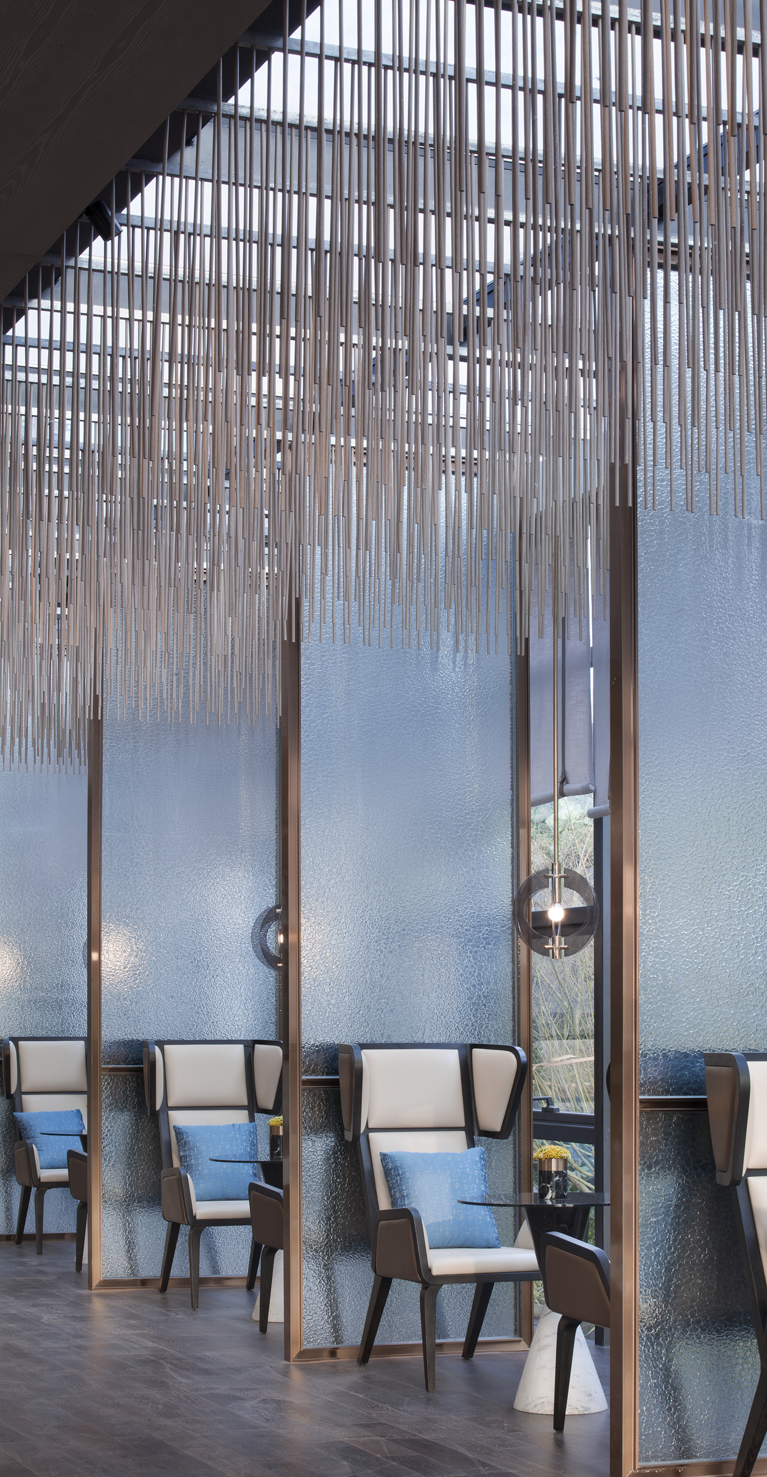 CHONGANFU SALES CENTER | 一楼洽谈区-4 江南烟雨,如诗如画。同阳光房的设计诠释一般,丝丝缕缕的雨从天而降,朦胧了隔断着的玻璃,衬上深色旧木地板,一股江南古老韵味的生活气象扑面而来。细雨纷飞,雨雾笼罩,室内外景色互为补充、延伸。人在空间行,美在眸中转。我愿在此,画船听雨眠,悠然见阳醒。
