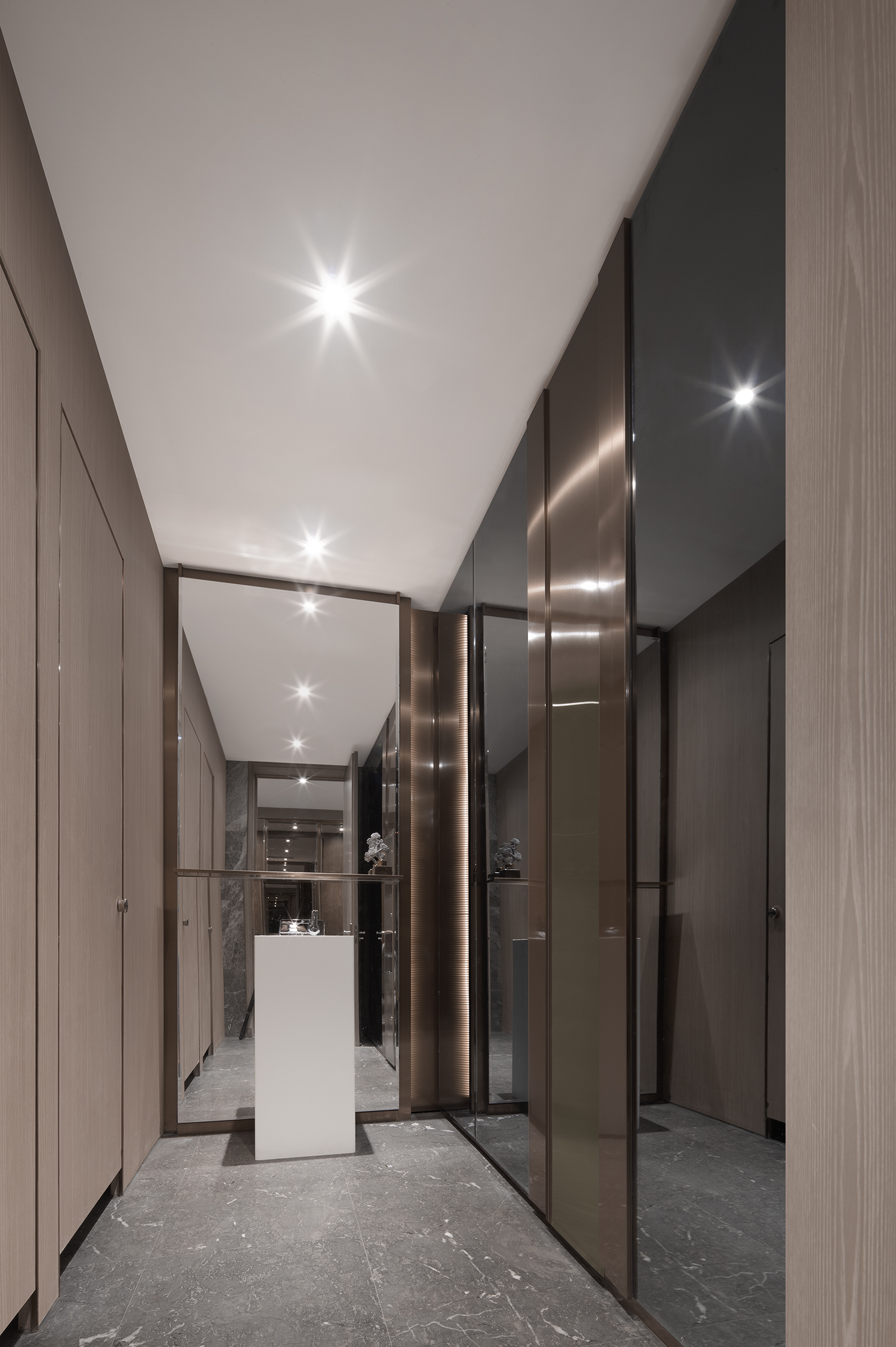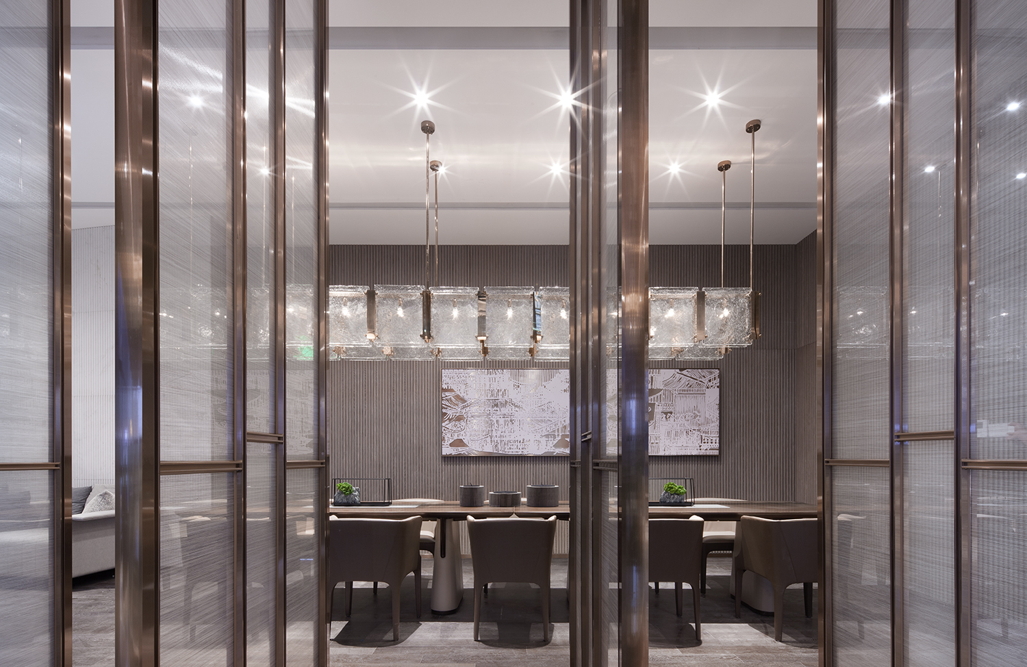 在此项目上,天花、地面大面积铺盖而成,线条流畅,大厅干净大气,吧台处精致细腻,定制的每平近万元的古铜肌理,更是一种低调的奢华。旧木、古铜在时间的流逝中留下的印记,留给无数后人慢慢去探讨、与空间呢喃。