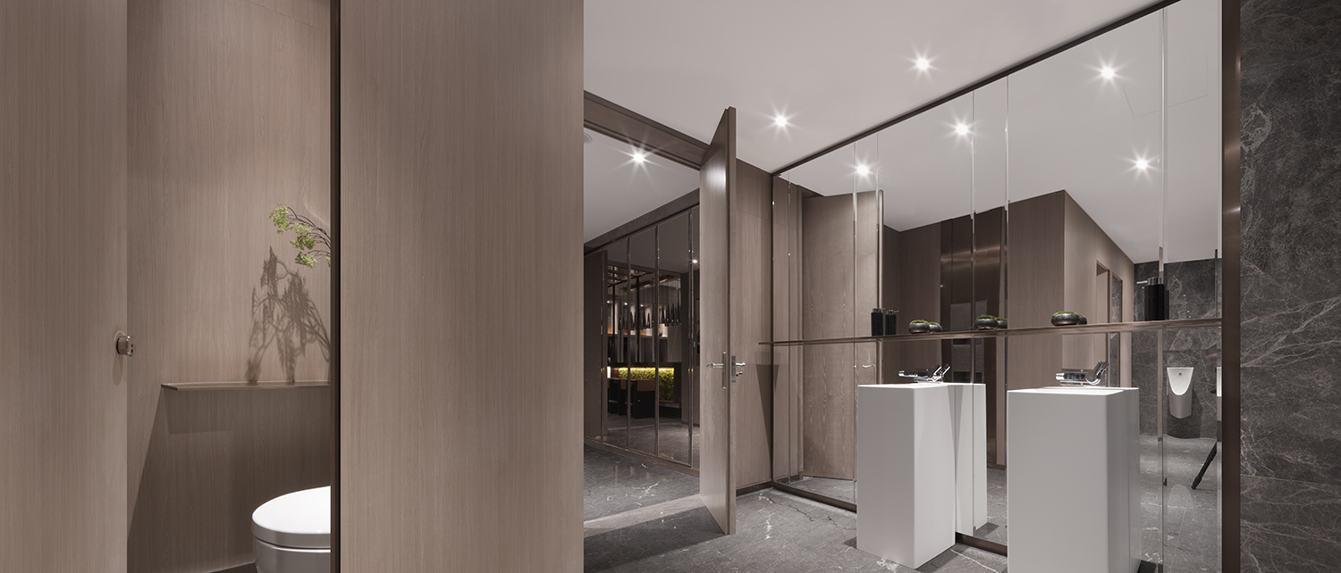 CHONGANFU SALES CENTER | 洗手间 公共空间的设计也应该是让看客待得住的。洗手间采用了木材、玻璃与大理石等材料,构建了一个干净明亮,又不失质感的公共空间。木板分割成一个个独立的区域,落地玻璃与大理石交汇相映,拓宽空间的同时也饱含温润感,精致的线条在灯光照耀下,更显空间的层次与通透。 | 舍去固化,去芜存菁