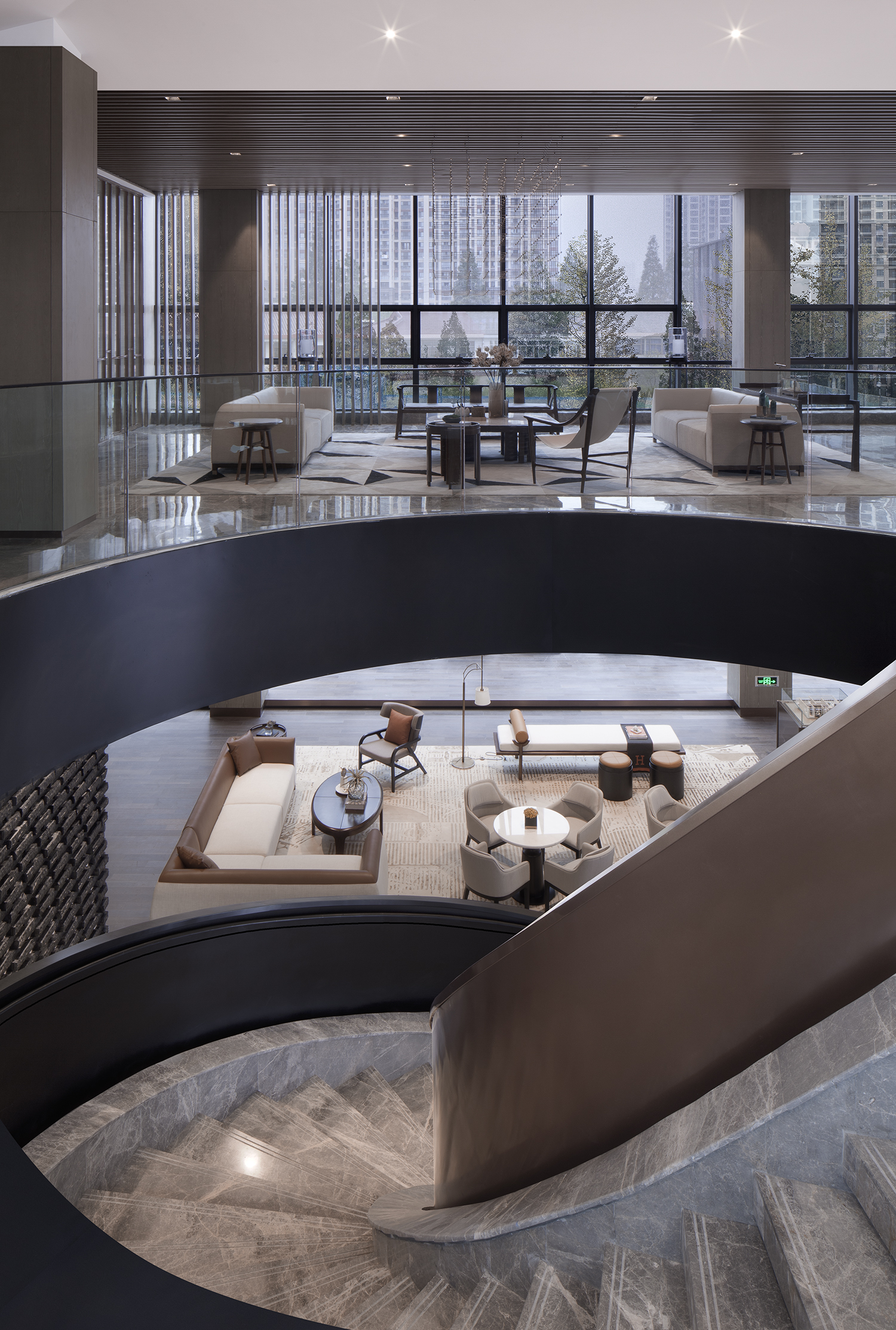 整个售楼处特意不做遮挡,通透明亮,看客的视线无处落地,而楼梯的设置恰到好处,承担起整体空间的动线主导及布局延伸。