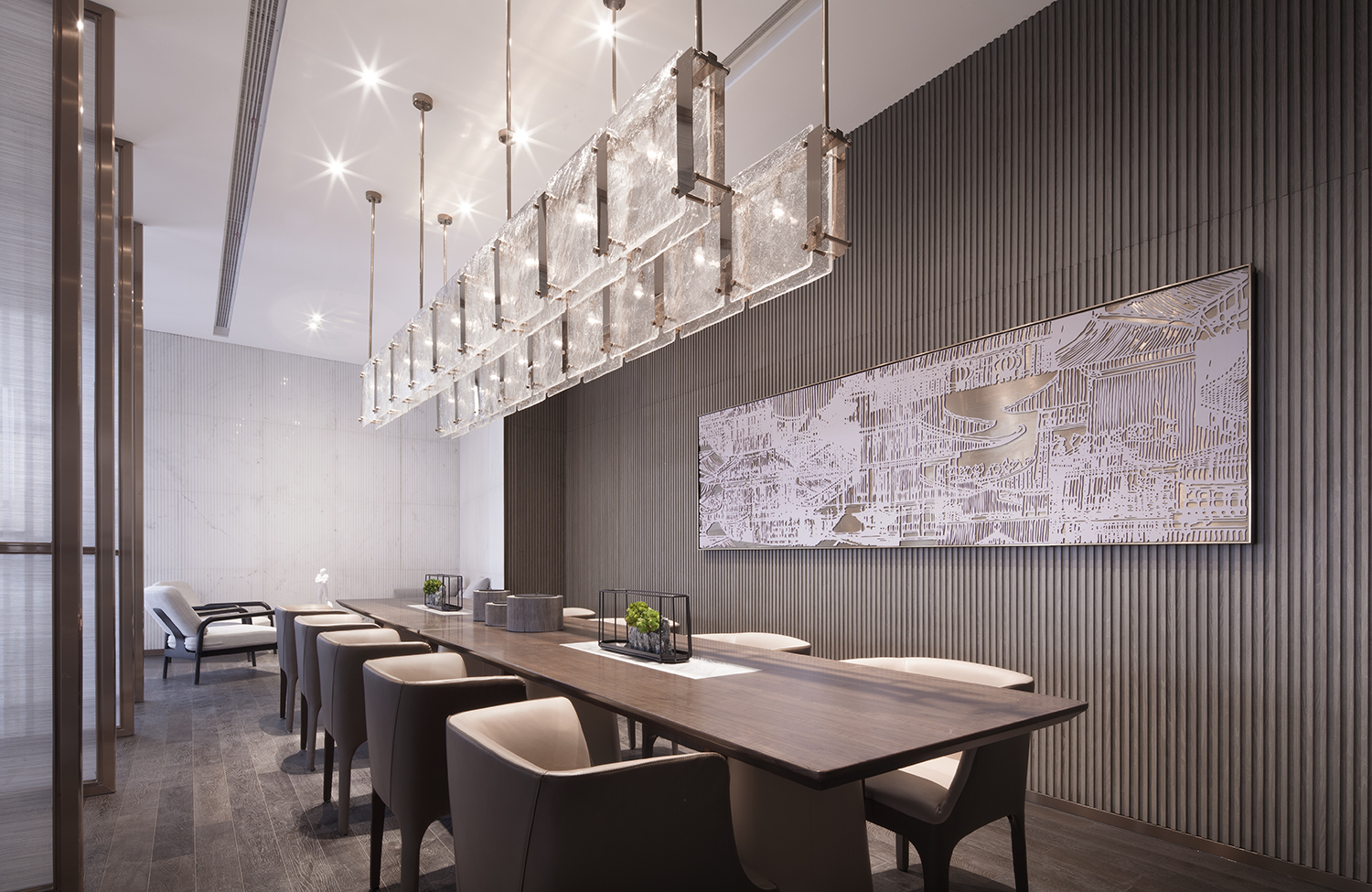 CHONGANFU SALES CENTER | 二楼VIP室-2 把古老建筑雕刻成画嵌于墙壁中来,是对当地历史文化的一种敬重与延伸,也是VIP洽谈室空间,文化与情感的一场简述,传统与现代的一次碰撞。 我们做了一个现代的设计,将那些云纹、山水画……逐一删掉,保留了恰到好处设计手法,却被感受到了中式的意境。这就是我们的目的,做一个不是中式却不失东方韵味的空间设计。 后记(马一平): 而今,我仍记得每个阶段的模样,看着平面从两个交互的盒子不断交合变化,再到内空间的逐步分析细化,看着前期概念的不断的推翻,等待其涅槃,直到效果呈现。我们不断的尝试、总结和实施。尔后发现更合适的构成方式,这样才能给予观众一些新鲜感。 而一个项目的落地,少不了多方执行者的共同努力。我们极其盼望通过与这些设计领域带头者的思想碰撞与执行沟通,而能共同收获一个比设想更佳的作品,而往往期待满满,还是避免不了遗憾些许。即便如此,我等执念依旧,整装再出发。