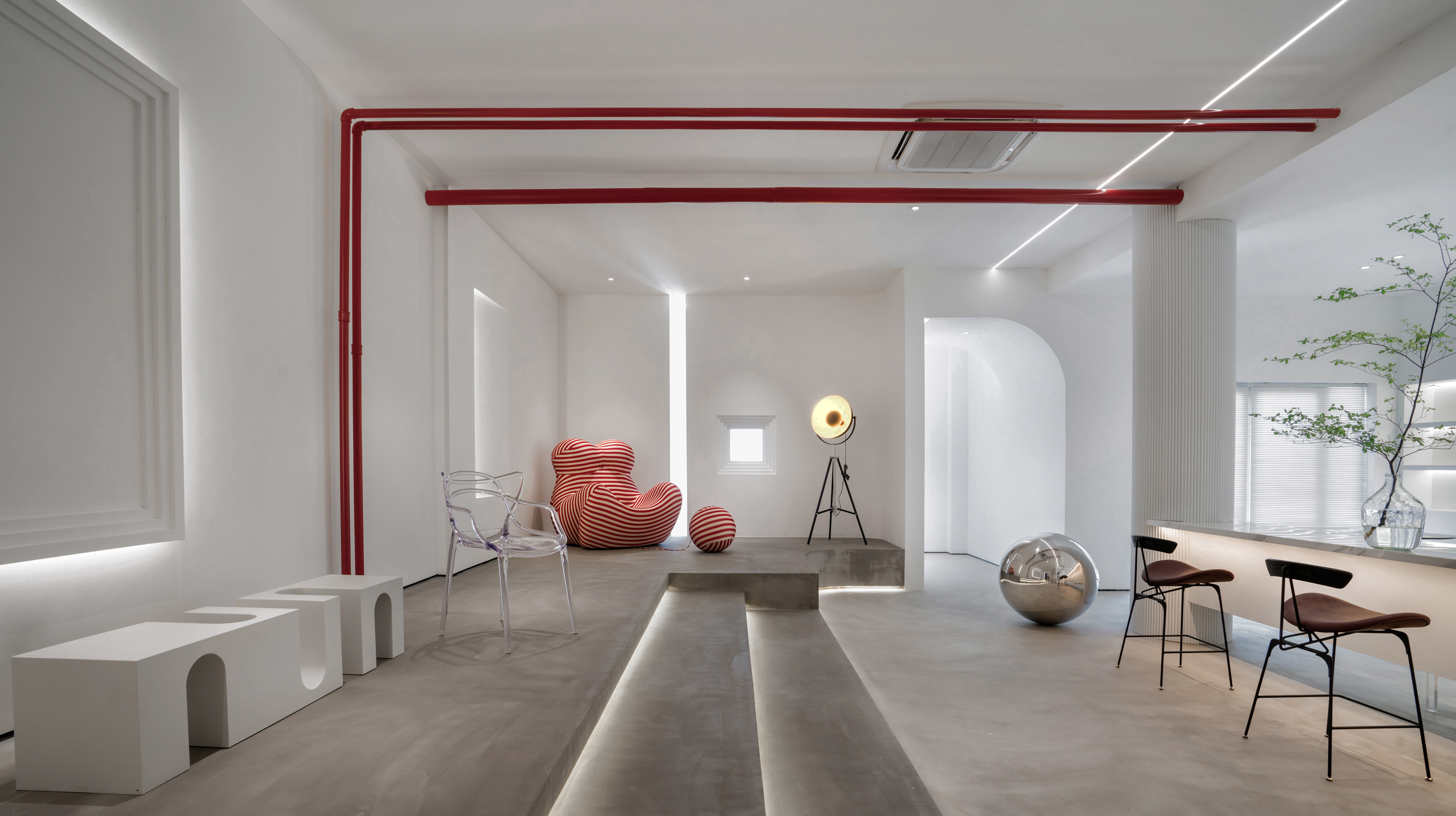 设计选材:空间运用最简单的材质,让空间的视觉得到延展。白色乳胶漆,让空间更加的明亮;新材料微水泥的运用,让地面更加整体化;吧台区台面点缀天然石材,让质感提升。