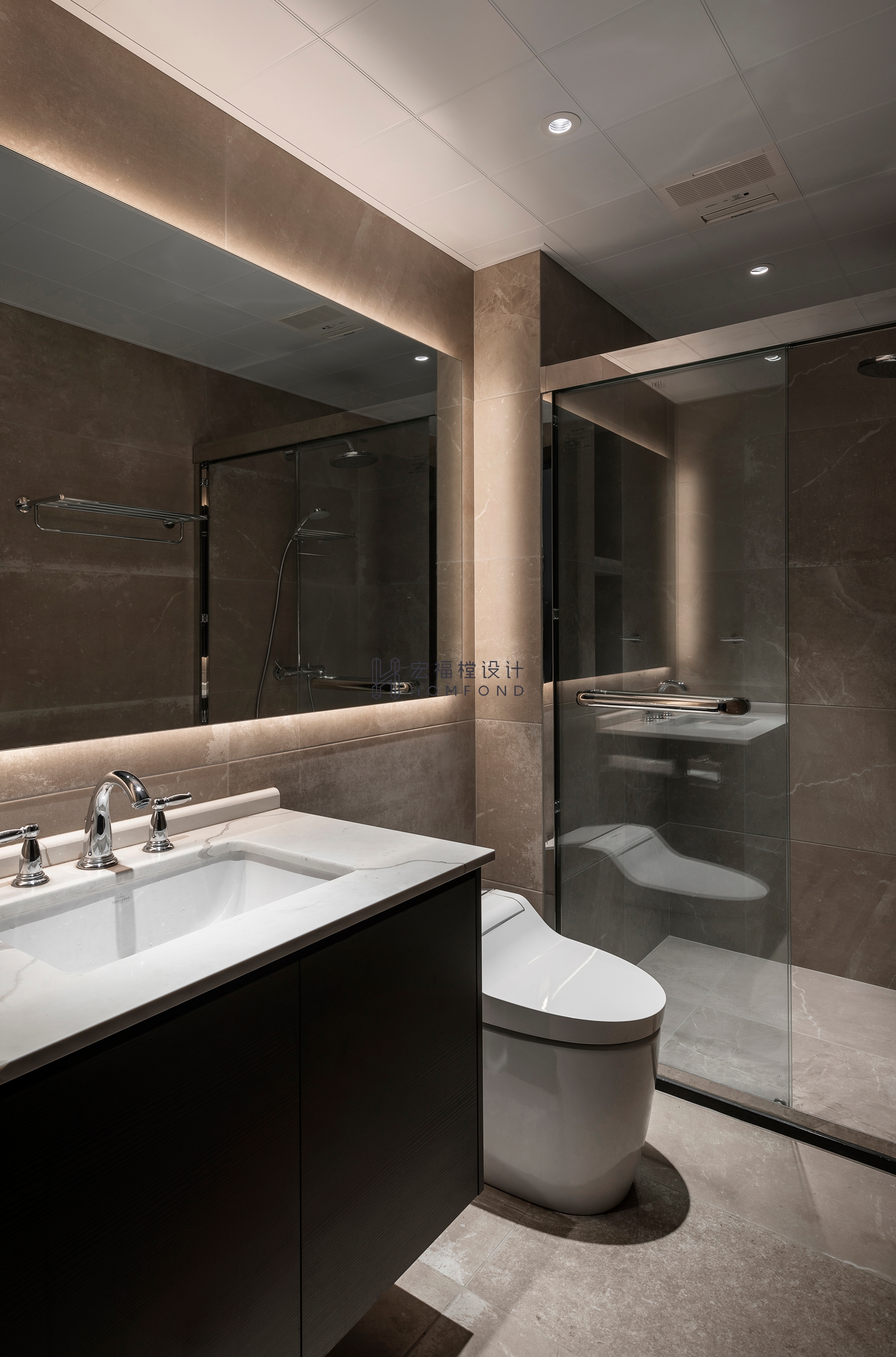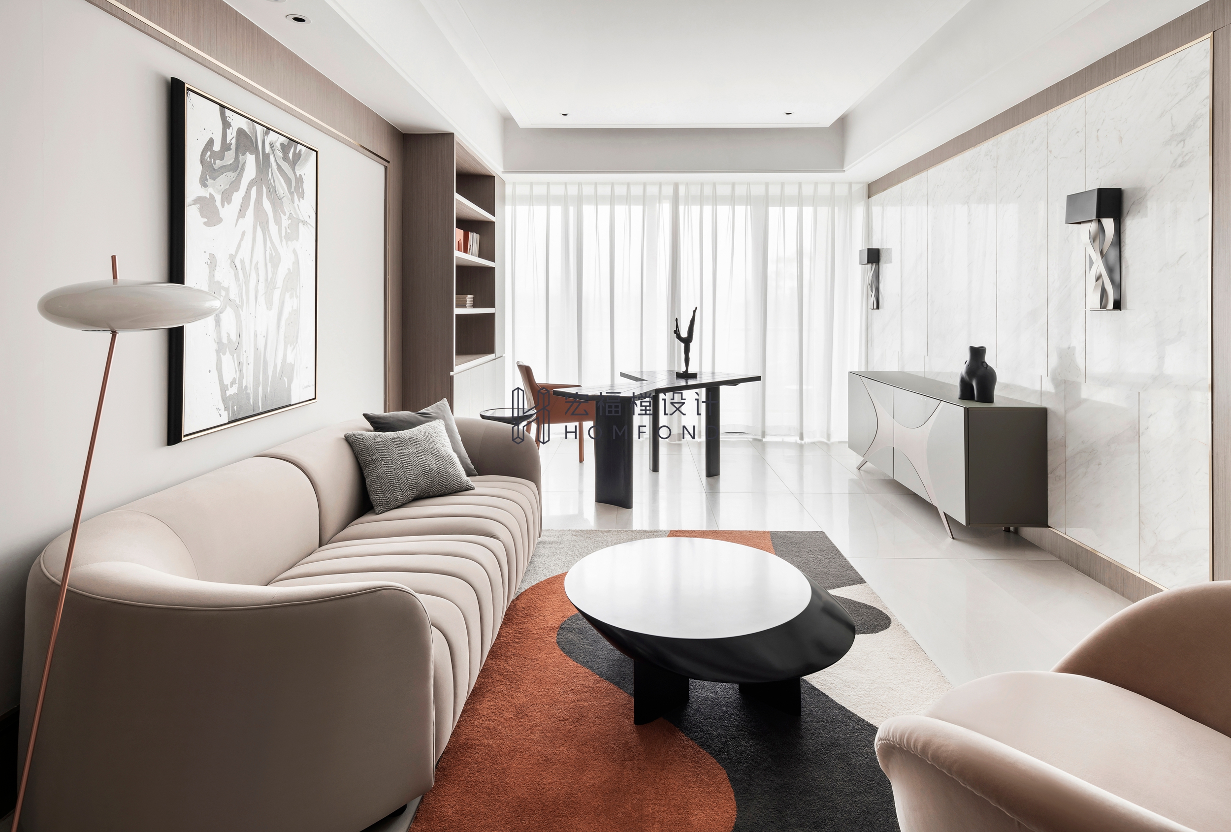 设计选材:空间以沙茶色为主基调,同时保留具有轻奢代表性的金属元素和大理石纹理,绒面材质加以点缀,赋予整个空间一种人与人之间的舒适尺度。隐藏式定制使空间整体从平面、立面及块面都具有统一连贯性。
