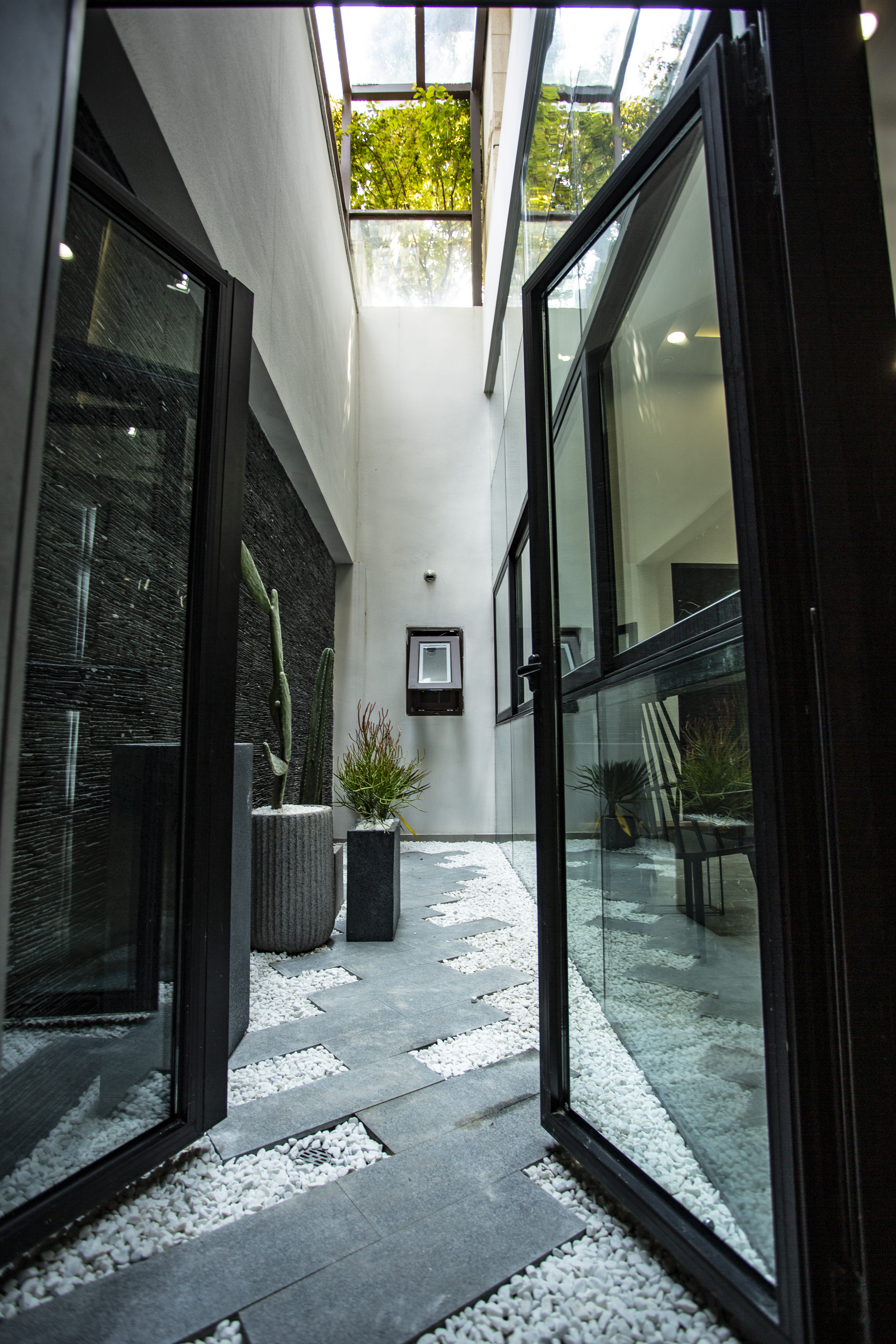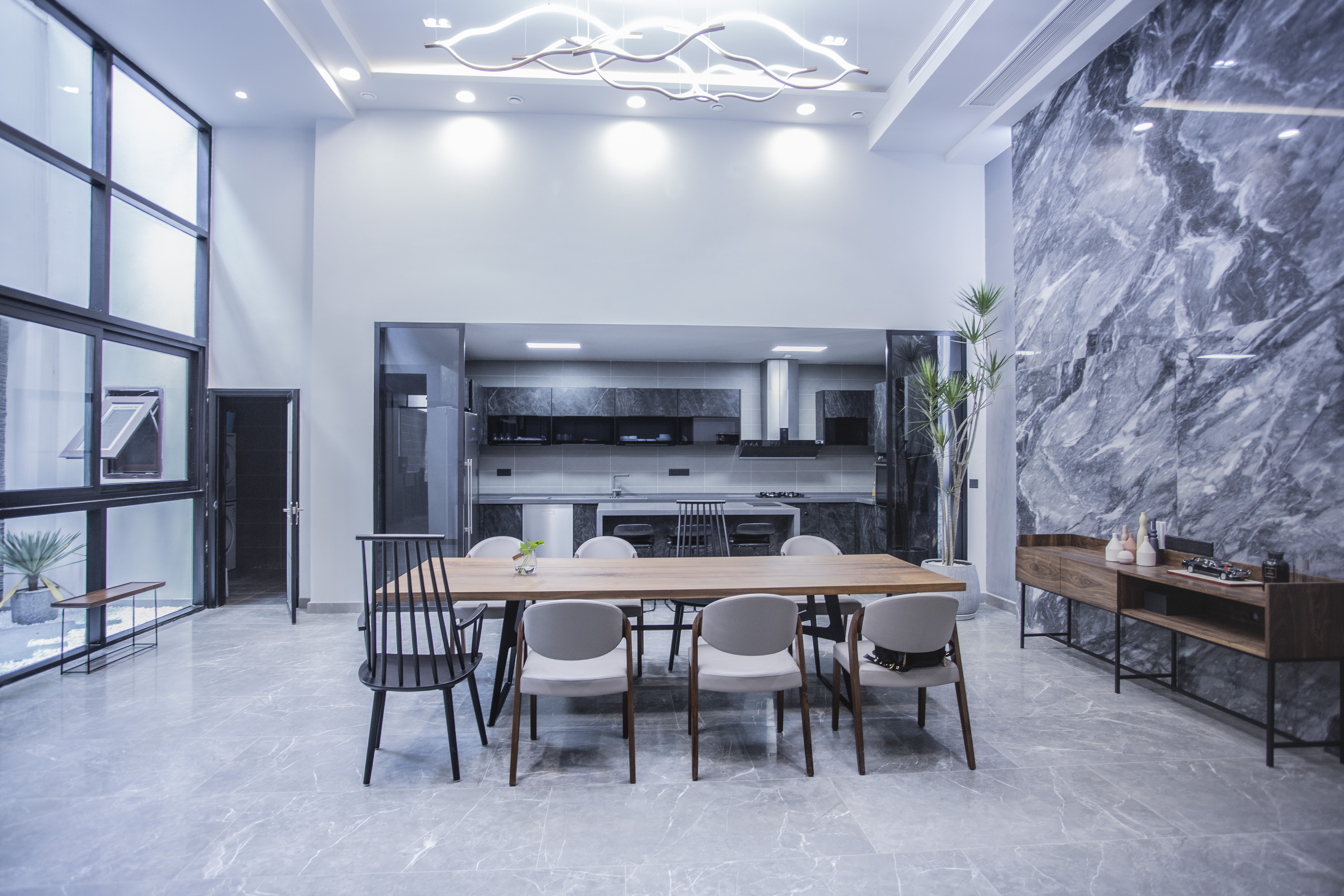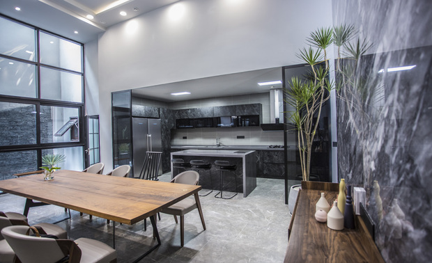 将一层空间高挑空保留,将原有高挑空四扇非标准窗口打通,扩大采光面积和通风效果;负一层采用厨房、餐饮、室内景观均分的布局,满足女业主的烘焙需求,又实 -