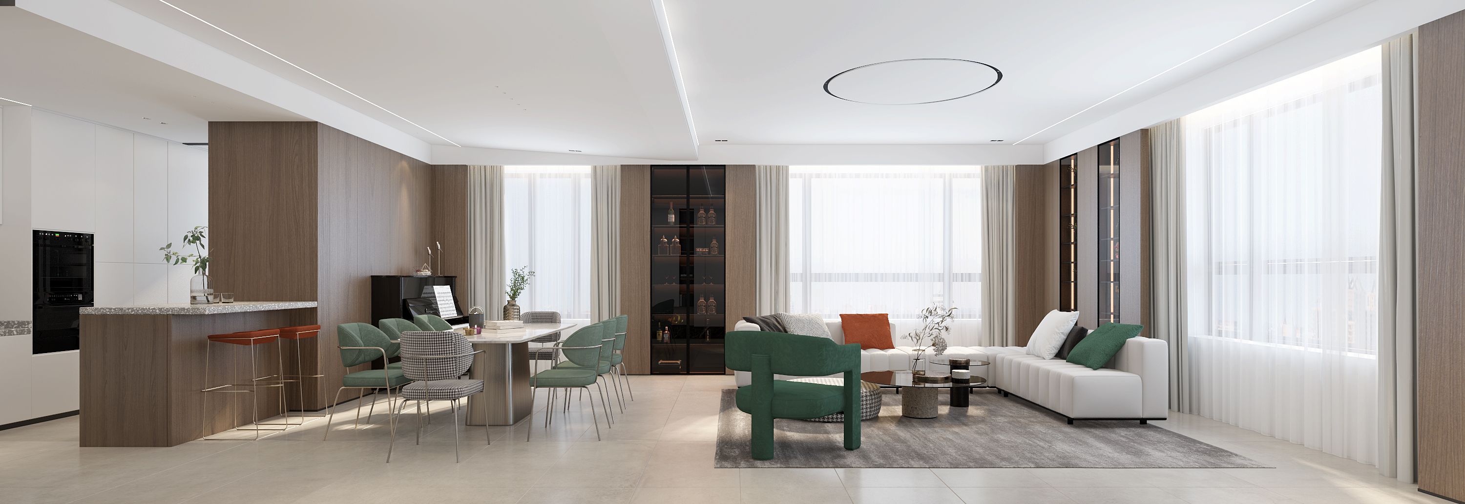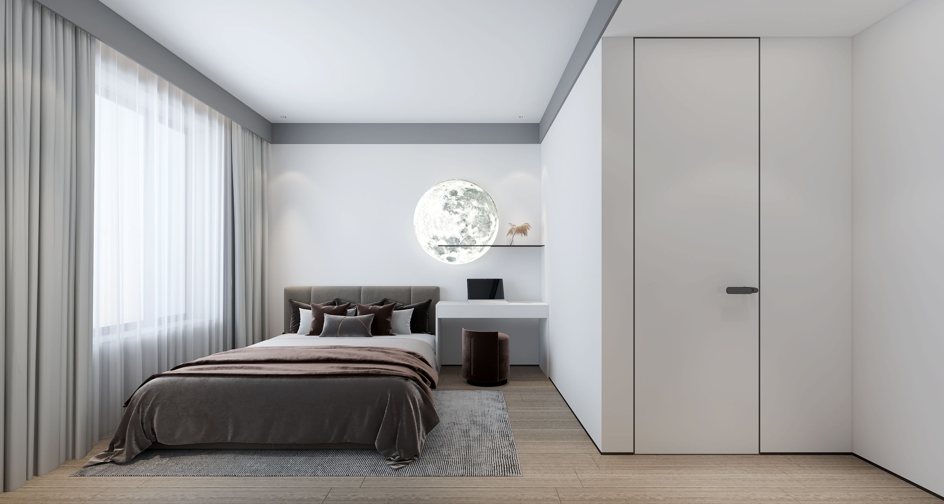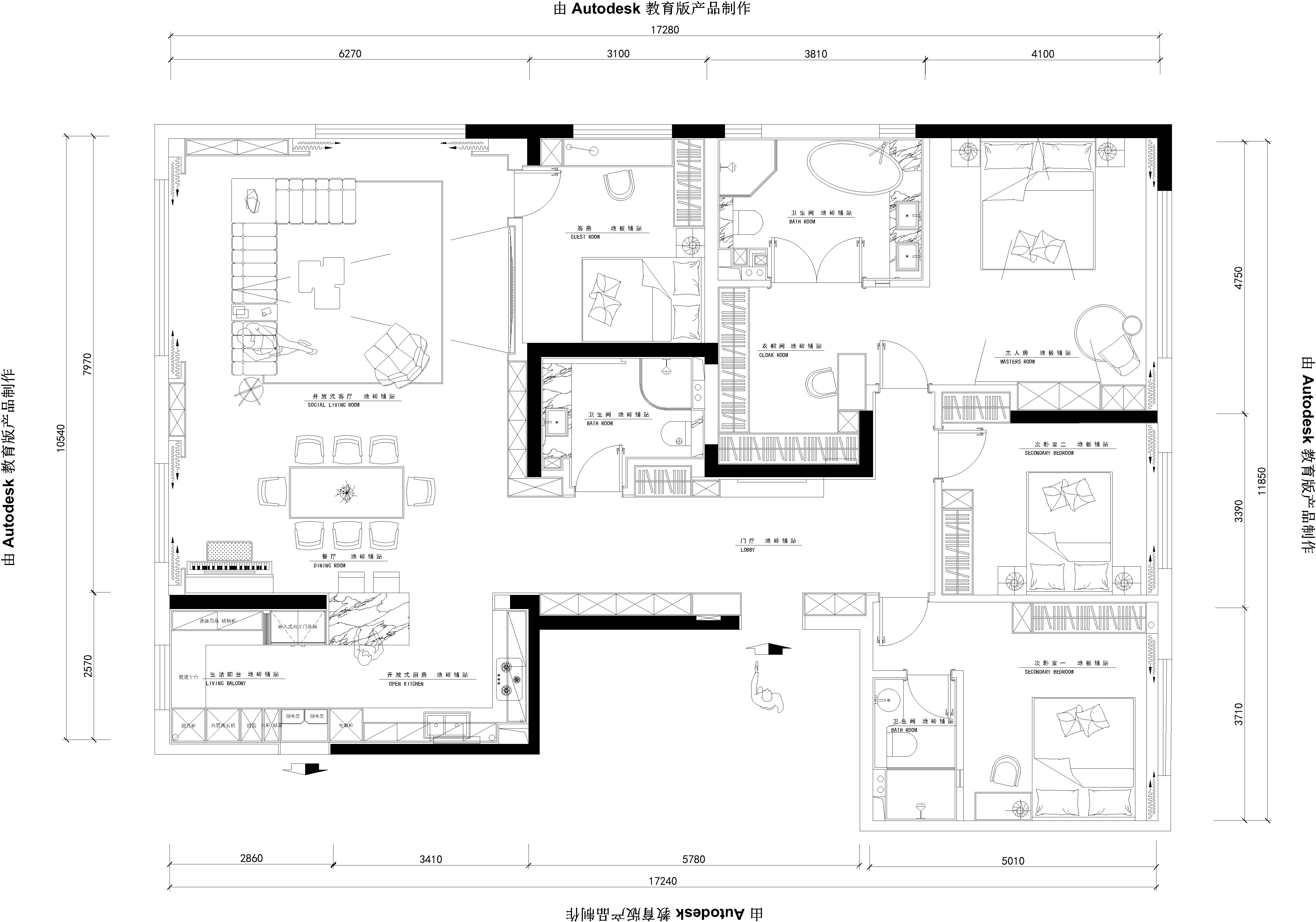 空间布局:空间格局根据业主诉求对于房间要求多一些,男主人自己的卧房空间尽量要大,客厅宽敞厨房操作区最大化,有西厨兼早餐台功能等,把空间做合理整合,充分利用每一处尺度,保证功能储物的前提下把空间用到极致。