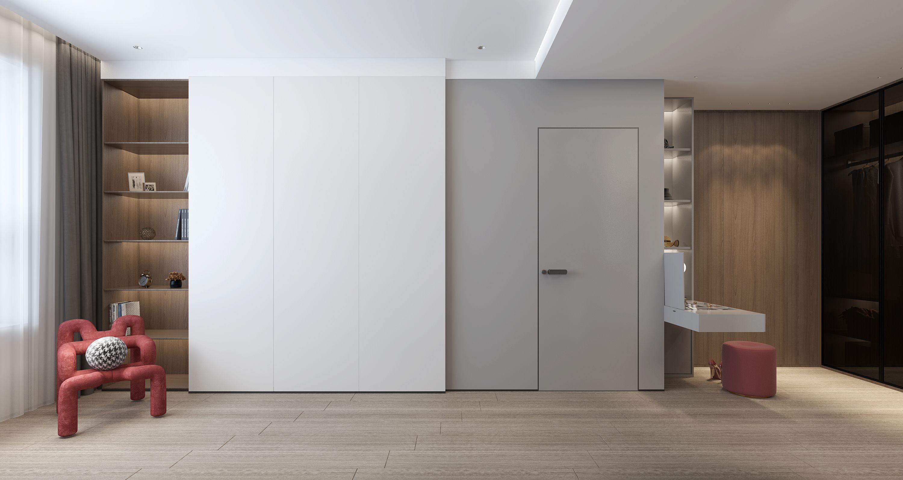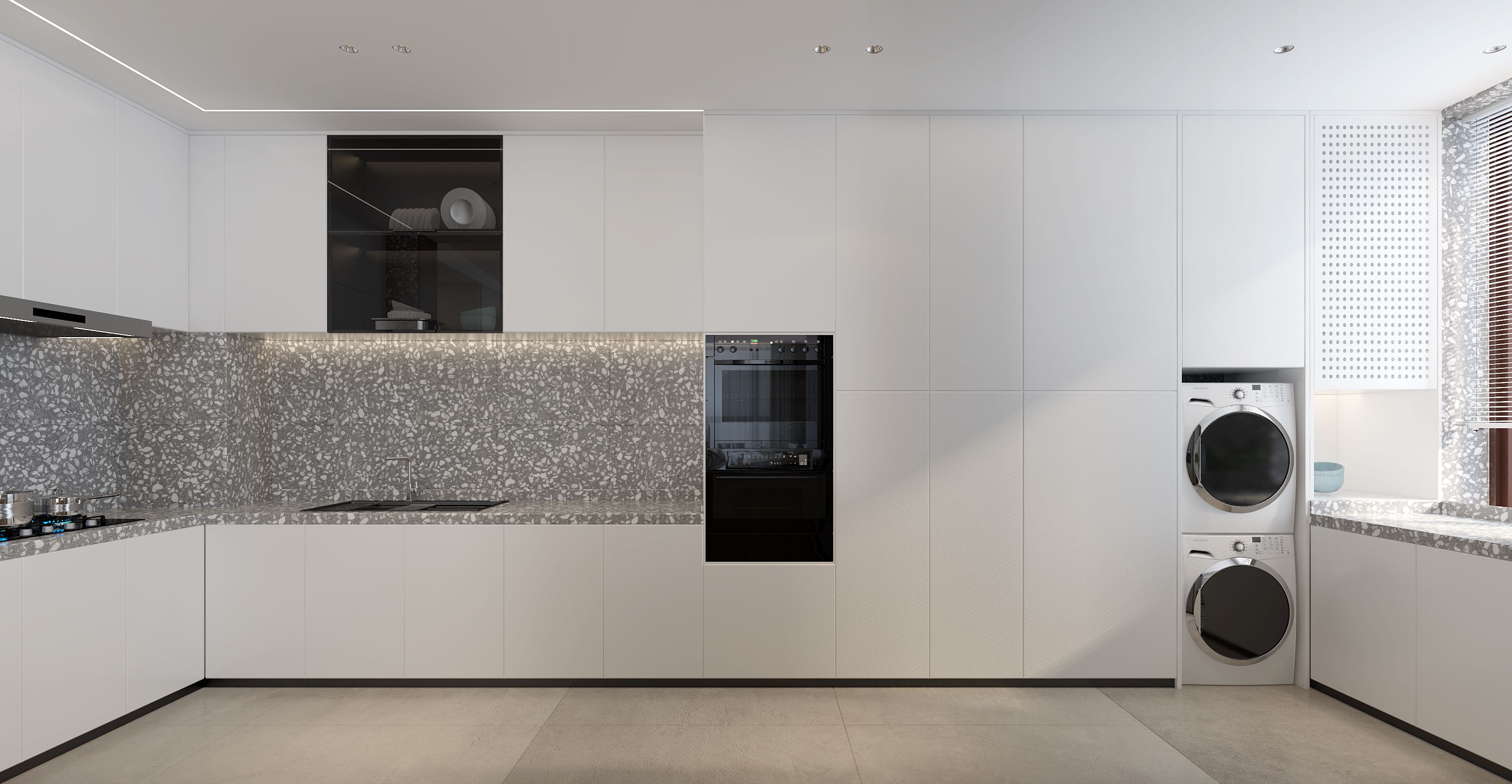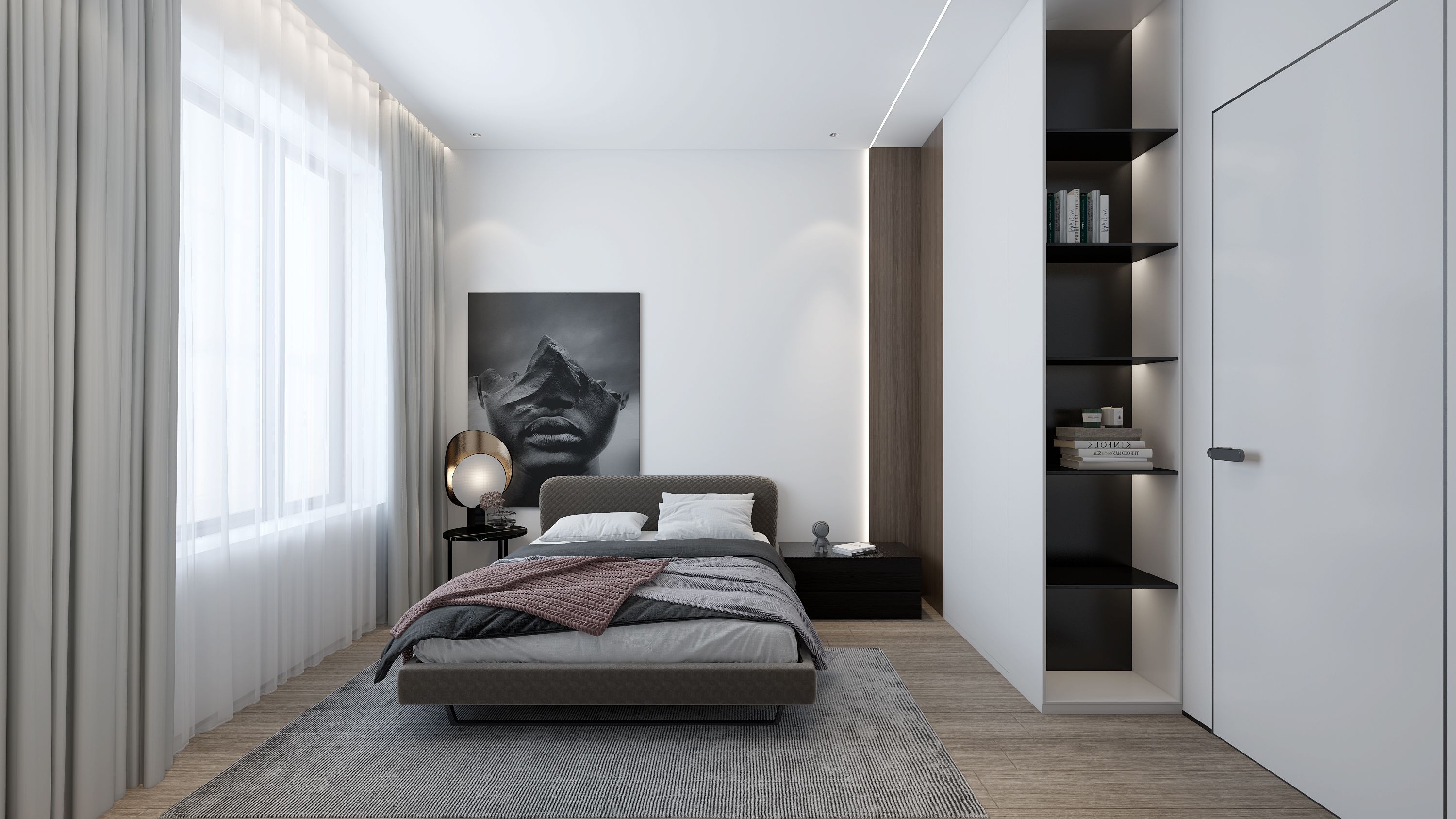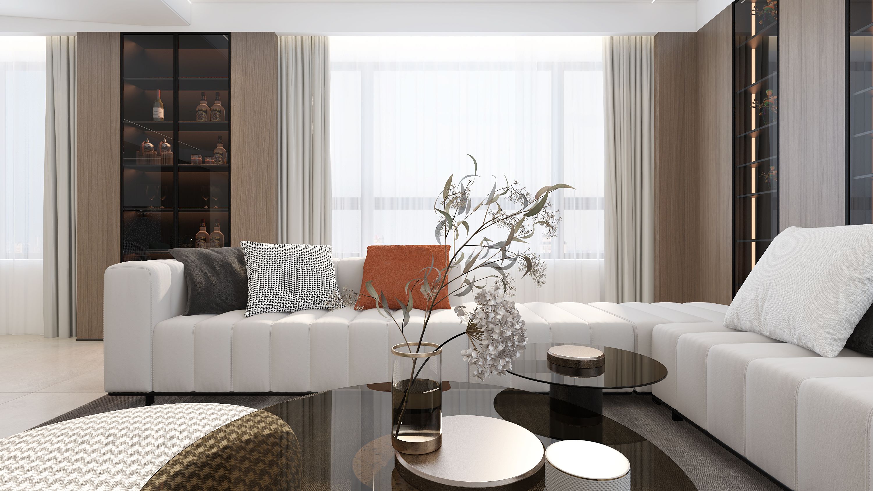 空间布局:空间格局根据业主诉求对于房间要求多一些,男主人自己的卧房空间尽量要大,客厅宽敞厨房操作区最大化,有西厨兼早餐台功能等,把空间做合理整合,充分利用每一处尺度,保证功能储物的前提下把空间用到极致。