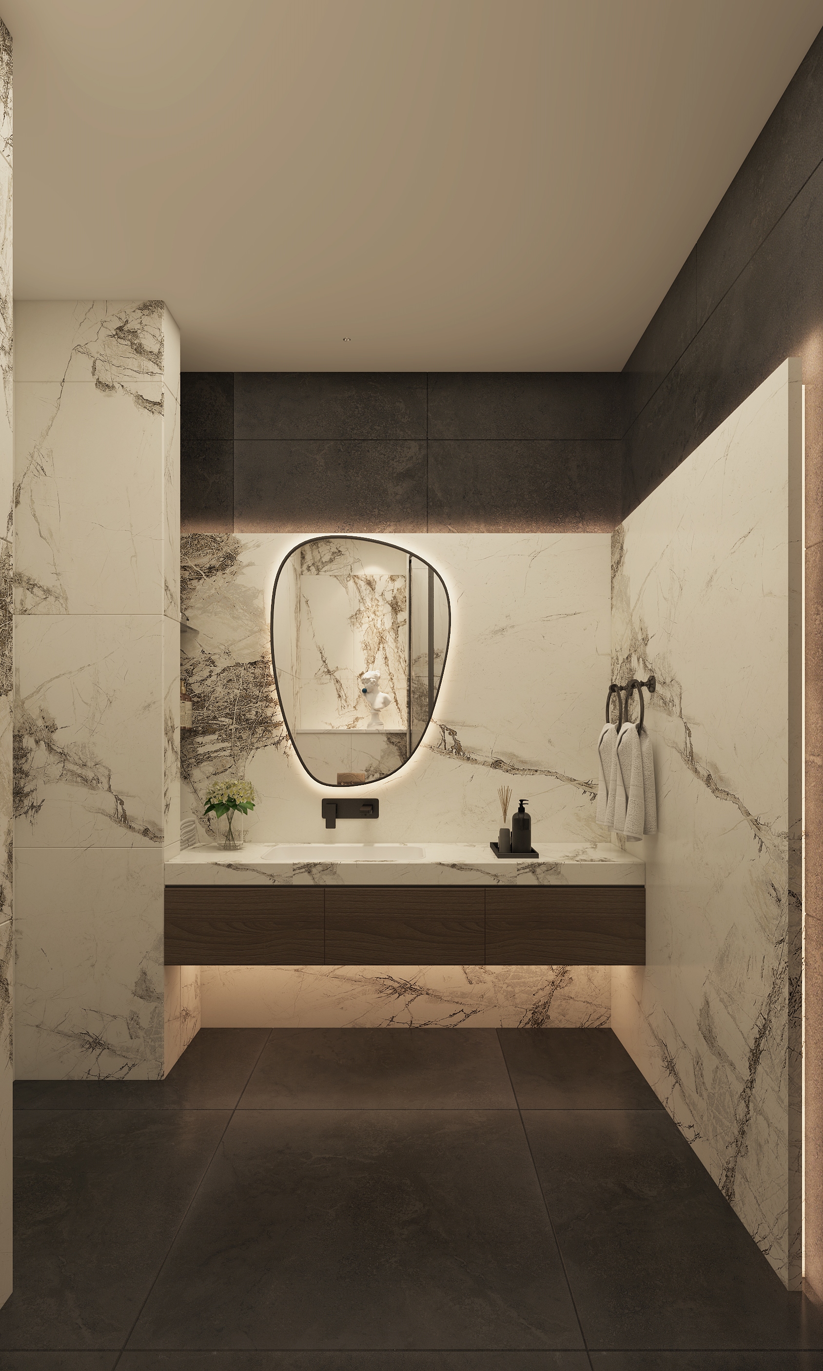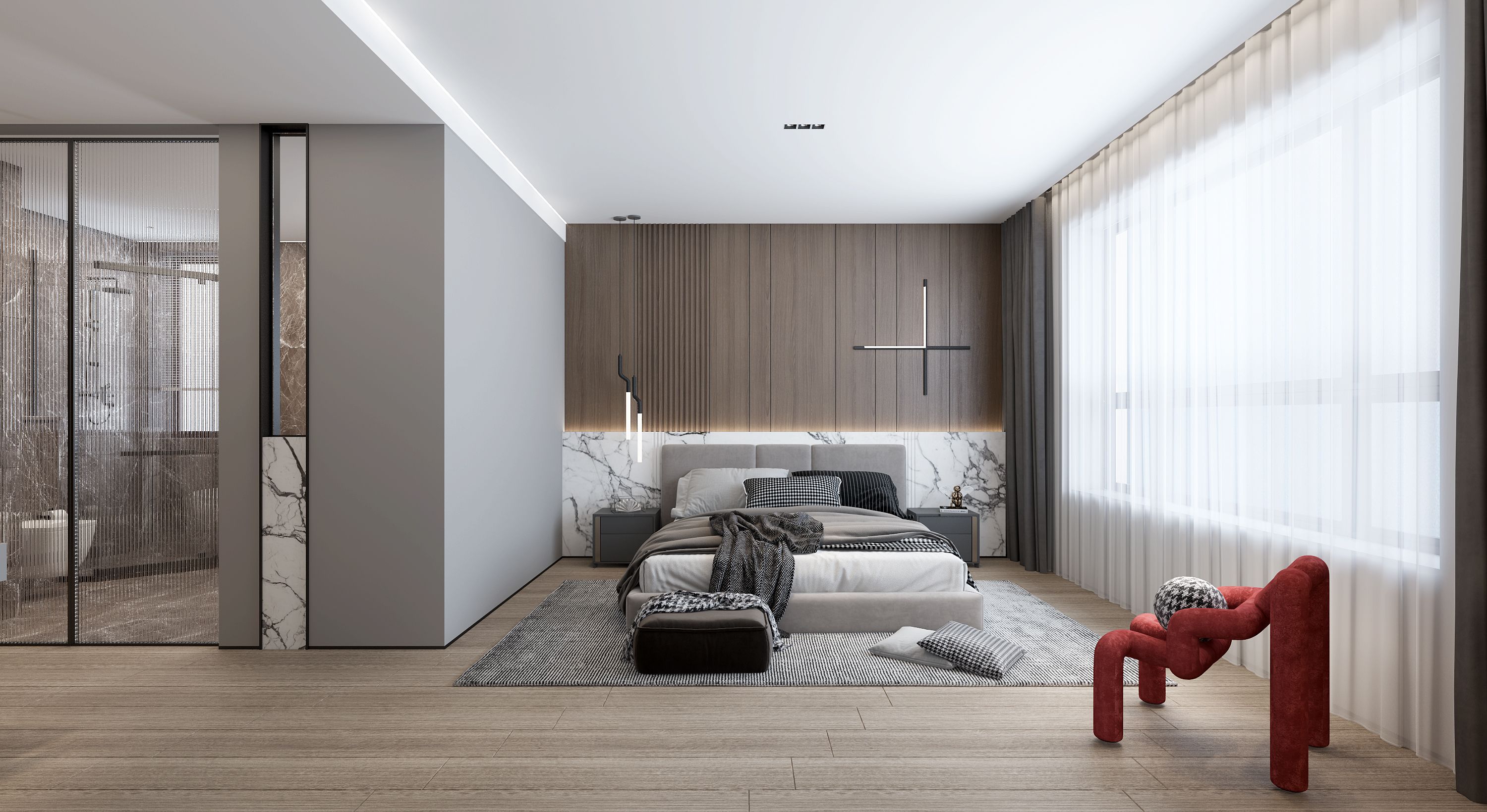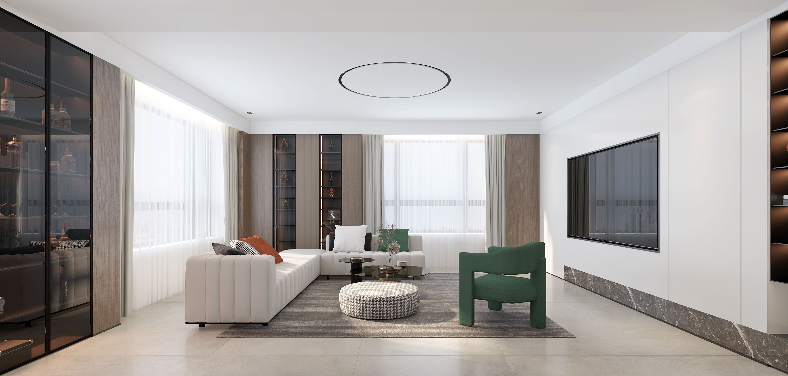 设计选材:选材以低碳环保为主,尽量减少喷漆板材的运用,大多以定制饰面板为主,石材使用以点缀为主,卫生间石材通过云选材提供的渠道为业主节省造价。
